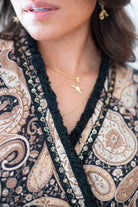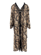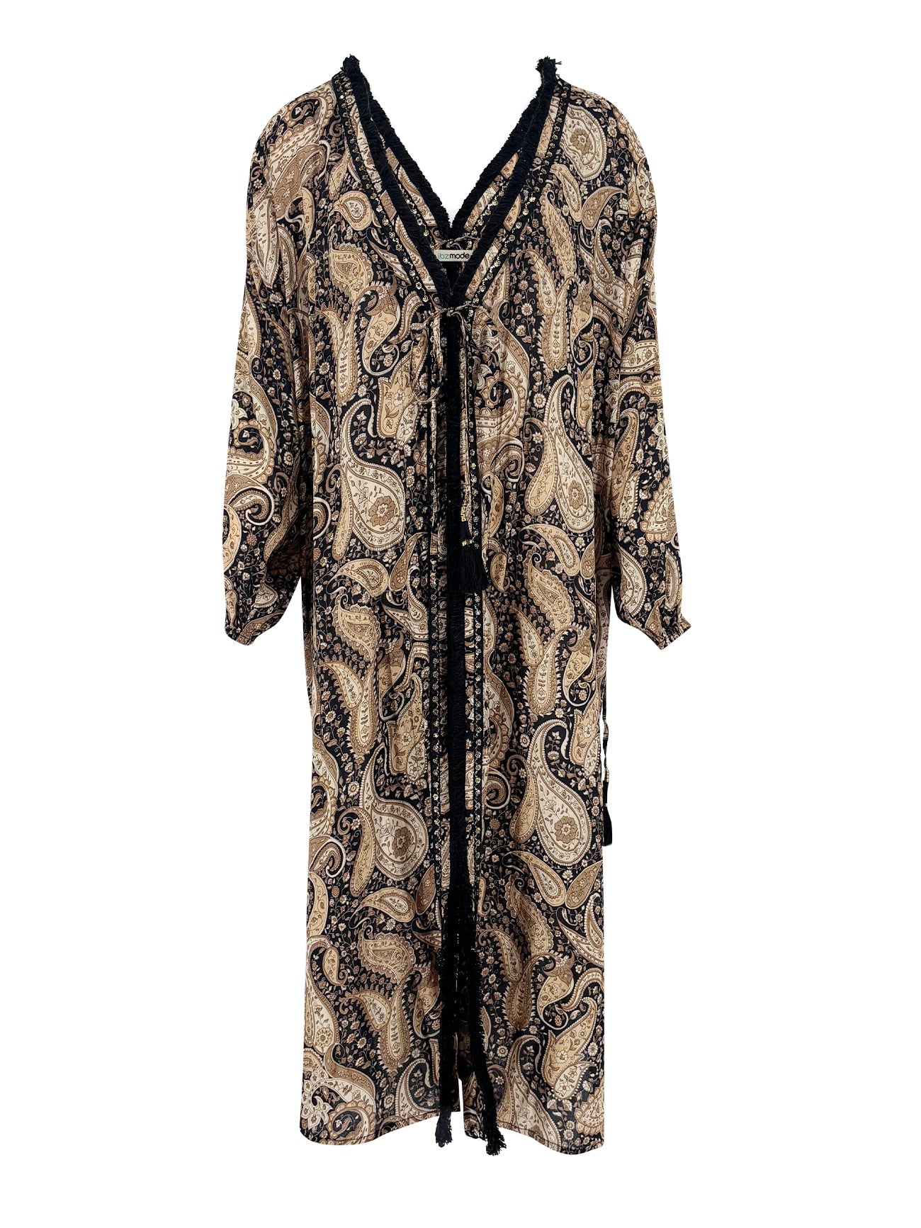 Product gegevens: Wikkeljurk met elastiek bij de mouwen en boho paisley print, is bij de randen bezet met franjes en decoratief band met lovertjes, heeft touwtjes met kwastjes