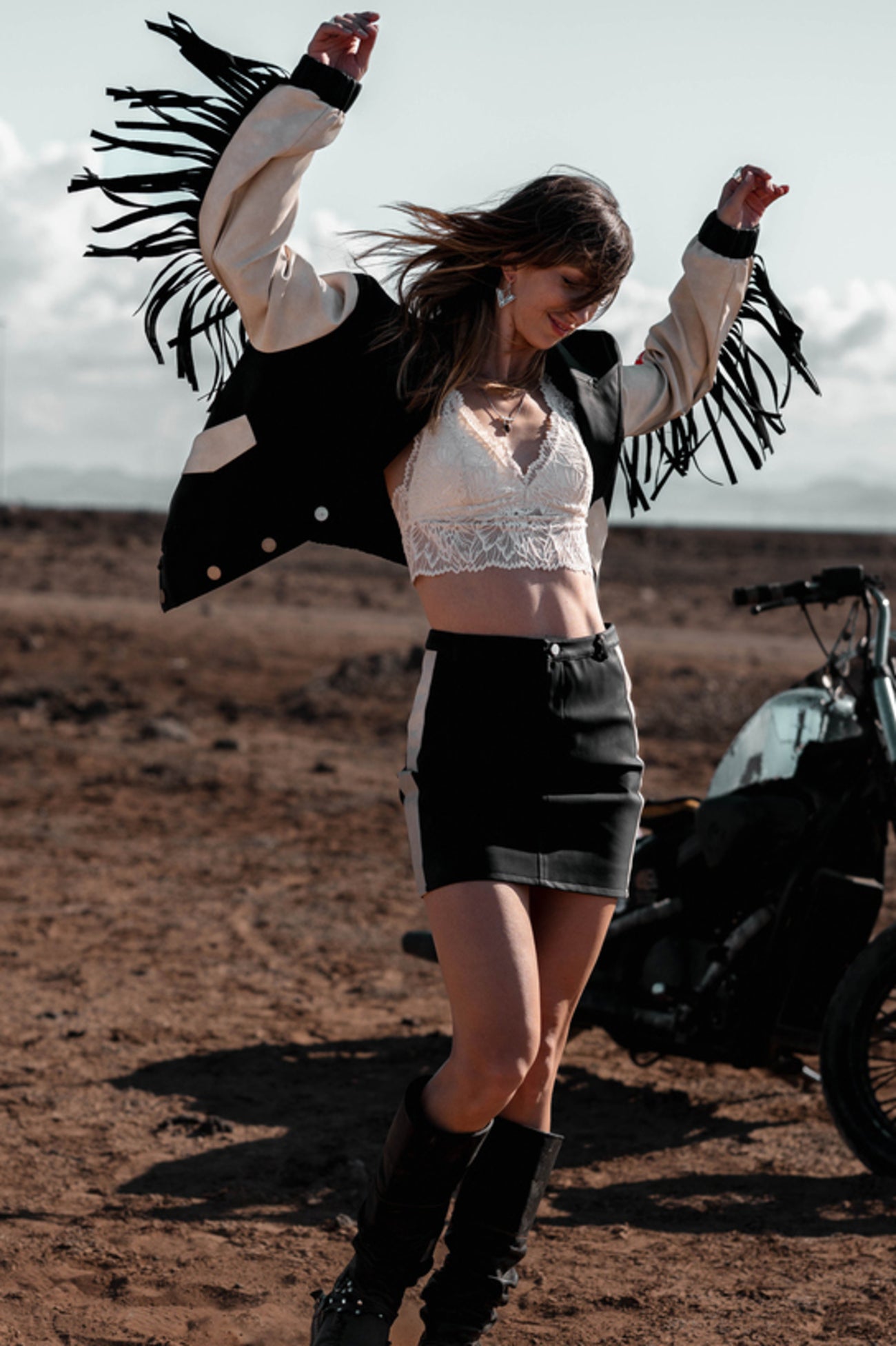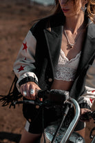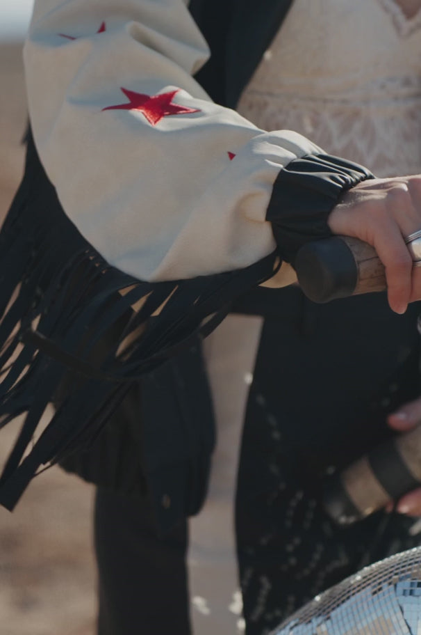 Product gegevens: Gemaakt van imitatie leer, een kleurblok design, logo op de achterzijde, sterren op de mouwen, franjes aan de achterzijde en langs de mouwen