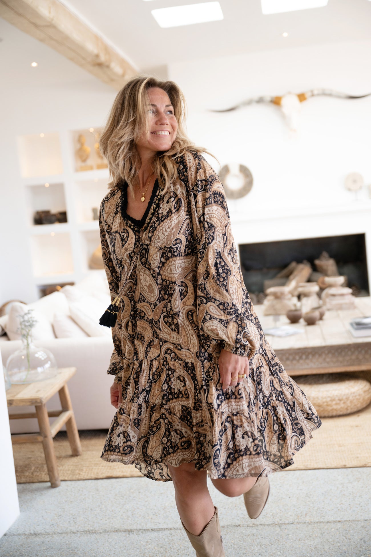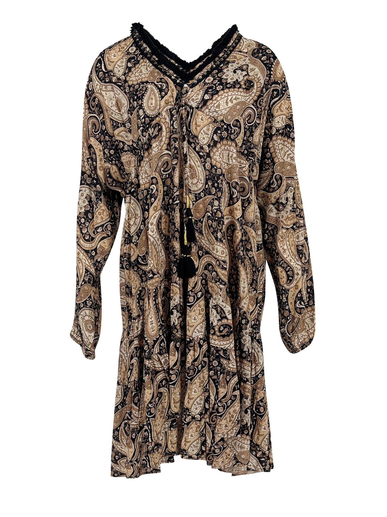 Product gegevens: Tuniek met boho paisley print, heeft een V-hals, bezet met franjes en decoratief band met lovertjes, elastiek bij de polsen en kan in de taille naar wens gestrikt worden, heeft touwtjes met kwastjes en muntjes