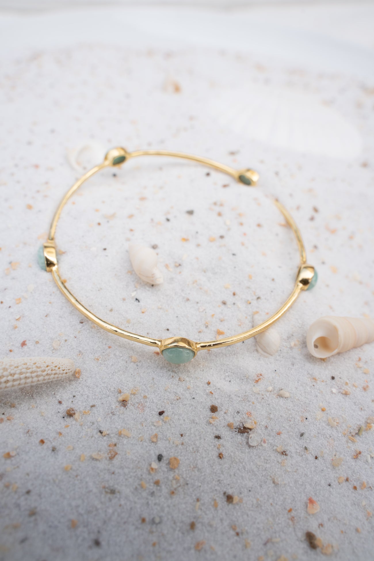 Product gegevens: Messing met een laagje echt goud (18K) met echte natuurstenen dots van turquoise Amazoniet. De armband wordt geleverd in een mooie geschenk verpakking