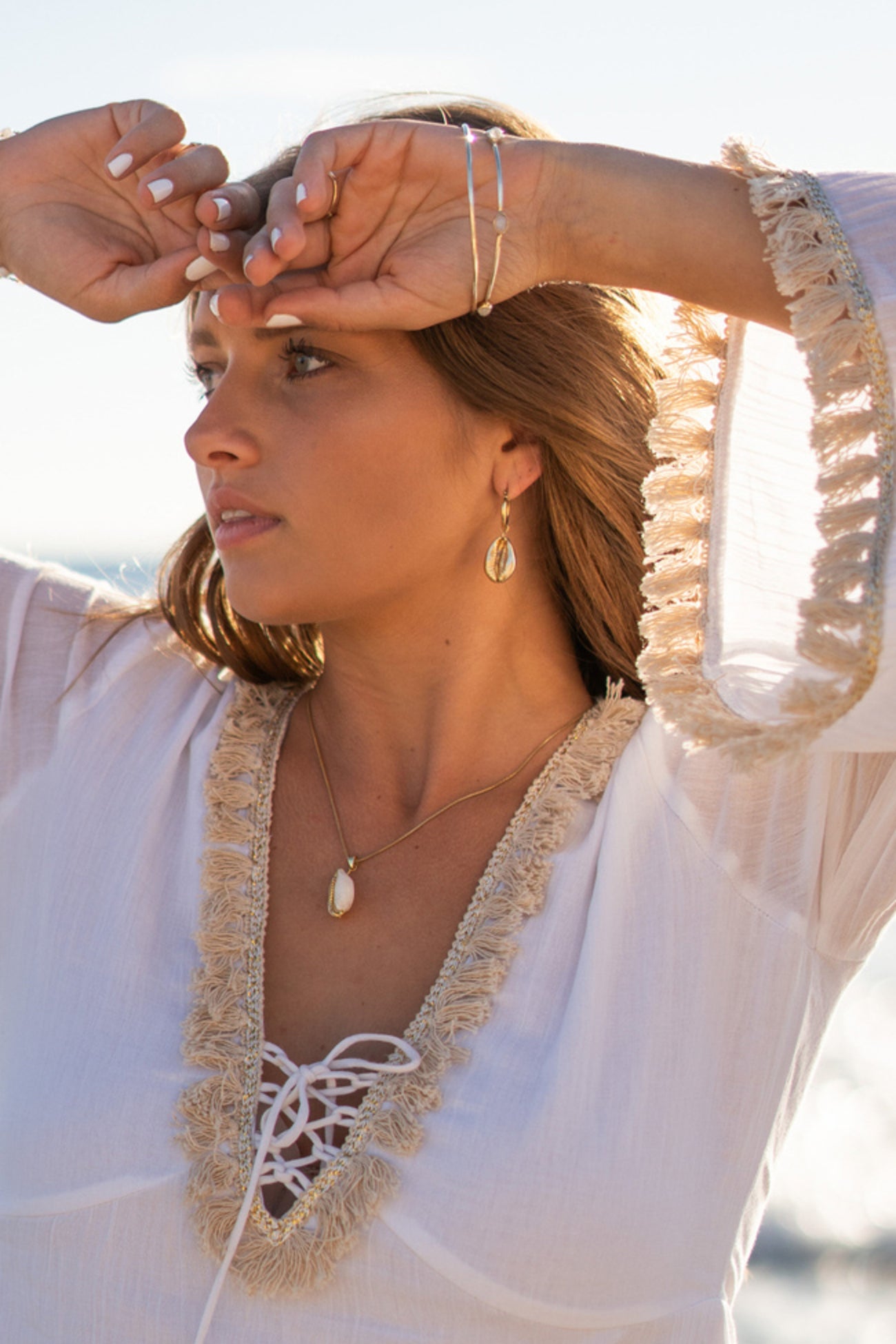 Dit sieraad heeft een stevige basis van messing en is afgewerkt met een laagje echt goud. De combinatie zorgt voor een warme glans en een luxe uitstraling. Draag met zorg – vermijd water, parfum en schoonmaakmiddelen – dan blijft je sieraad lang mooi.