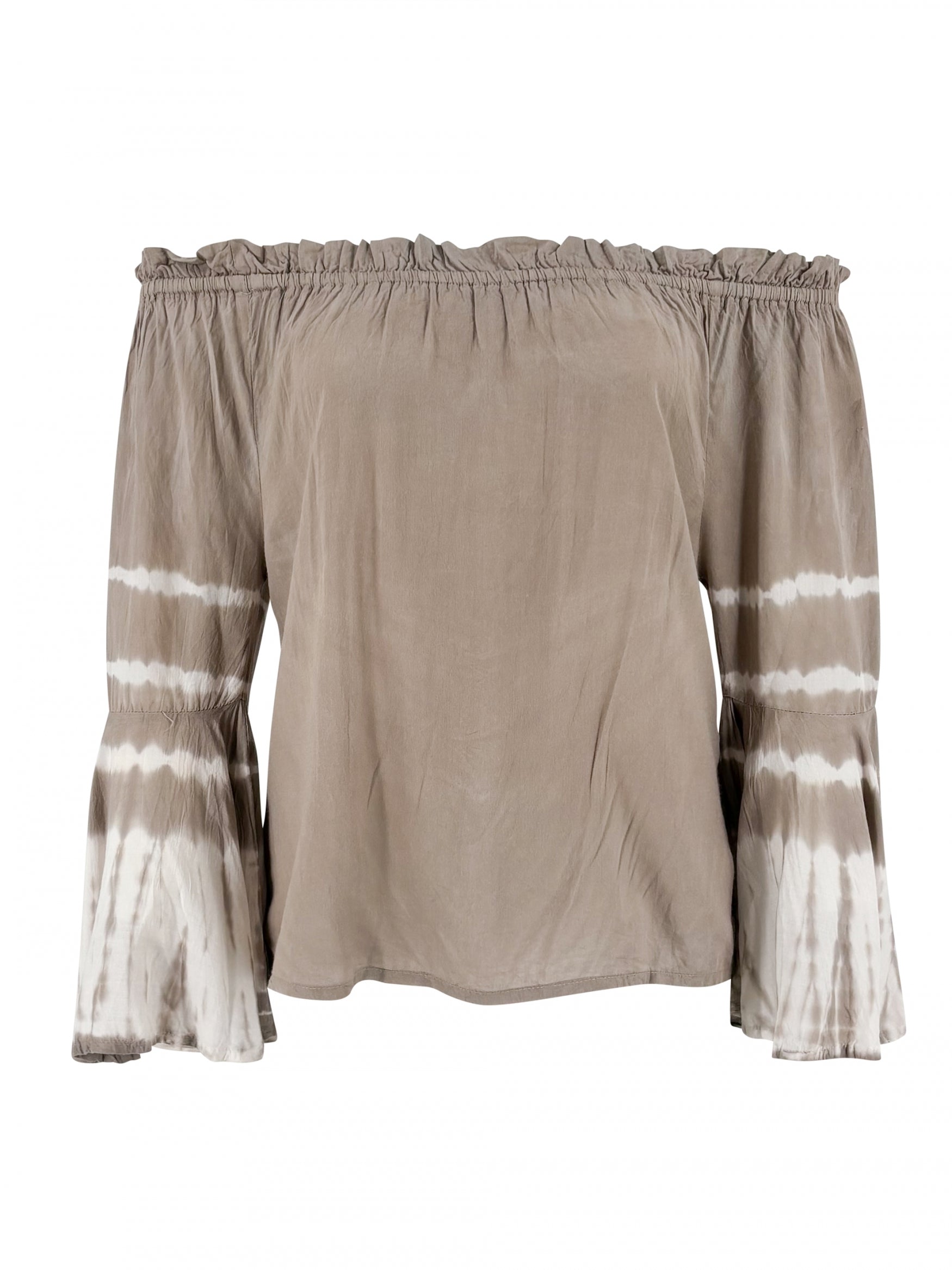 Product gegevens: Off shoulder model, Trompetmouwen, tie dye print, op de mouwen bezet met schelpjes