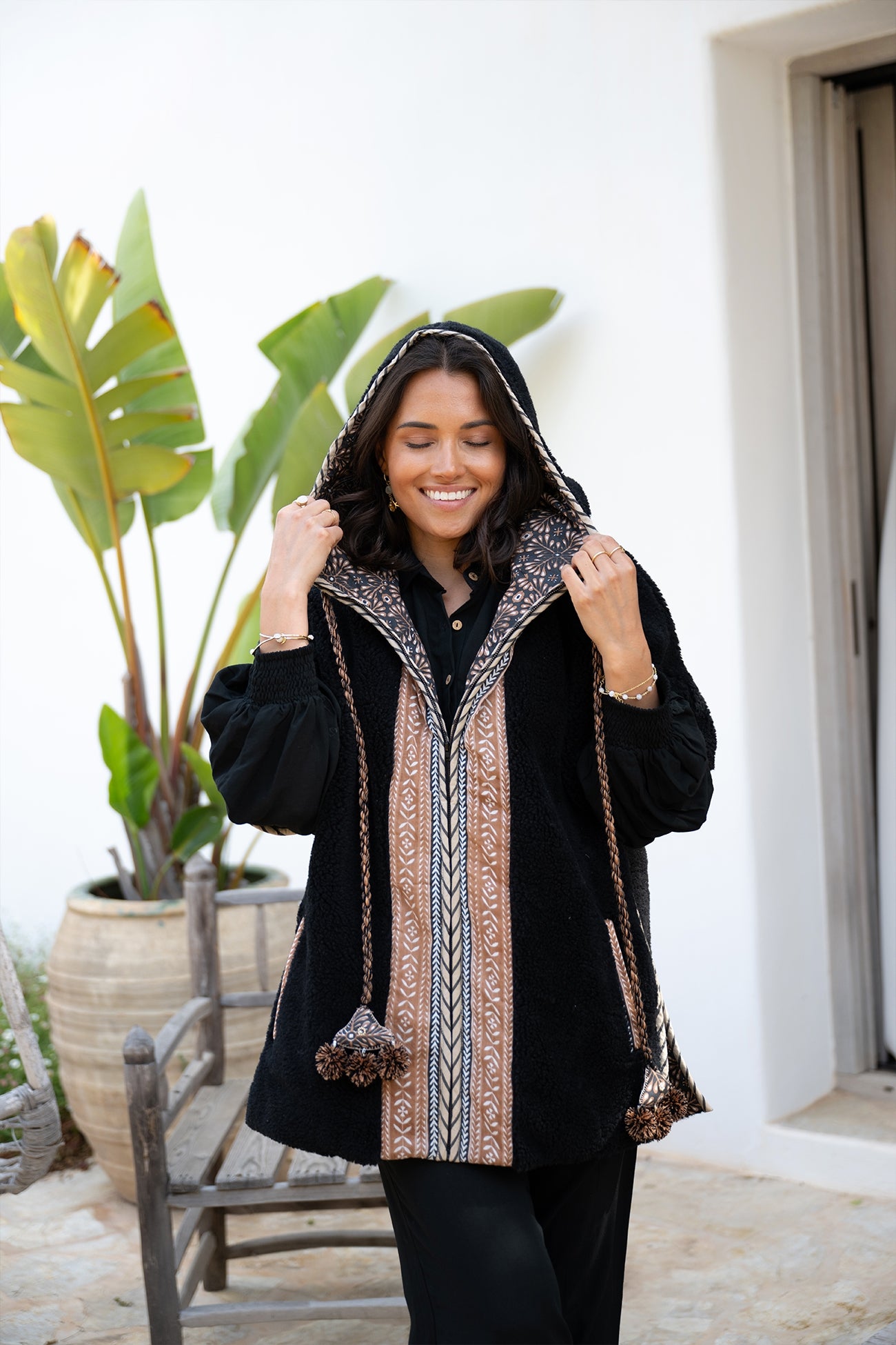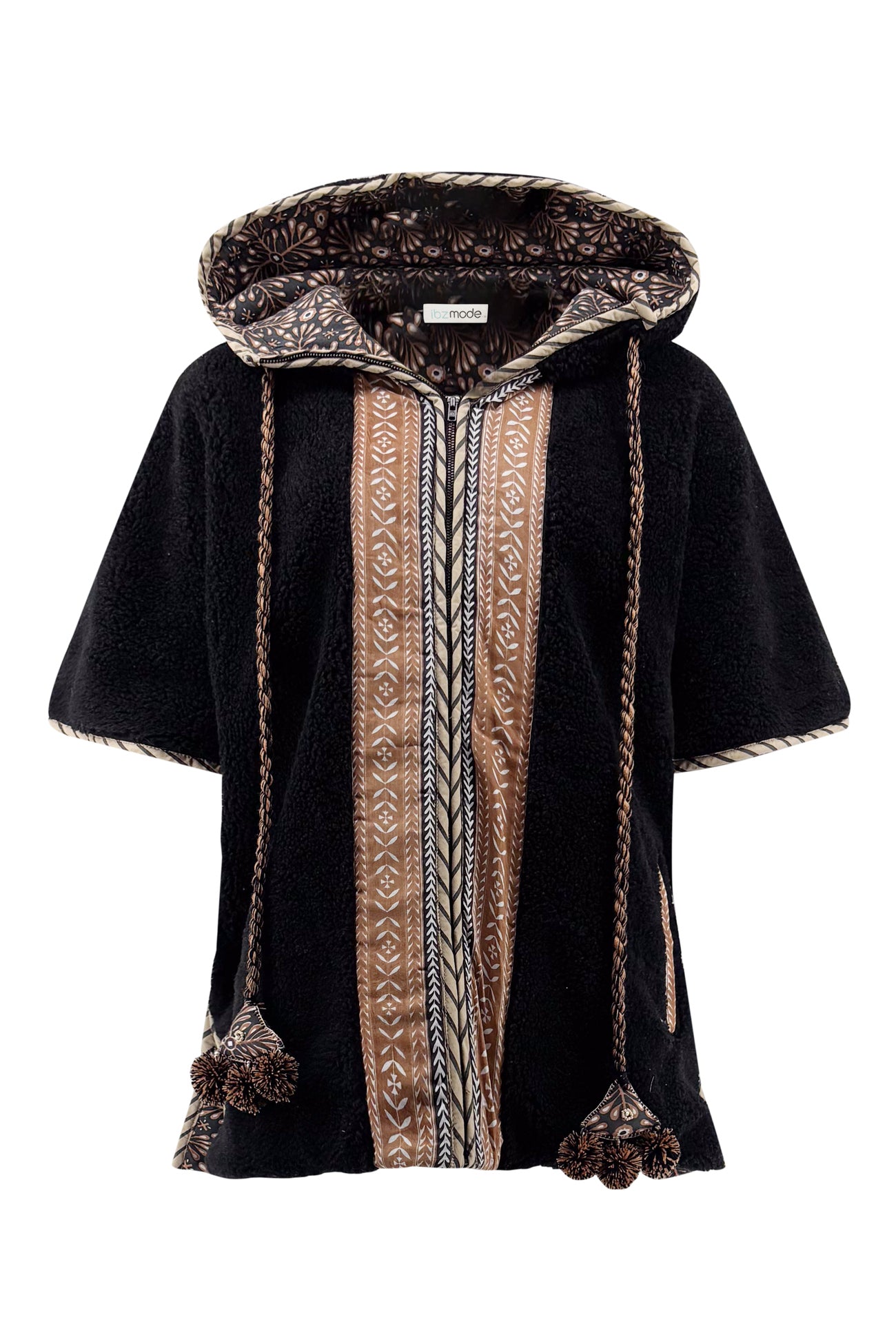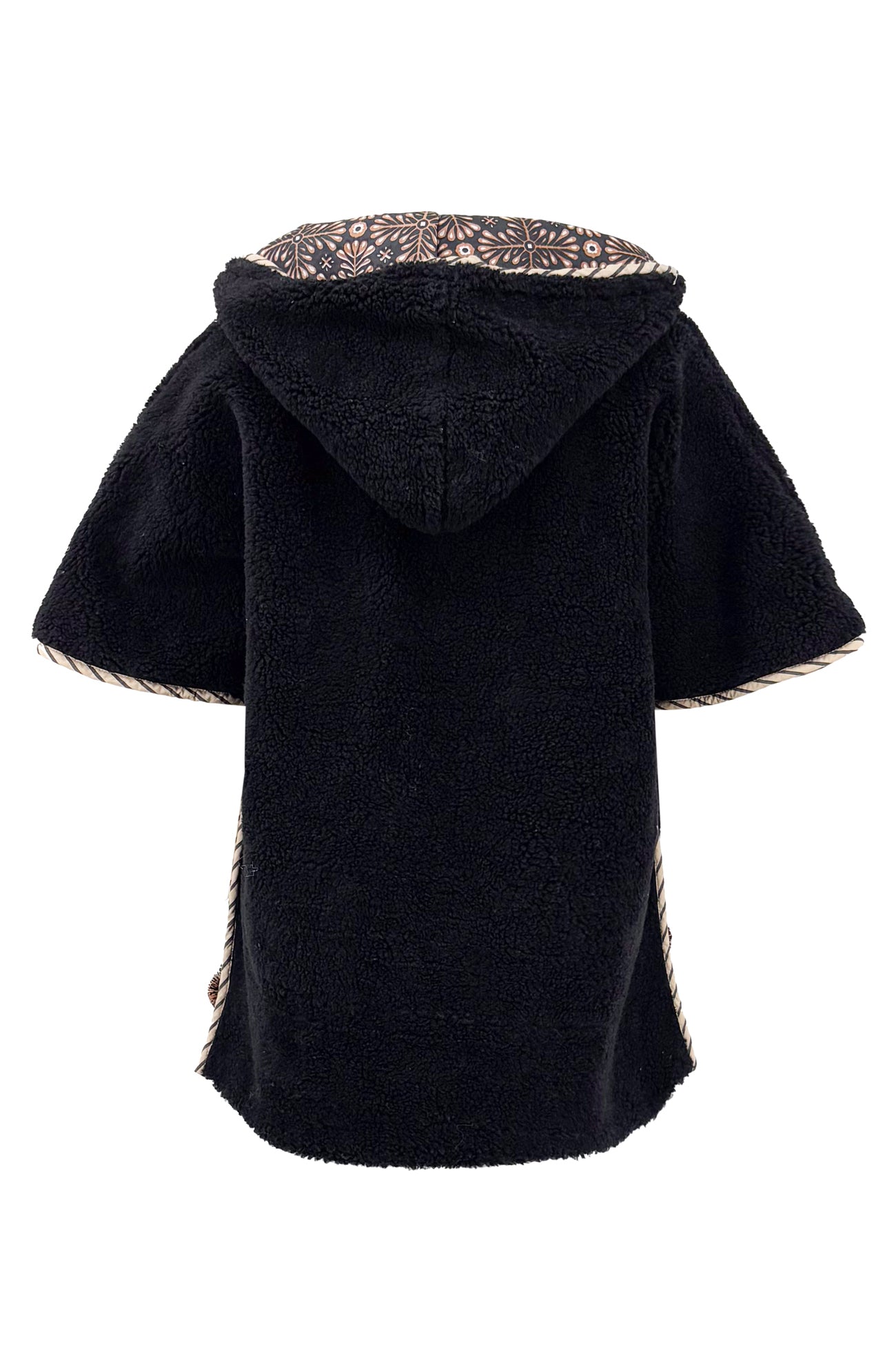 Product gegevens: Omkeerbare jas met korte mouwen en capuchon. Ene kant van de jas is teddy stof, de andere kant een print. Met ritssluiting