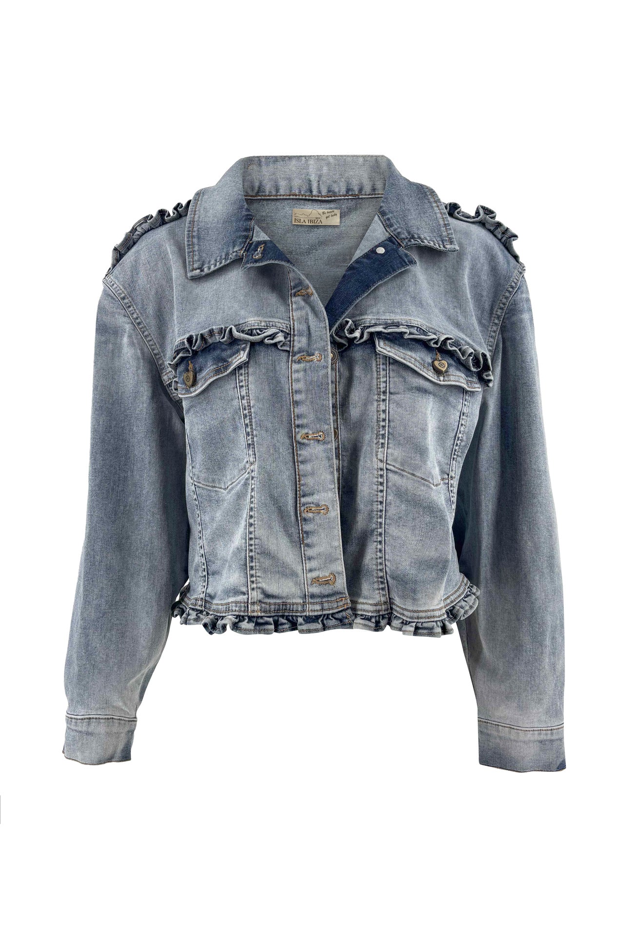 Combineer dit dames denim jacket blauw met een witte kanten blouse voor een zachte Ibiza look. Of draag het over een print jurk of rok voor meer contrast. Binnen Isla Ibiza draait alles om mix & match, en dit jasje maakt elke outfit compleet.