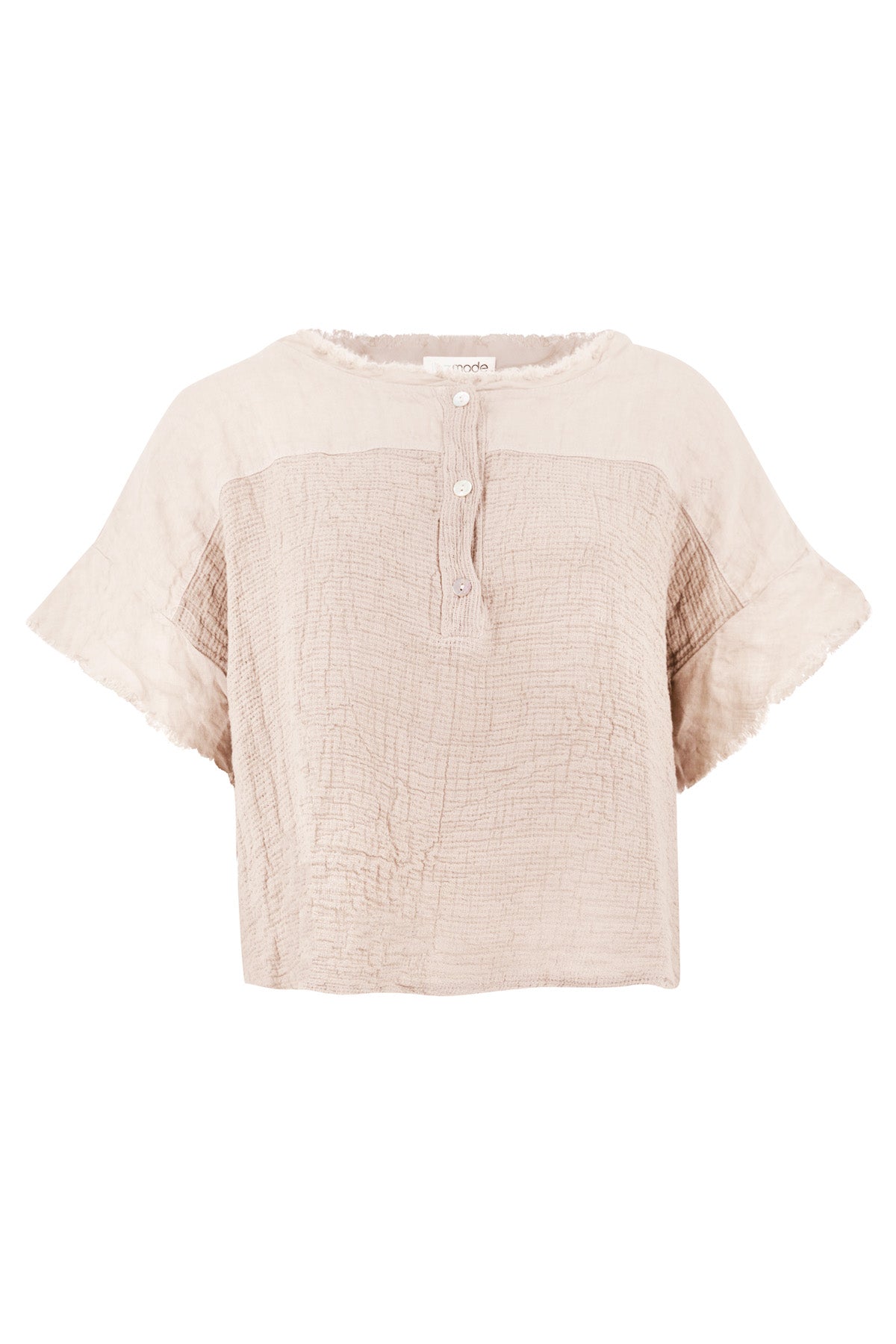 Product gegevens: Top met korte mouw, rafeltjes langs de mouwen, knoopsluiting, gemaakt van twee soorten stof, gedeeltelijk licht doorschijnend. LET OP: het betreft de licht roze top van de productfoto!
