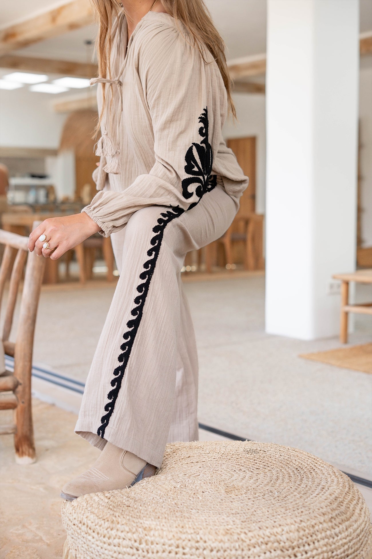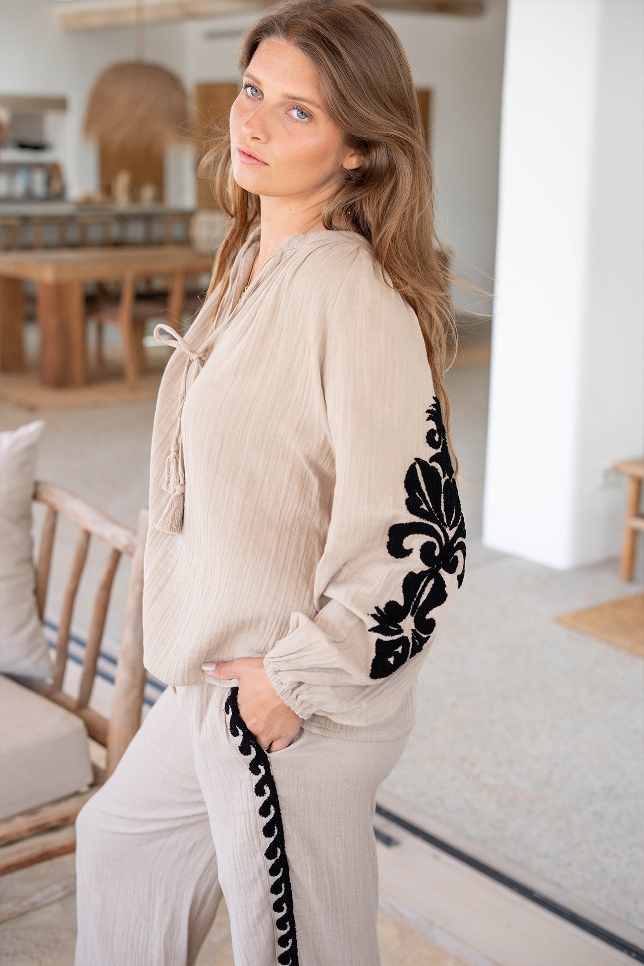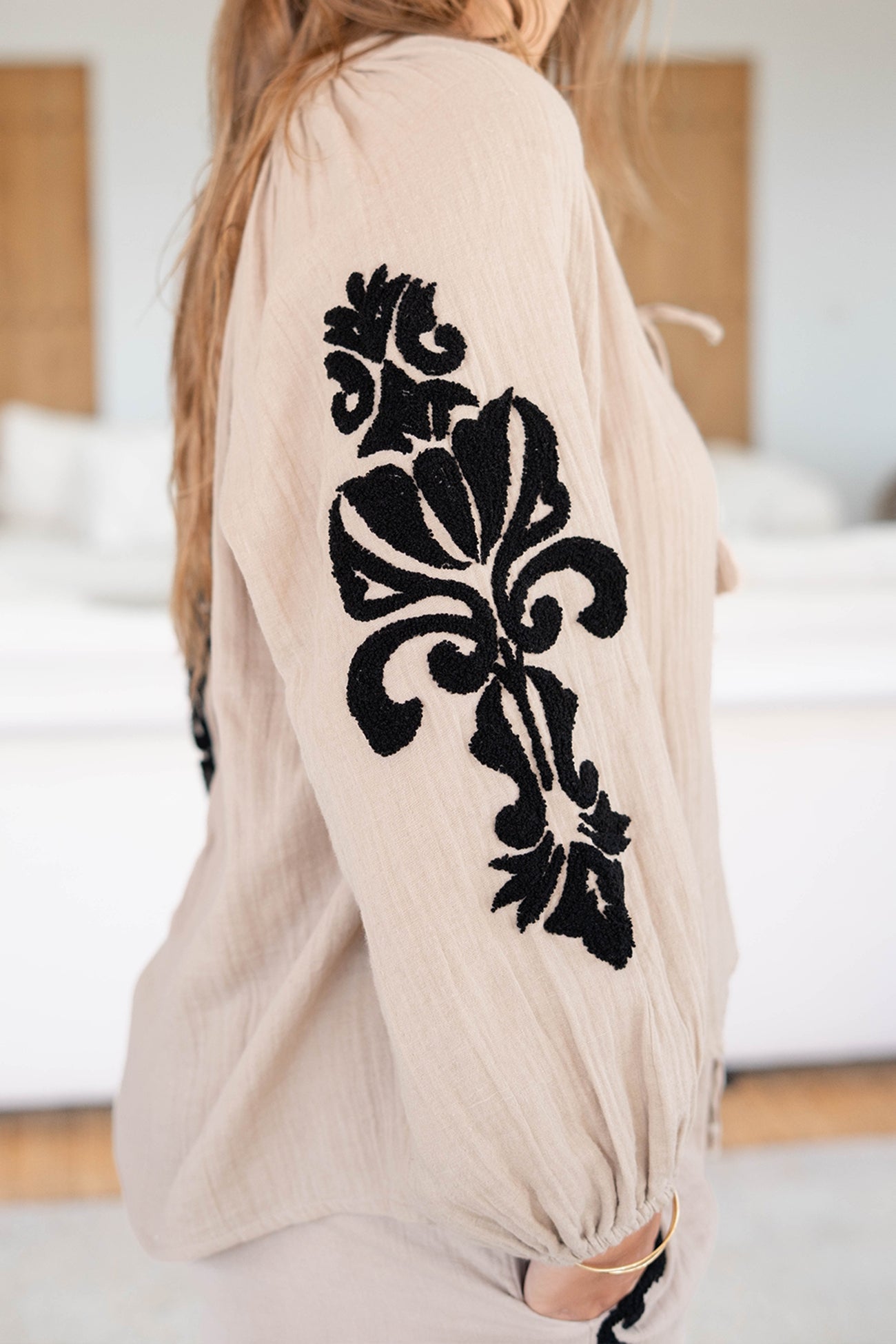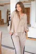 Product gegevens: Blouse met ronde hals met inkeping, kan gestrikt worden met de touwtjes waar kwastjes aanhangen, badstof aplicatie op de armen, elastiek bij de polsen