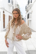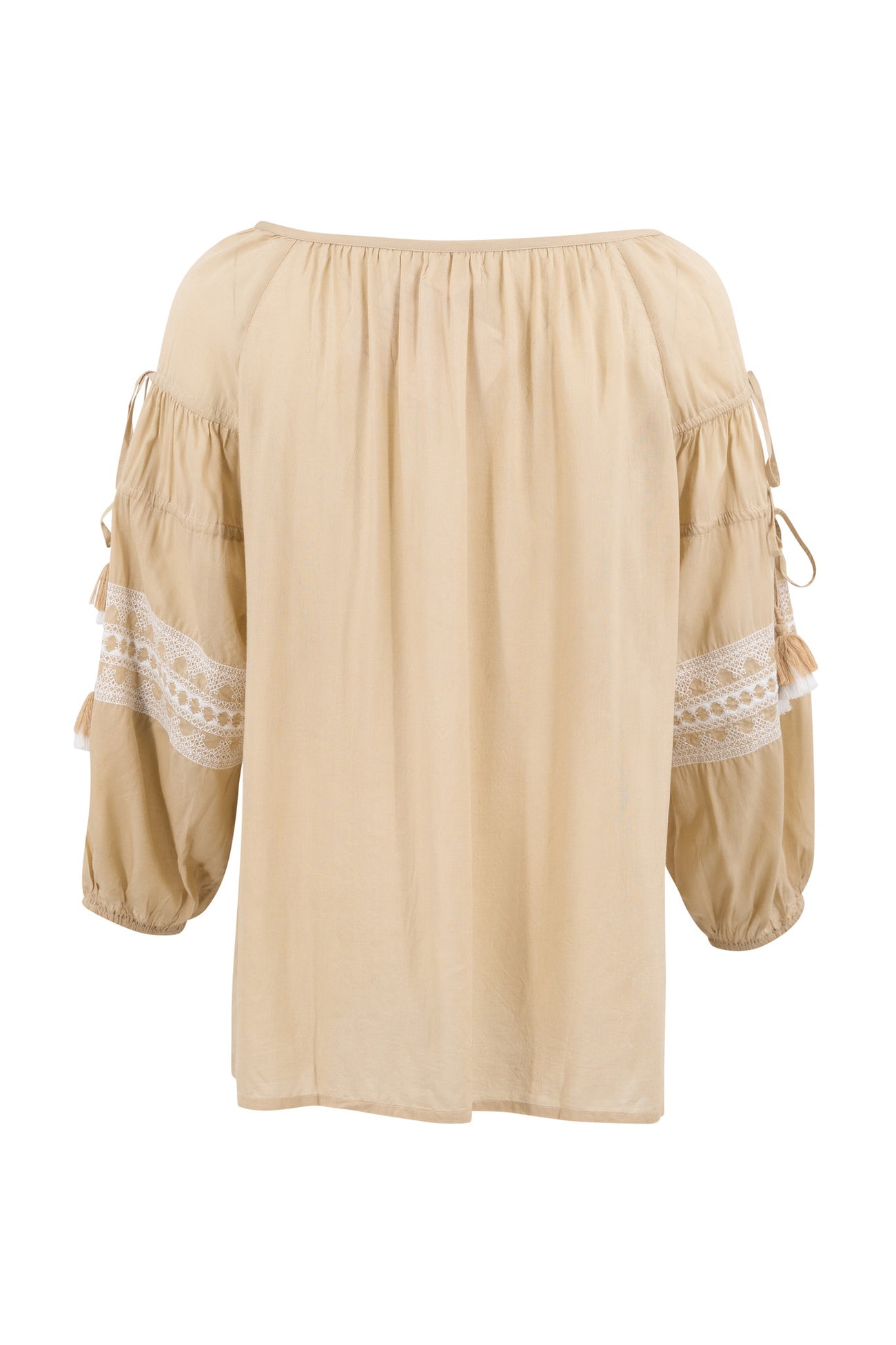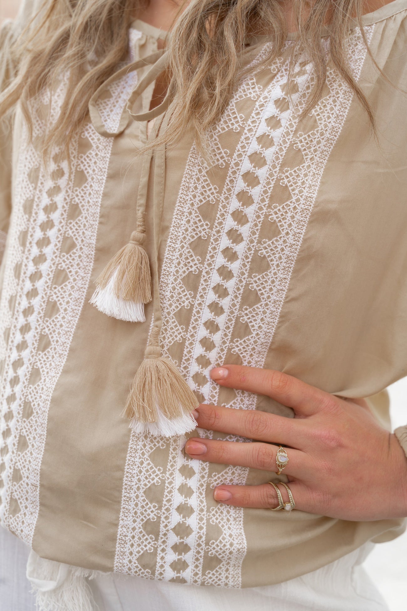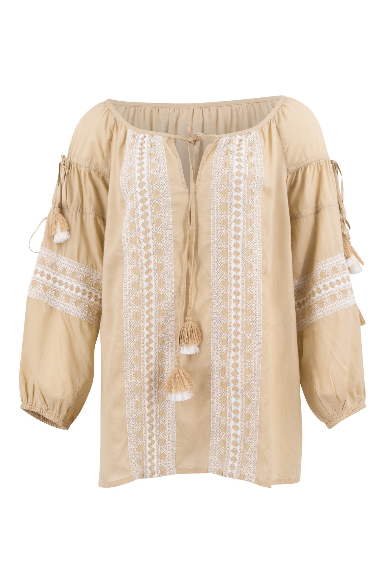Op zoek naar een item met bohemian flair? Dan is de Blouse Tassel Beige van ibzmode jouw match. Shop nu bij ibizamode en straal deze zomer in stijl.