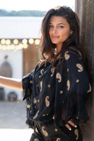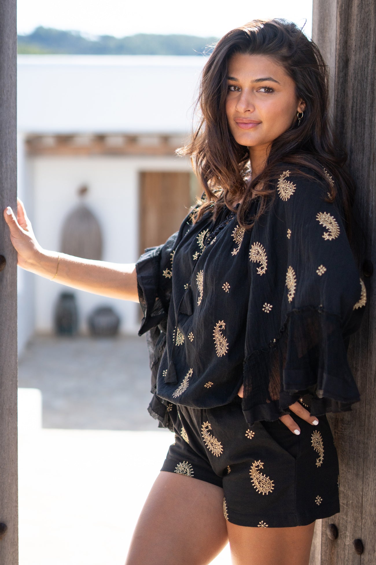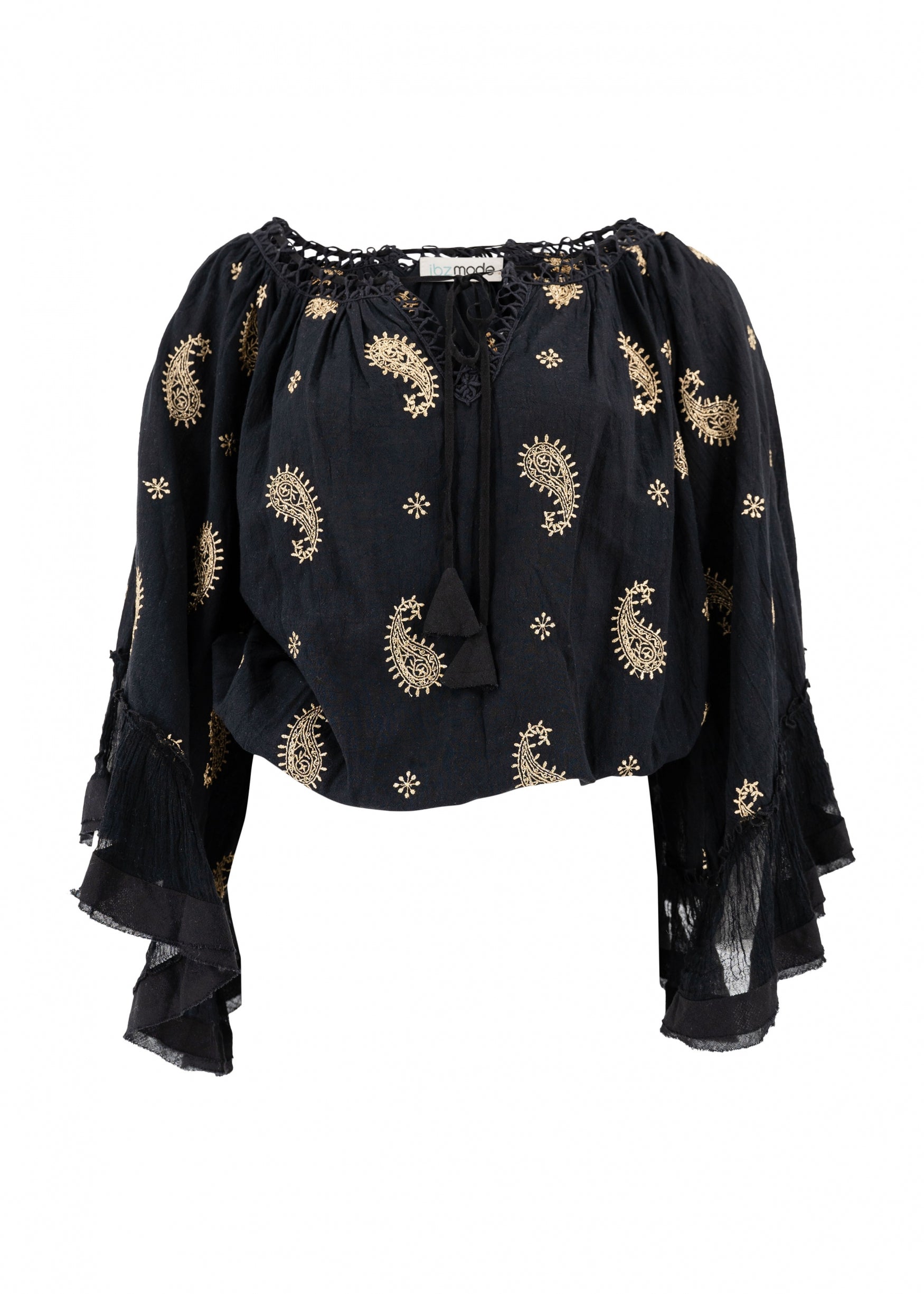 Deze Blouse Yira Esencia Black van ibzmode in het black ademt Ibiza vibes. Heeft een ronde hals die gestrikt kan worden, heeft trompet mouwen, gouden geborduurde details Gemaakt van 100% katoen, licht en comfortabel voor warme dagen. Bestel snel en geniet van de bohemian lifestyle, elke dag opnieuw.