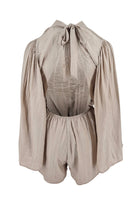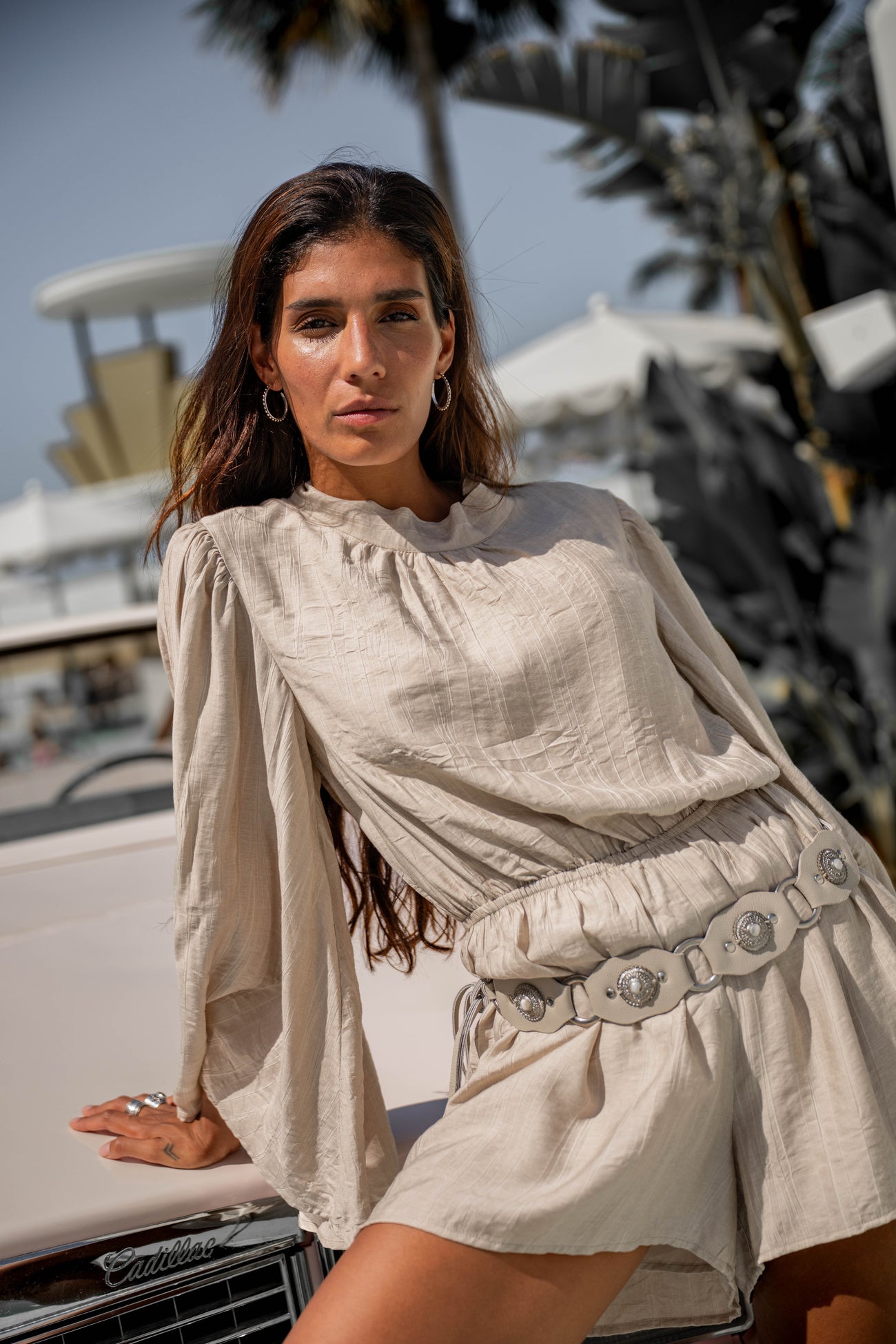 De Ellis Playsuit sand heeft lange mouwen en een elegante halslijn. De taille is elastisch en creëert een mooi silhouet. De open rug met strikdetail voegt een subtiel maar krachtig accent toe. De korte lengte zorgt voor een speelse balans.