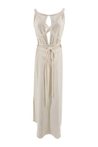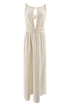 De Romy Maxi Dress off white heeft een elegante halslijn met gevlochten accenten. De open details aan de voorzijde zorgen voor een subtiele maar krachtige uitstraling. De taille wordt benadrukt door een gevlochten band die het silhouet mooi definieert.