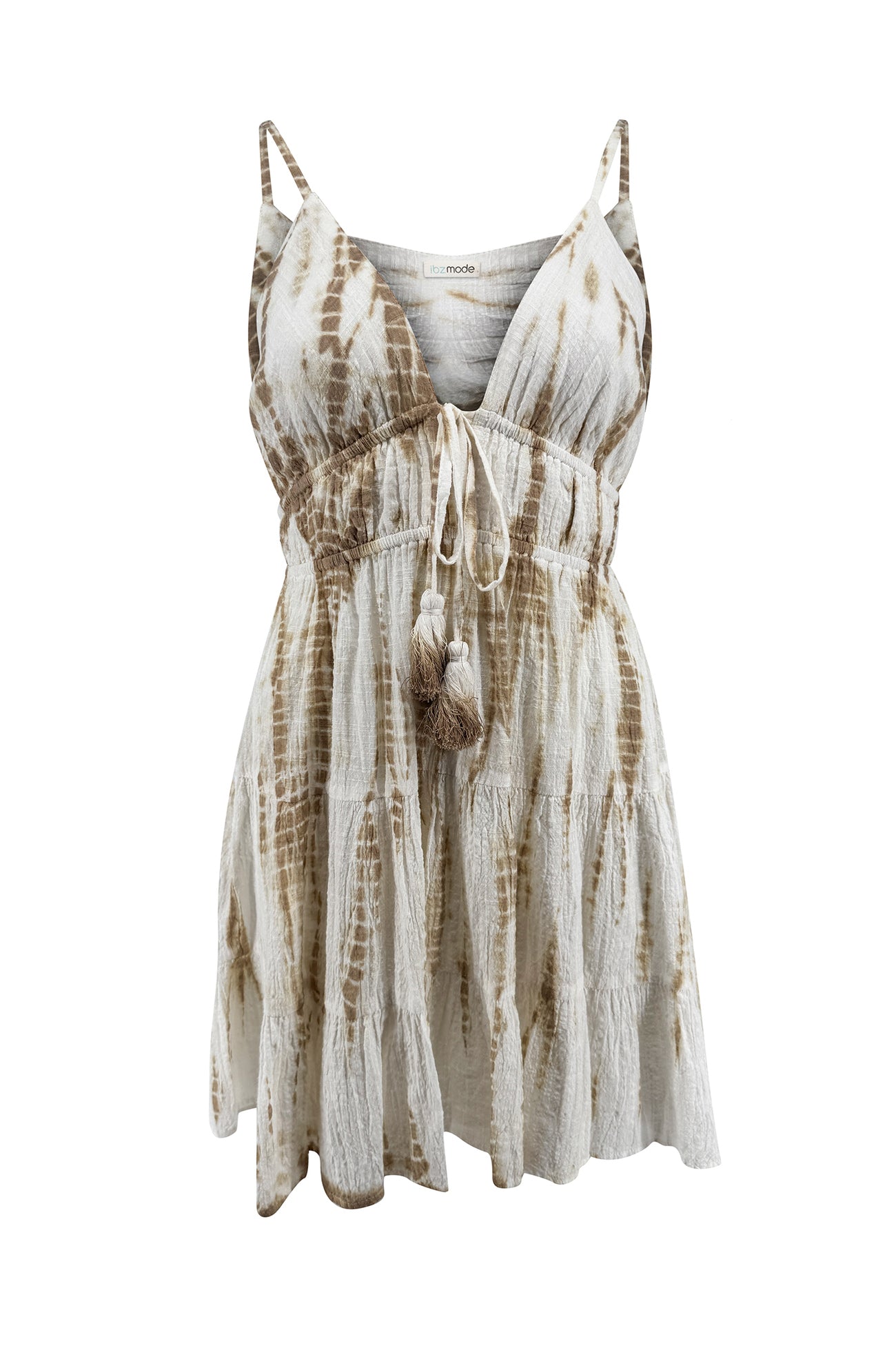 De Short Dress Camila Sera is onderdeel van de Sand Stories collectie. Deze tie dye jurk is ontworpen voor ontspannen zomerdagen met een luxe resortgevoel. De combinatie van zacht taupe en fris ivory zorgt voor een rustige uitstraling. Daardoor voelt deze jurk direct licht, natuurlijk en vrouwelijk aan.