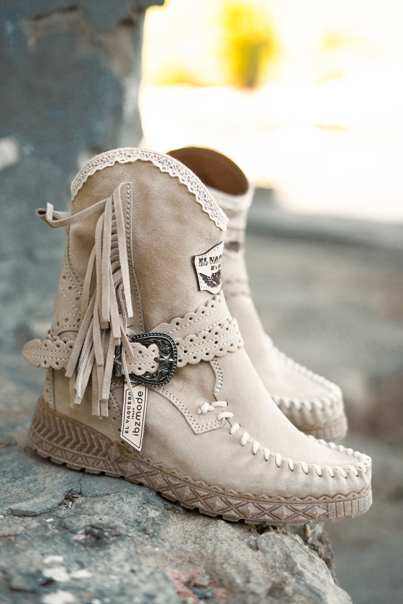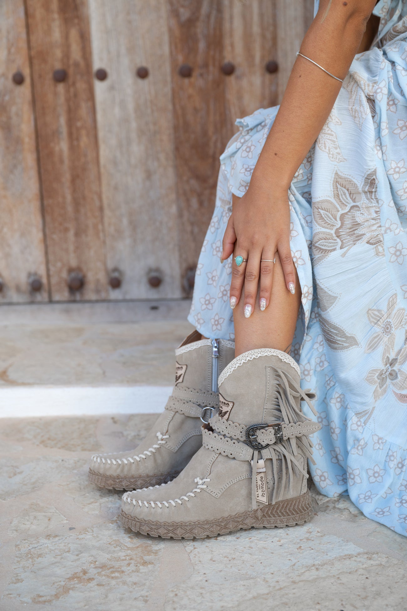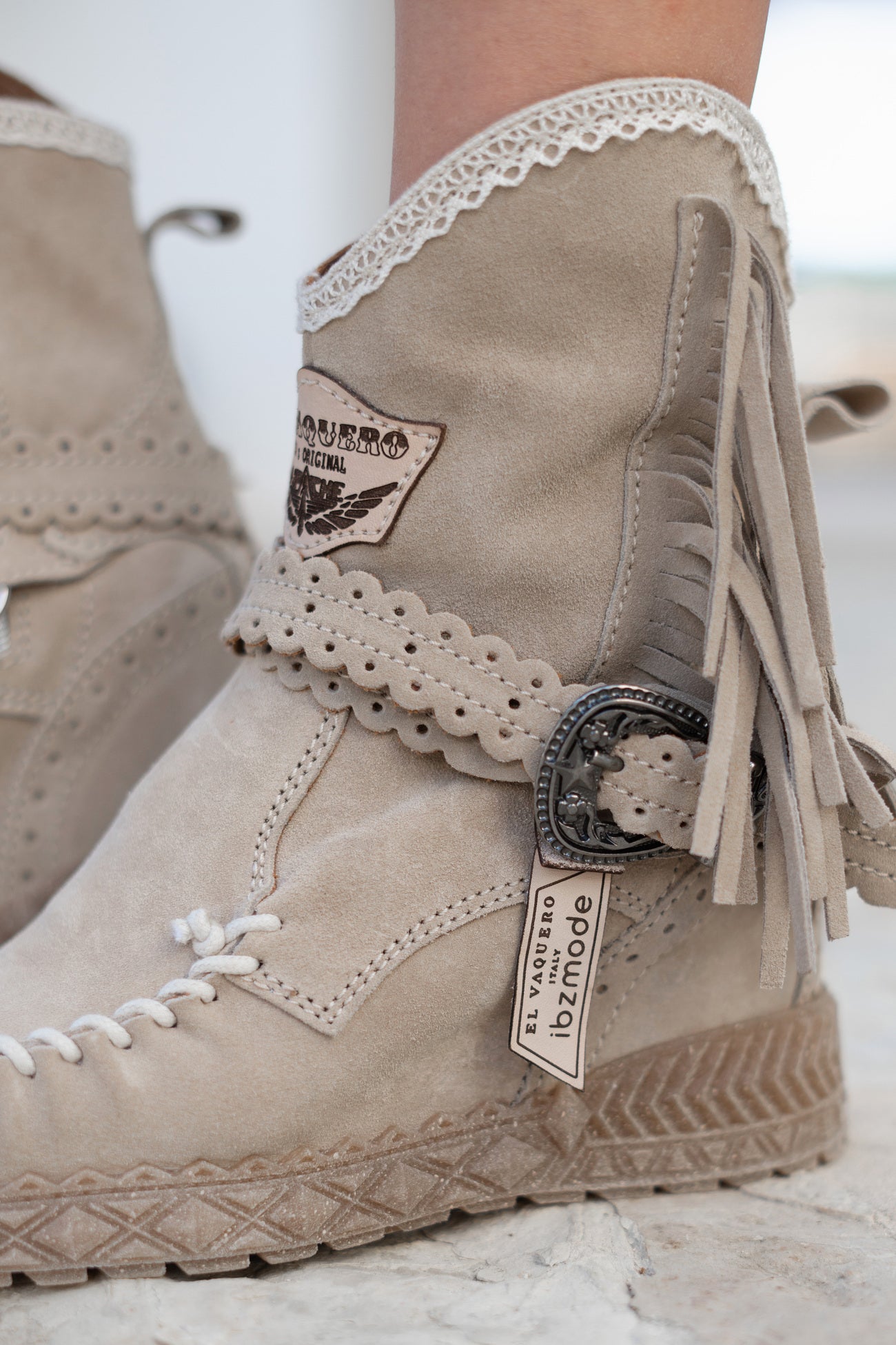 Deze El Vaquero x ibzmode Queenie Taupe van ibzmode in het taupe ademt Ibiza vibes. Handgemaakte laarzen van suède, hebben 2 logo's, riempjes met gesp, neus loopt in een lichte punt en Voeg deze must-have toe aan je zomergarderobe.