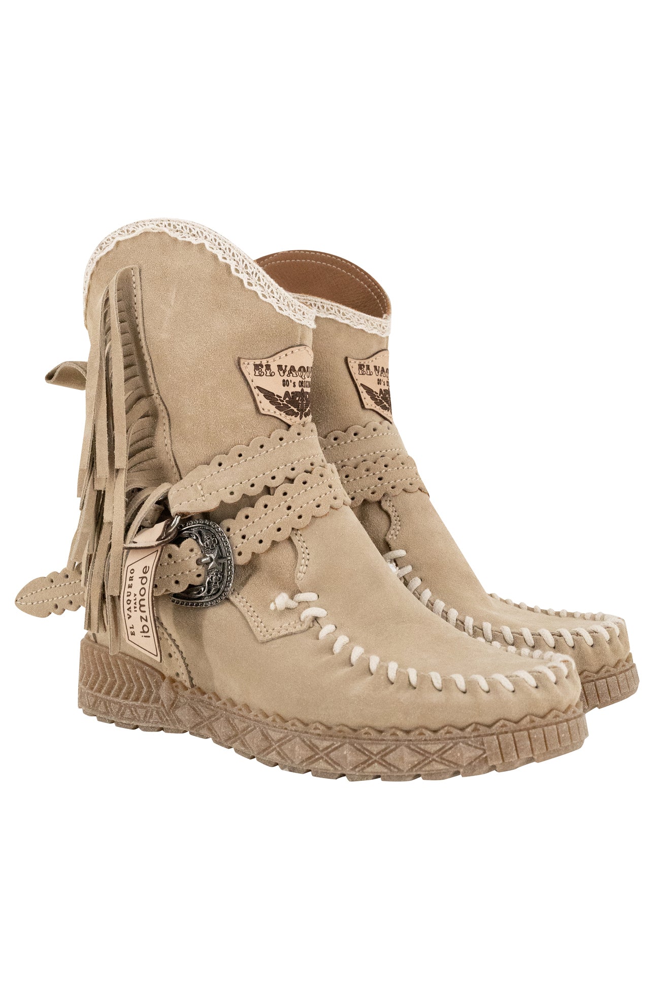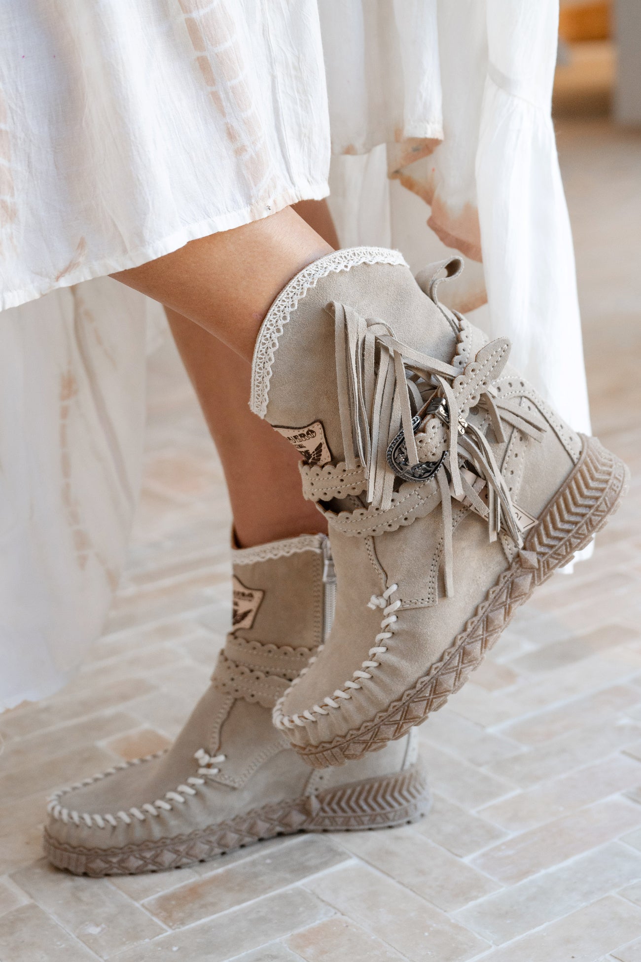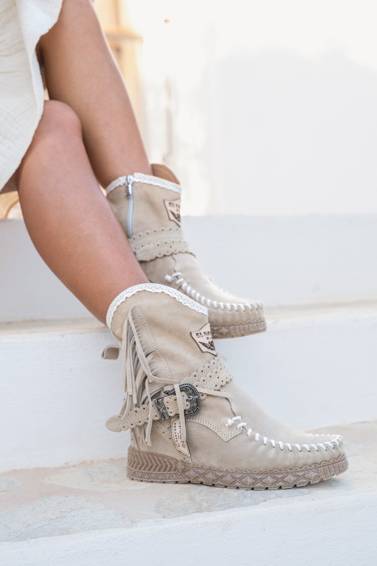 Deze El Vaquero x ibzmode Queenie Taupe van ibzmode in het taupe ademt Ibiza vibes. Handgemaakte laarzen van suède, hebben 2 logo's, riempjes met gesp, neus loopt in een lichte punt en Voeg deze must-have toe aan je zomergarderobe.
