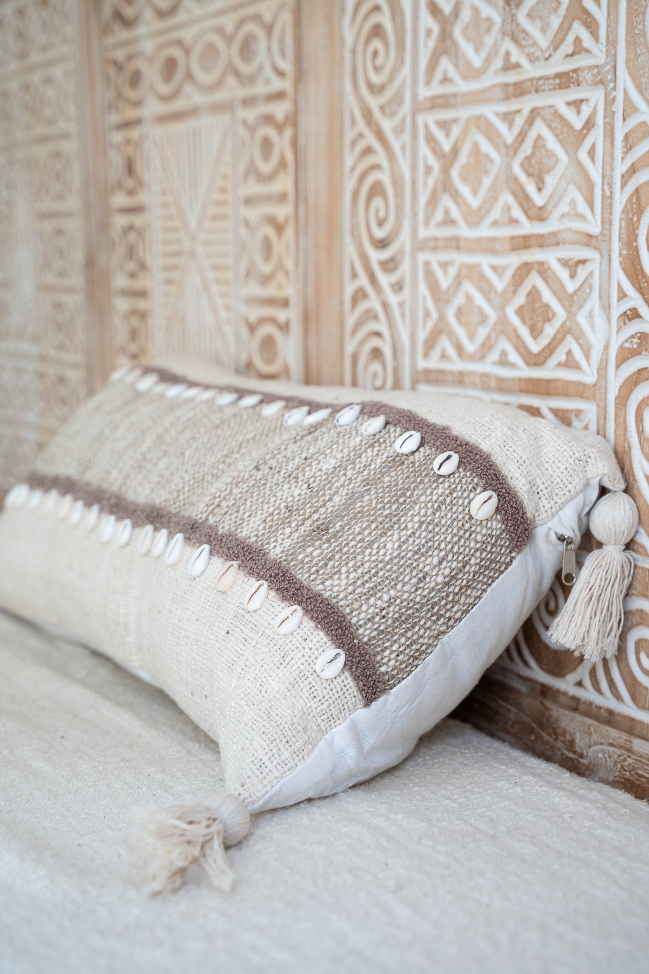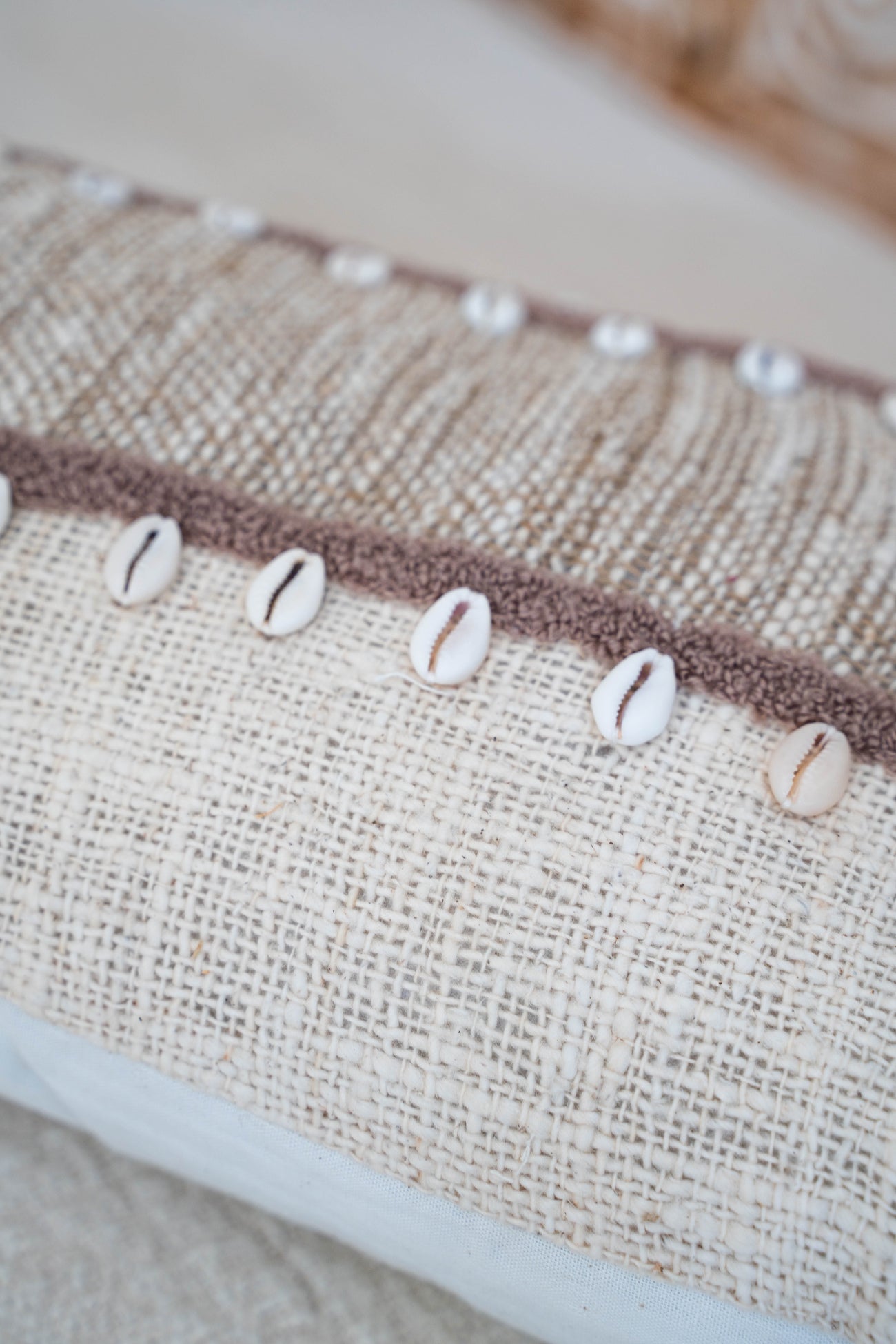 Product gegevens: Prachtig kussen, versierd met echte schelpen op de voorkant, met rits aan de achterkant