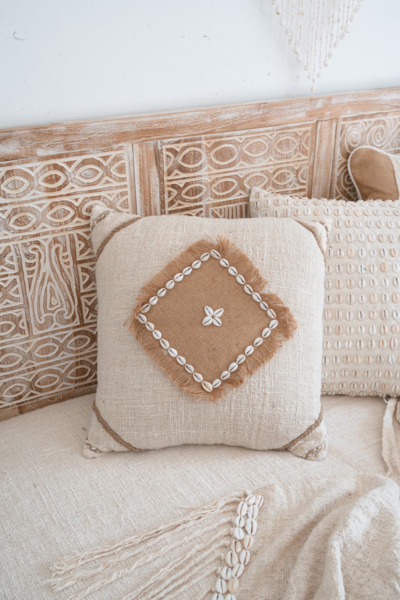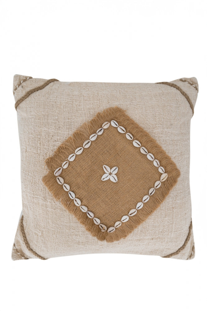 Product gegevens: Sfeervol kussen met echte schelpen bevestigd op de voorkant, rits aan de achterkant