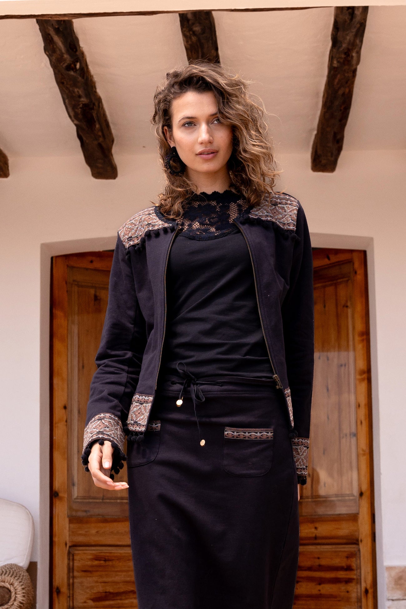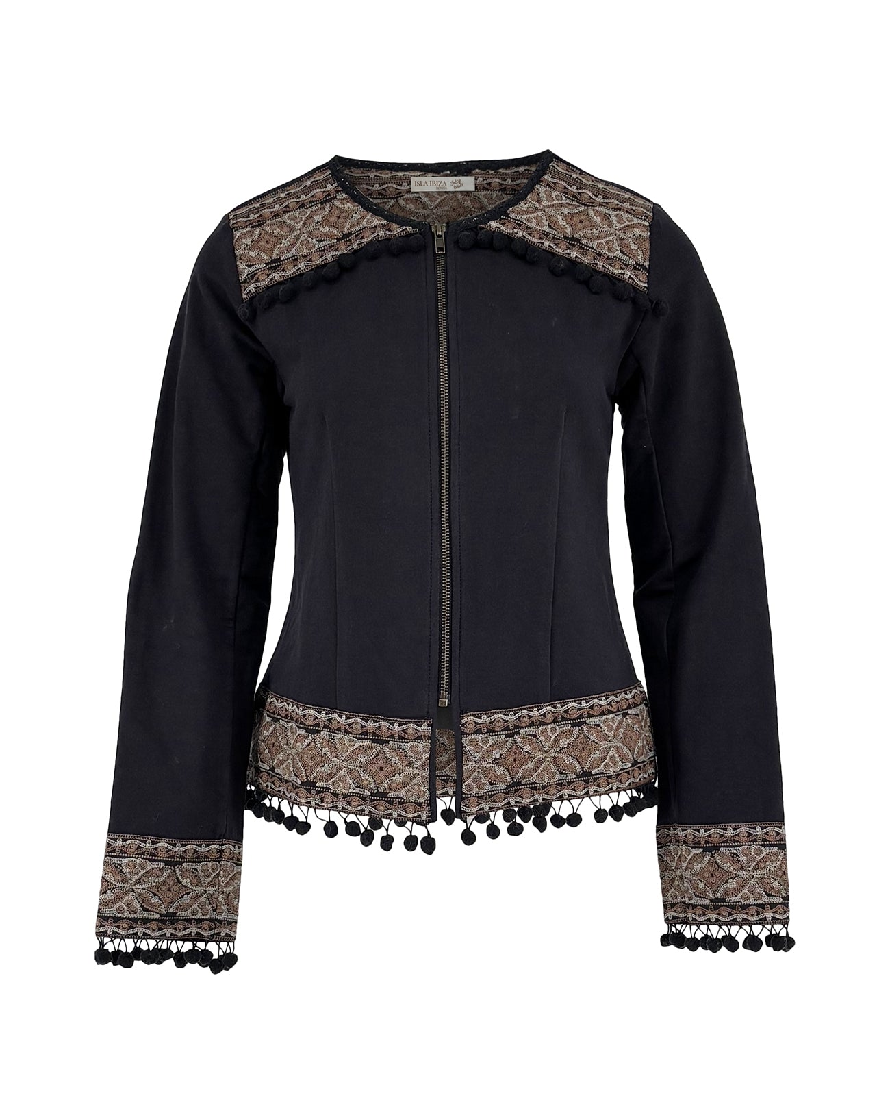 Product gegevens: Jasje met ritssluiting, gemaakt van rekbare tricot stof, rijkelijk versierd met pompons en band