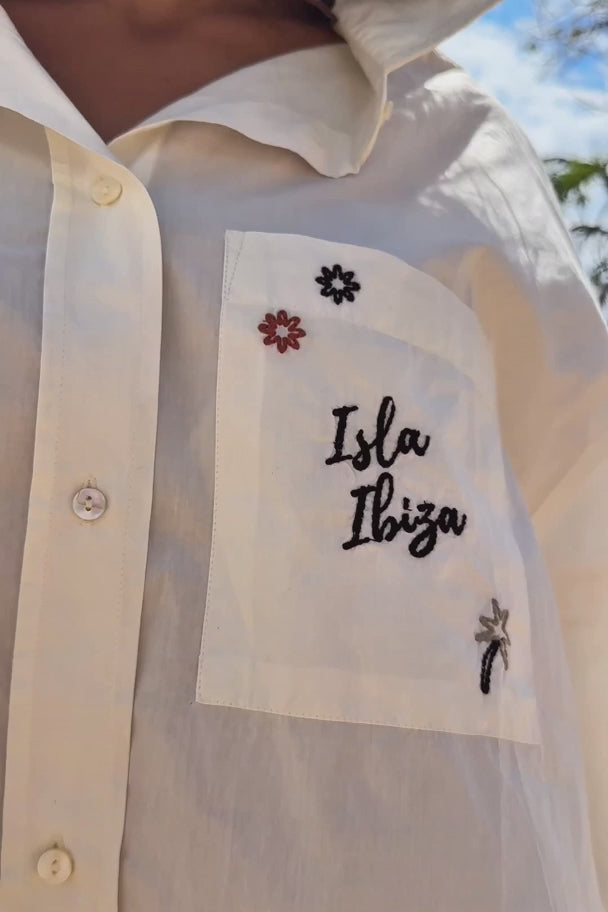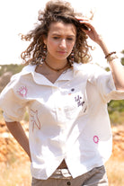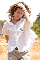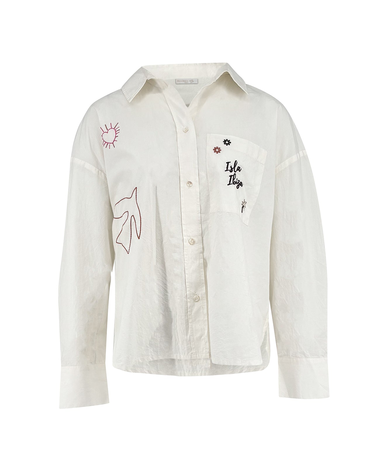 Product gegevens: Blouse met gestikte figuren en logo naam, heeft een kraagje, sluit met de knoopjes, gemaakt van een luchtige stof