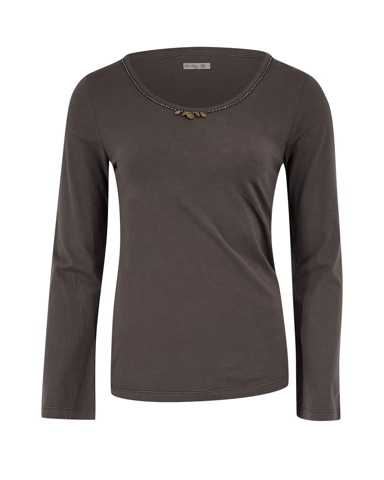Product gegevens: Heeft een ronde hals, bezet met sierrand en muntjes, gemaakt van een zachte stretch stof