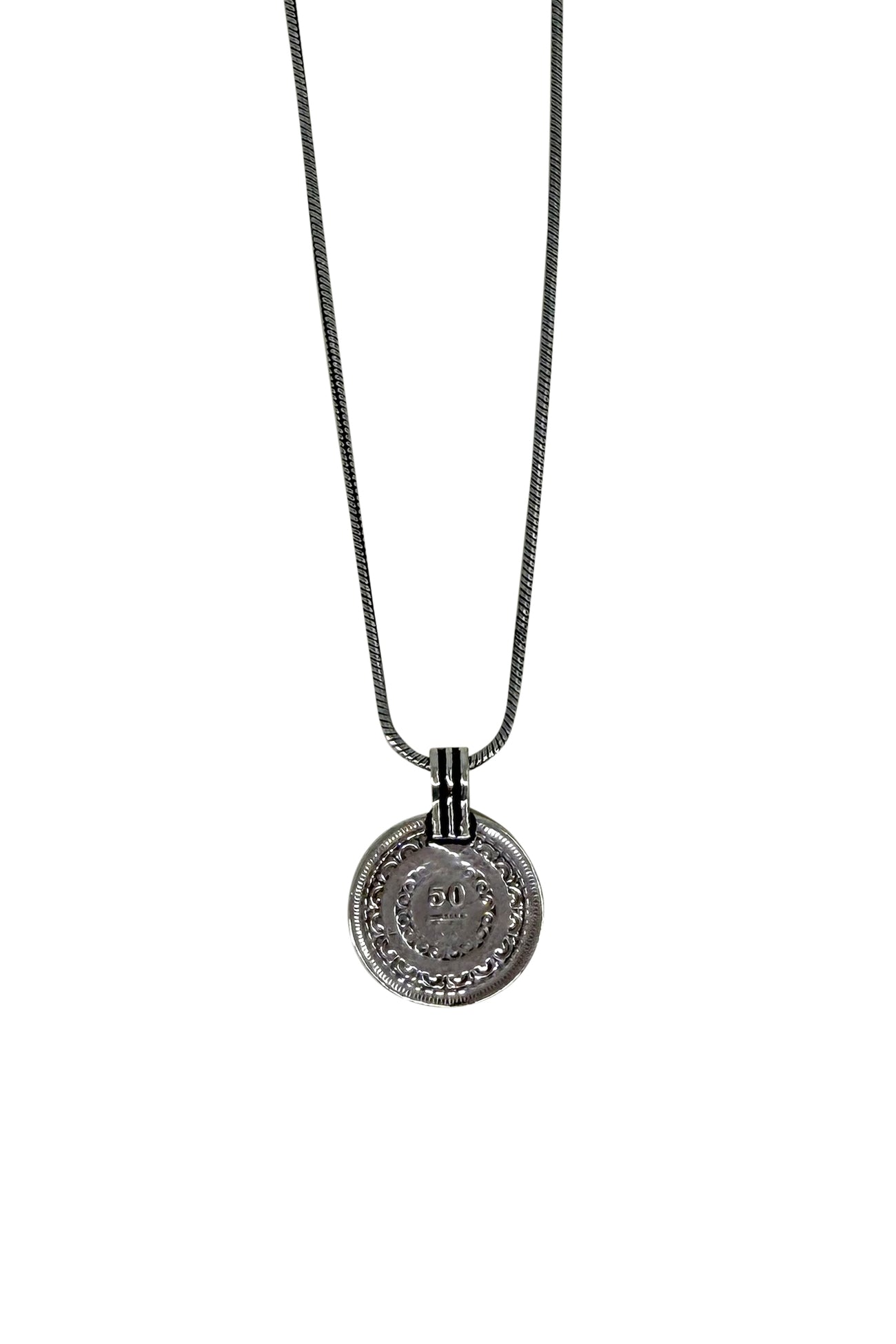 Product gegevens: Zilverkleurige ketting met munt. Gemaakt van verzilverd messing