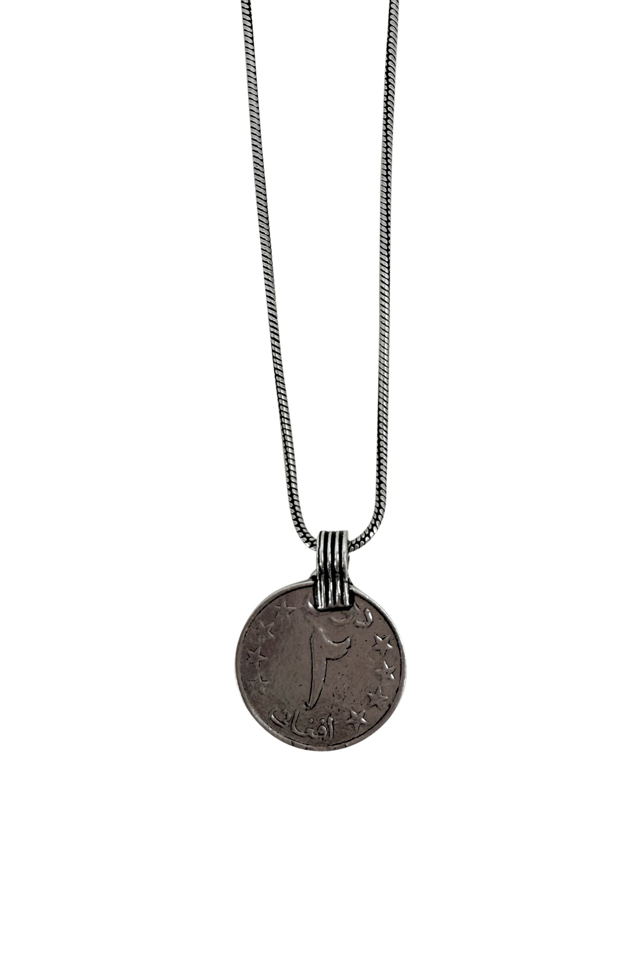 Product gegevens: Zilverkleurige ketting met munt. Gemaakt van verzilverd messing