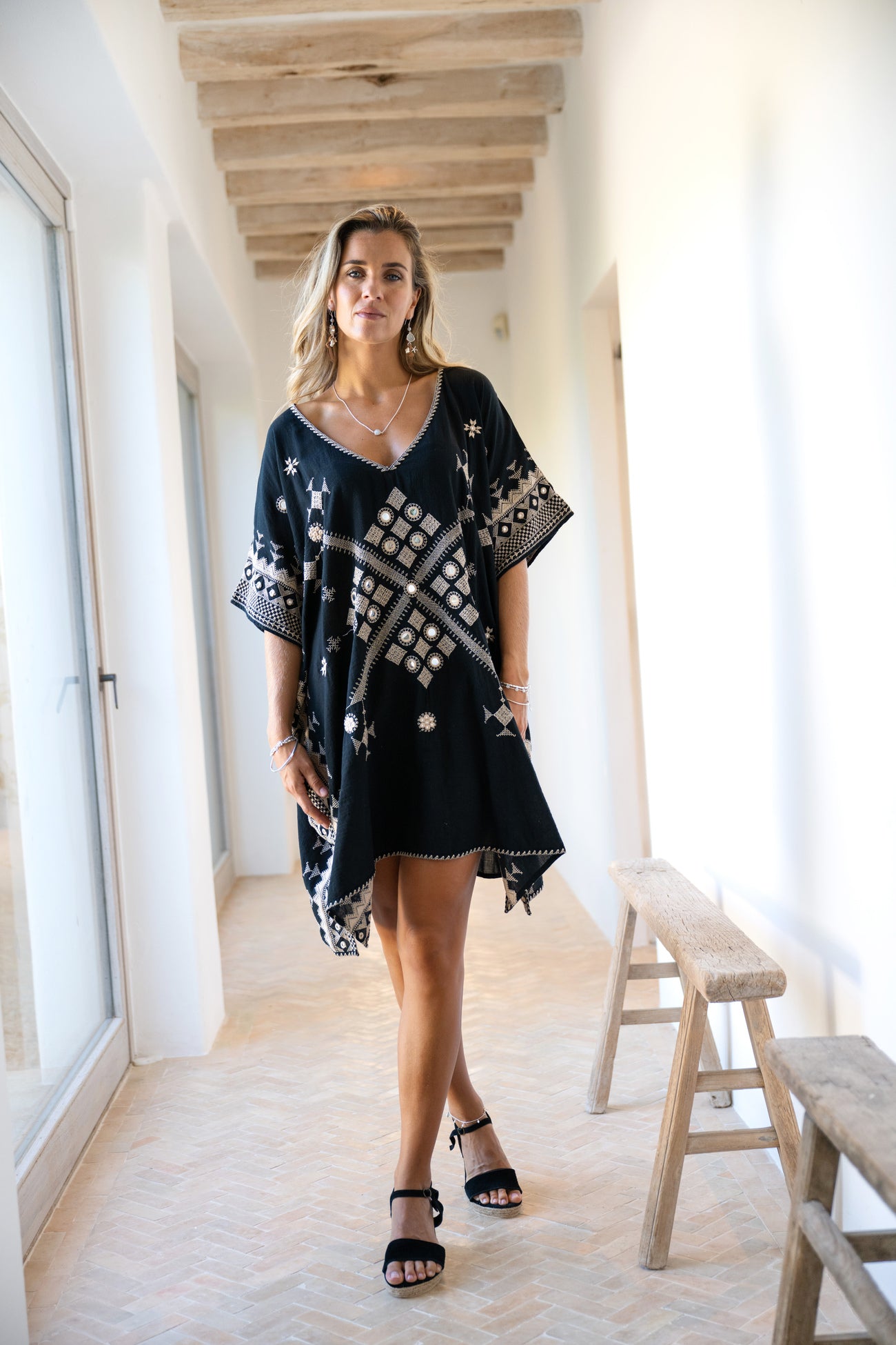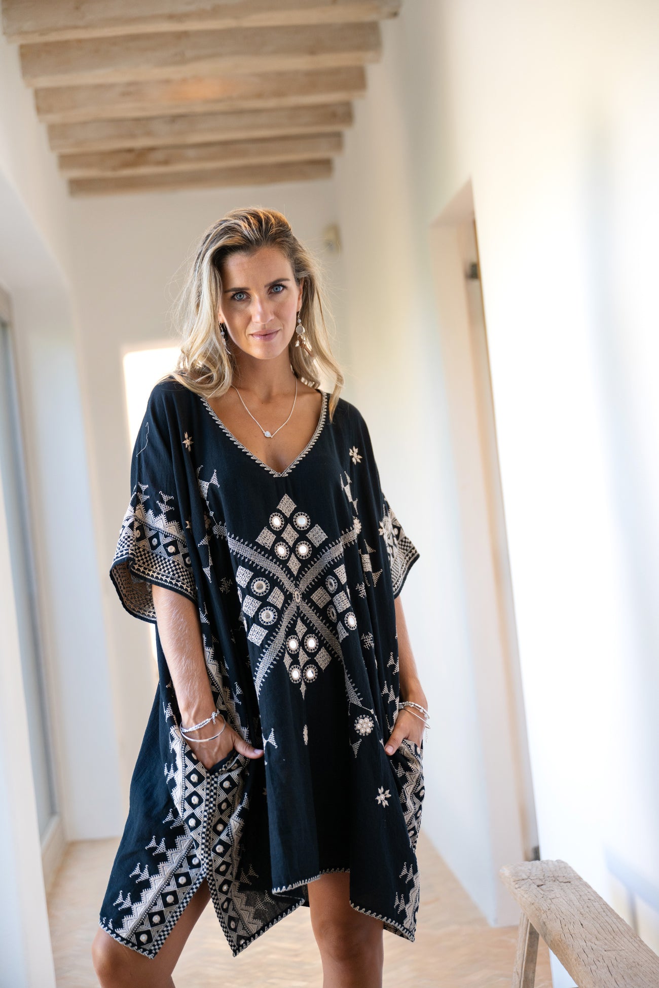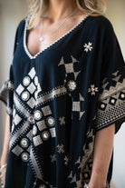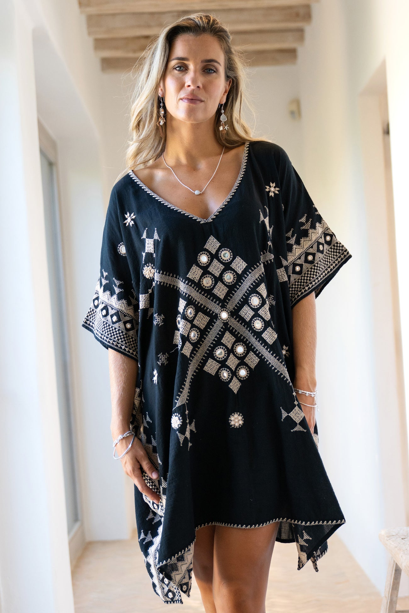 Ten eerste vallen de rijk geborduurde details op. Het handwerk tekent zich af langs hals en boord. Vervolgens vangen de subtiel ingezette spiegeltjes elk straaltje zonlicht. Bij iedere beweging schittert de kaftan zacht mee. Daardoor oogt Hilla Sundara Black als high-end bohemian mode, perfect voor de mooiste beachclubs.