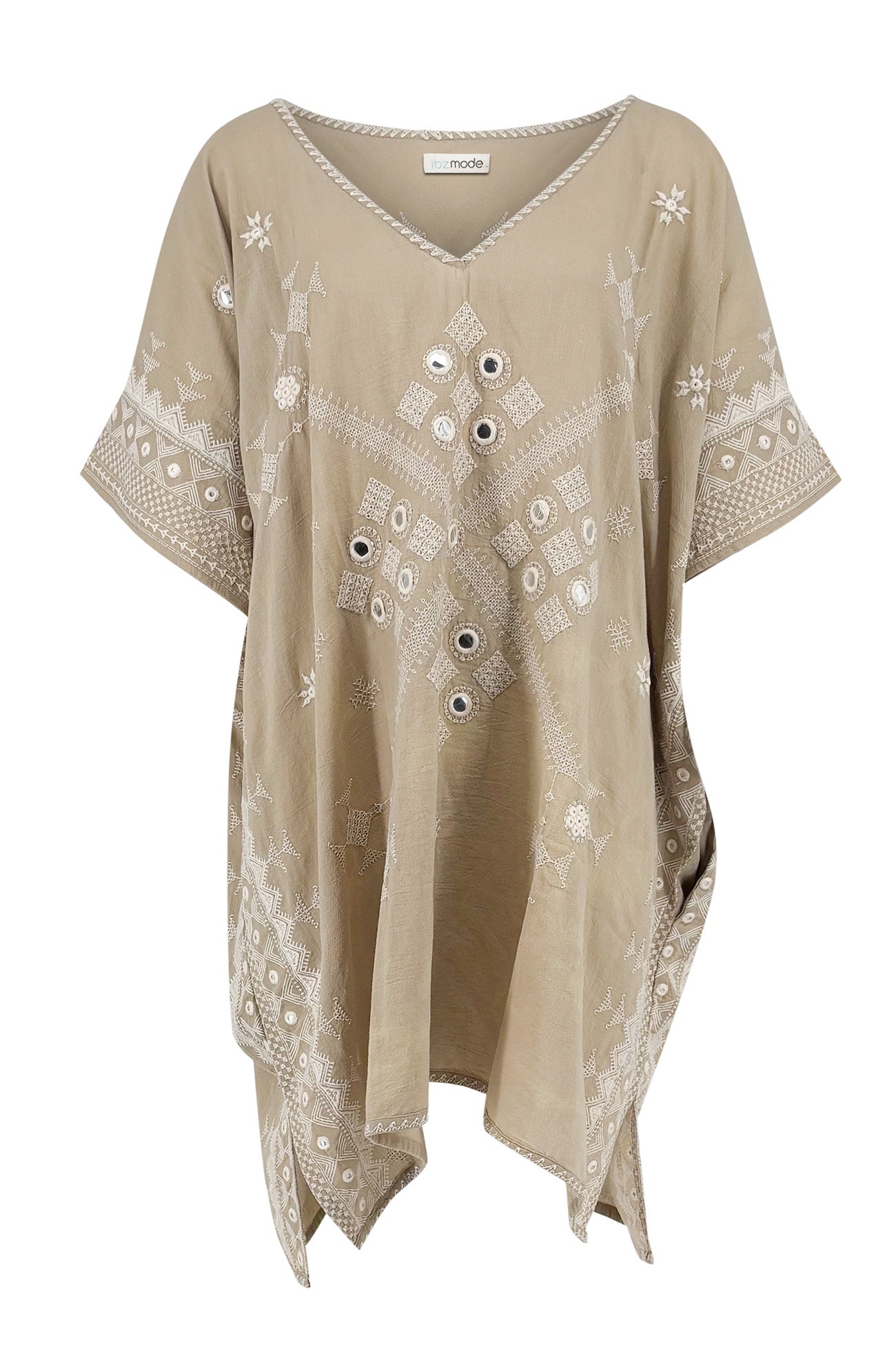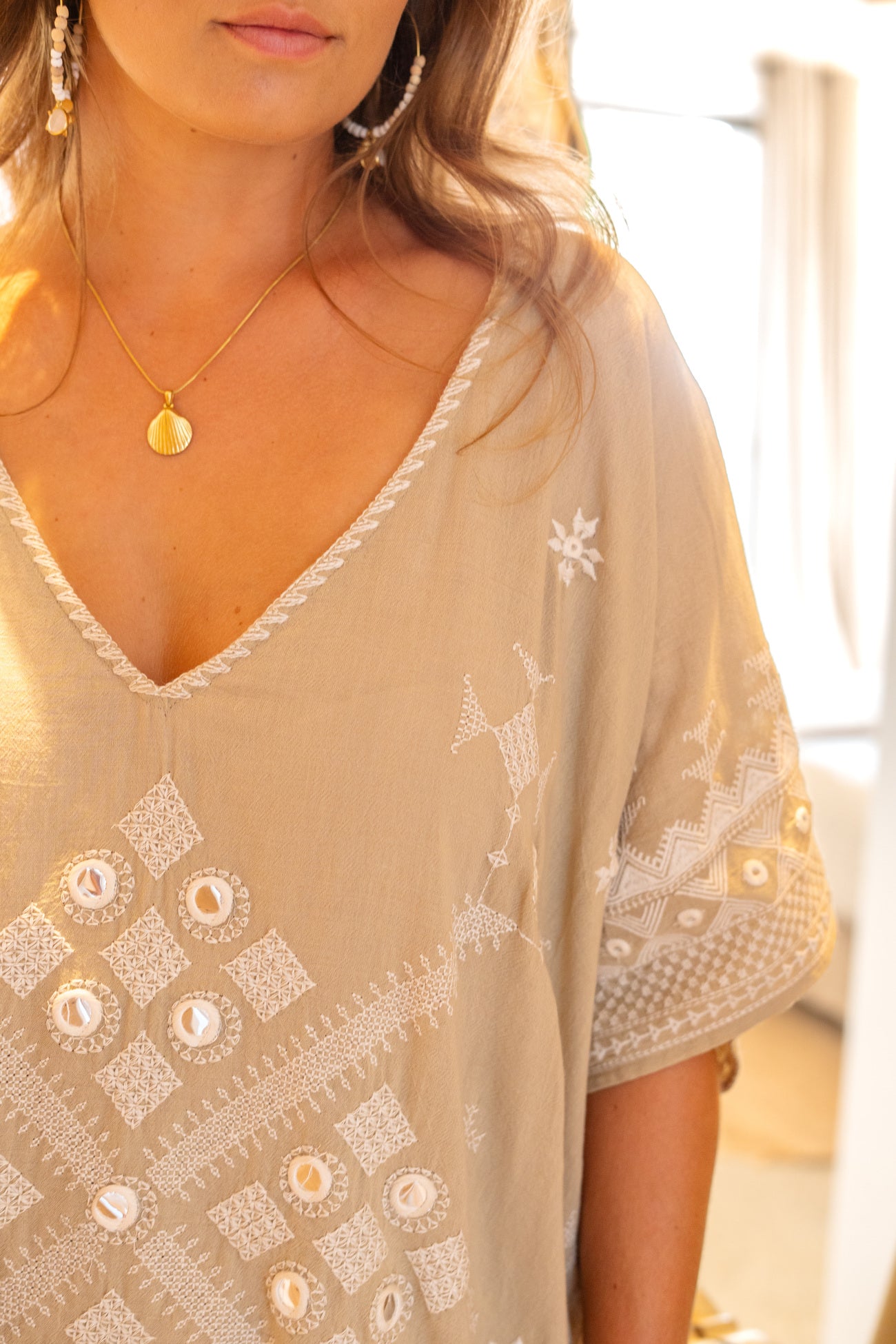 Ten eerste vallen de handgemaakte details op. Rijk borduurwerk en zorgvuldig geplaatste spiegeltjes vangen het zonlicht subtiel. Bij elke beweging ontstaat een zachte glans. Daardoor is Luxe Kaftan Hilla Sundara Light Taupe gemaakt om gezien te worden. Ideaal voor beachclubs, lange lunches en momenten waarop stijl vanzelfsprekend voelt.