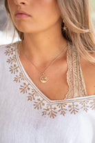Dit sieraad heeft een stevige basis van messing en is afgewerkt met een laagje echt goud. De combinatie zorgt voor een warme glans en een luxe uitstraling. Draag met zorg – vermijd water, parfum en schoonmaakmiddelen – dan blijft je sieraad lang mooi.