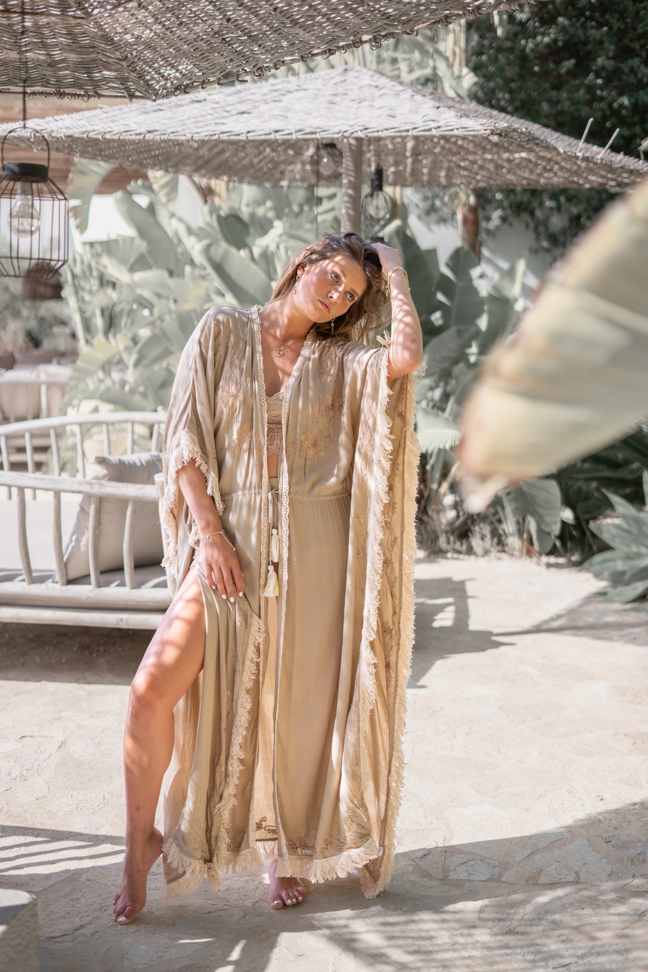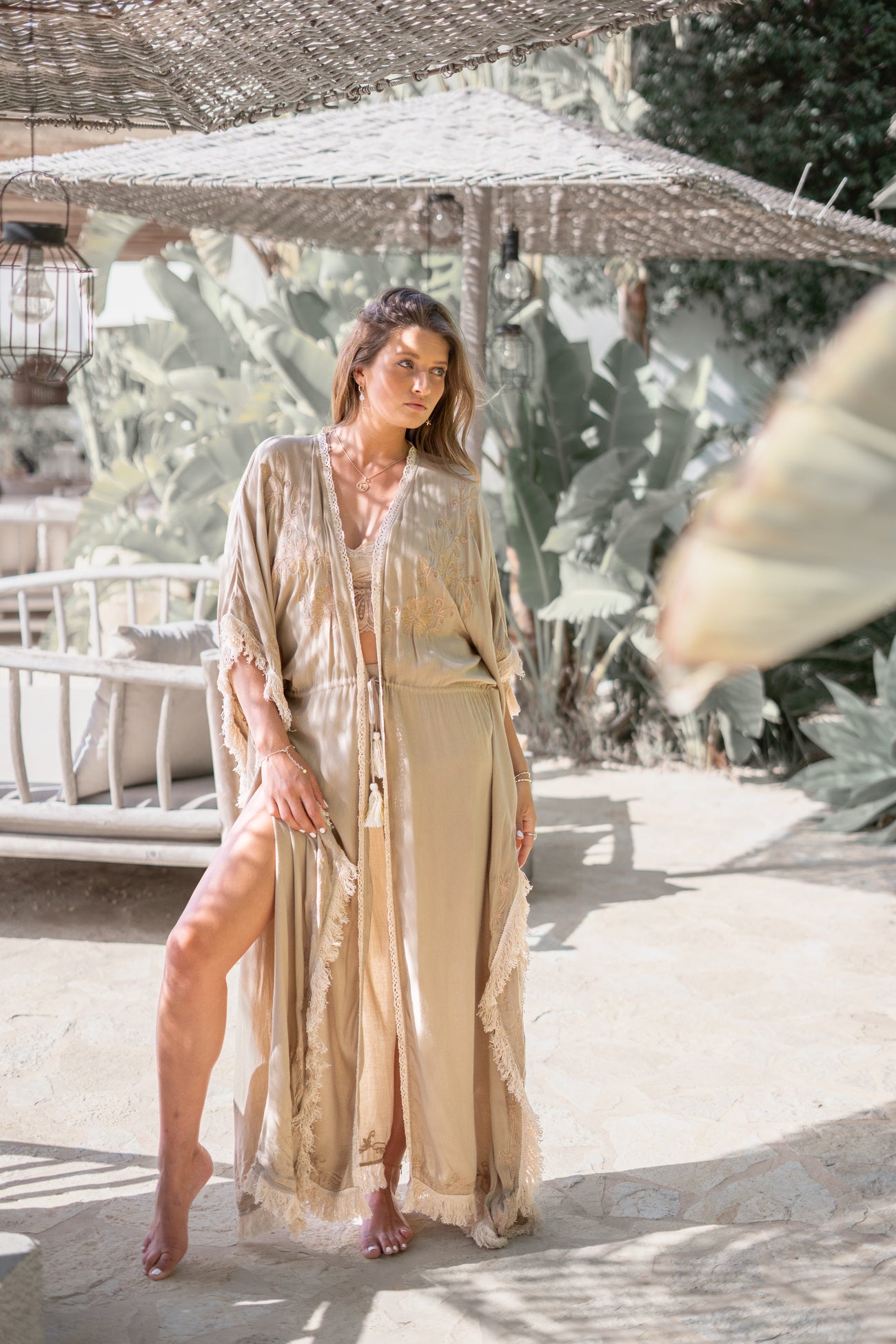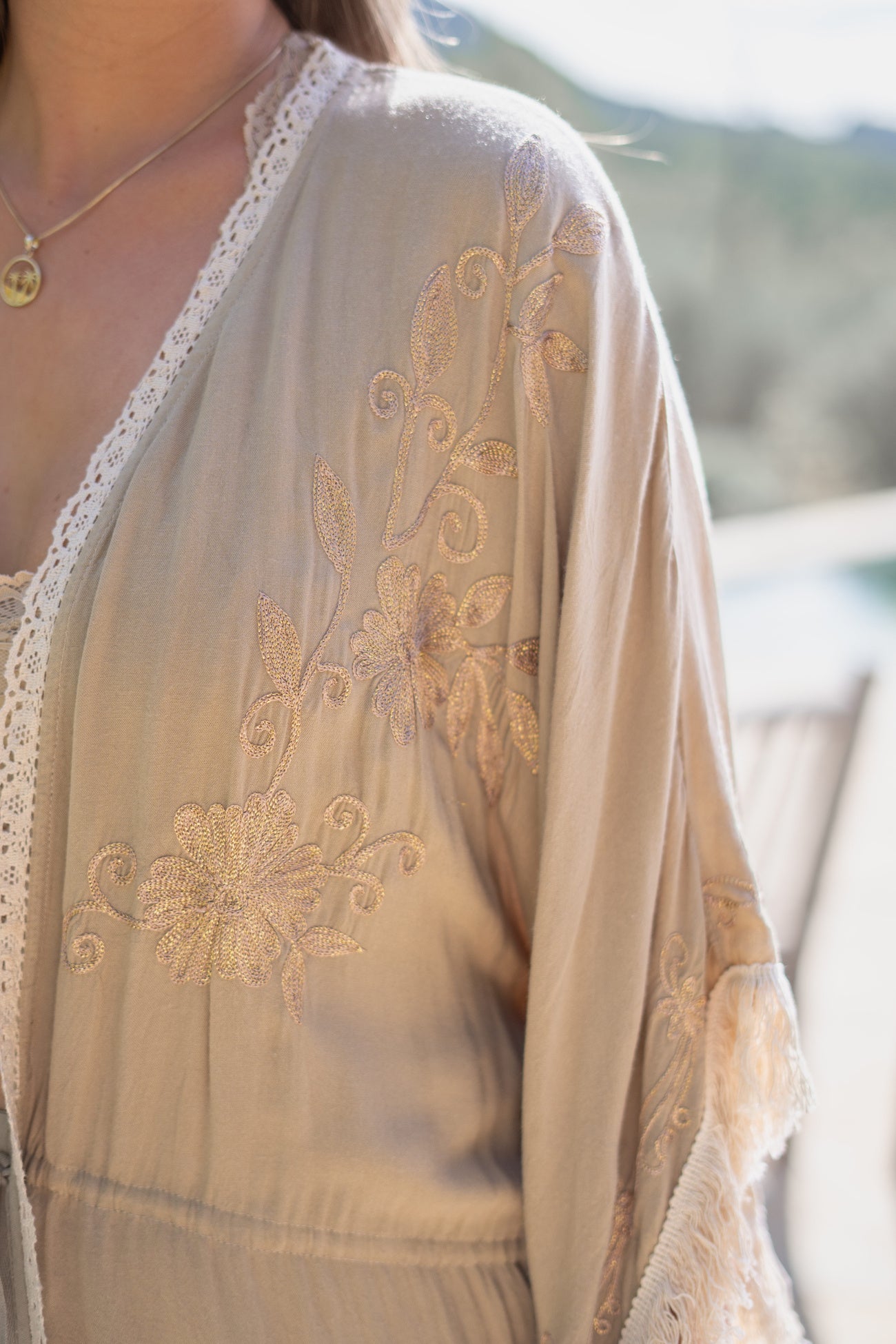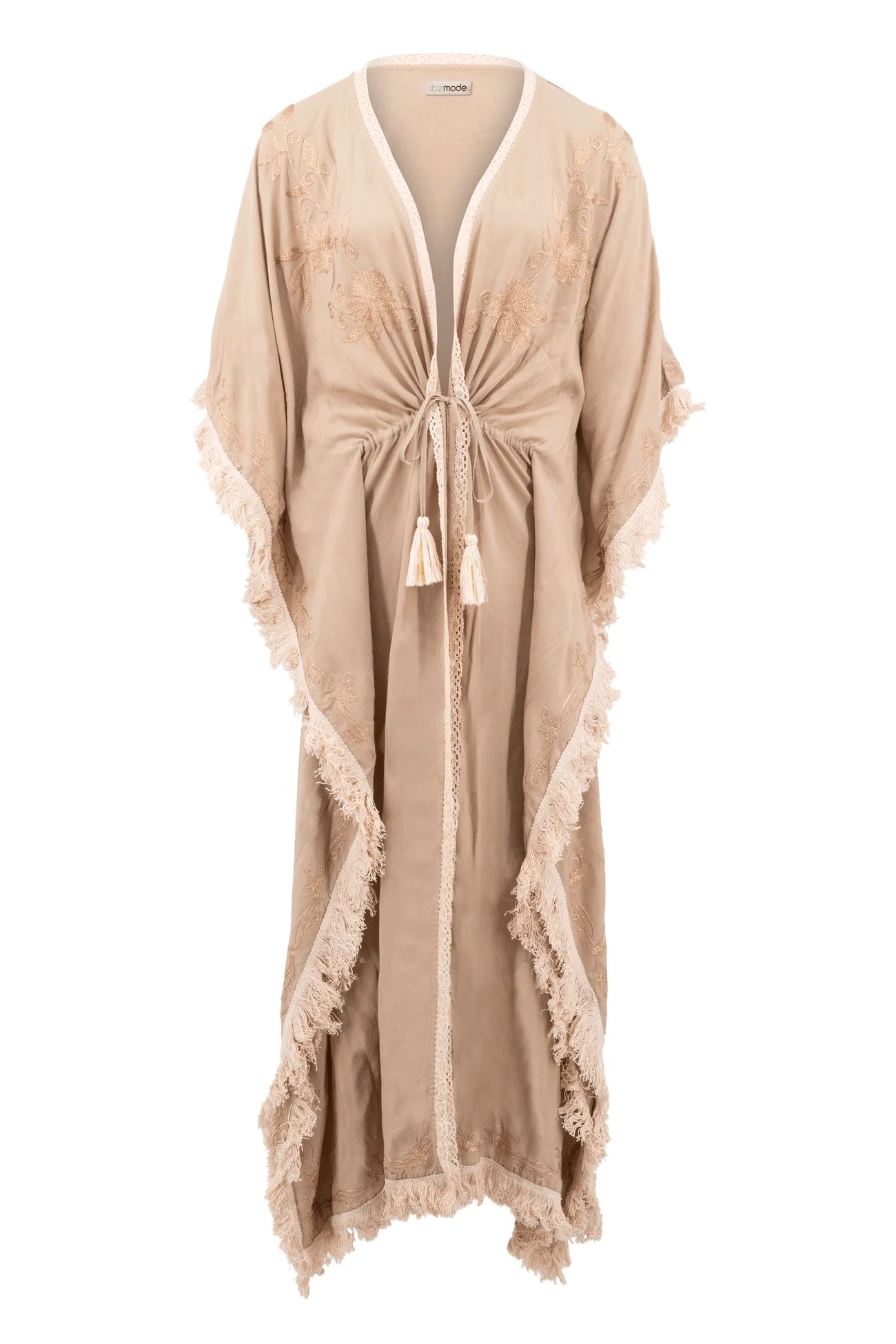 Deze Long Kimono Fringe Kyra Powder van ibzmode in het powder ademt Ibiza vibes. Geborduurde lurex details, decoratieve rand van franjes en gehaakt band, kan met de touwtjes waar kw Het natuurlijke materiaal zorgt voor een luchtige feel. Voeg deze must-have toe aan je zomergarderobe.