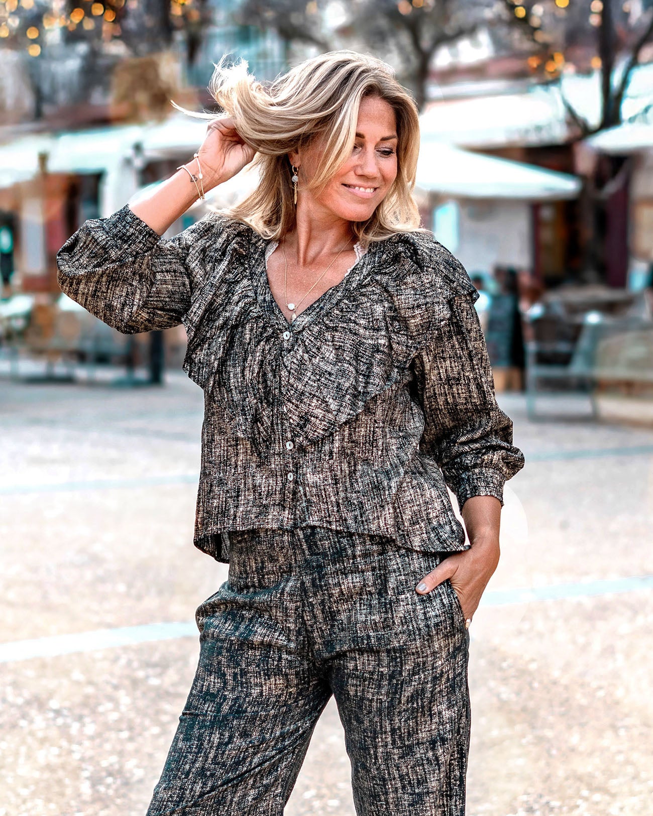 Op zoek naar een item met bohemian flair? Dan is de Blouse Ruffle Sparkle Black Gold van ibzmode jouw match. Heeft een V-hals, Knoopjes bij de buste, Elastische mouwbanden De luchtige stof voelt zacht aan op je huid. Nu verkrijgbaar bij ibizamode – ontdek meer op Brands of Ibiza.