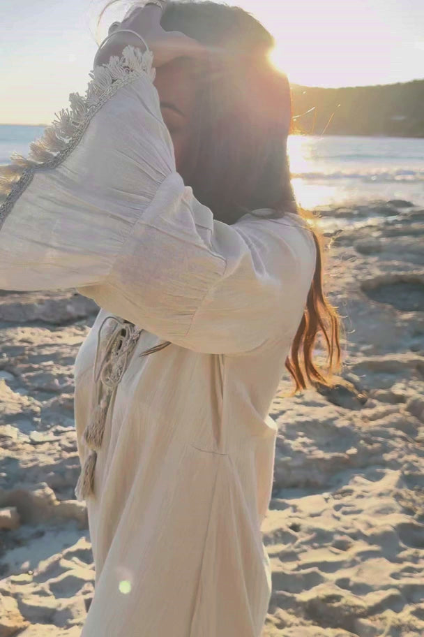 Creëer jouw ultieme zomerse look met de Kaftan Calista Nyx Sand in de kleur sand. Kaftan bewerkt met franjes en gouden lurex garen Draag het met je favoriete accessoires voor een echte brands of Ibiza-look. Bestel snel en geniet van de bohemian lifestyle, elke dag opnieuw.