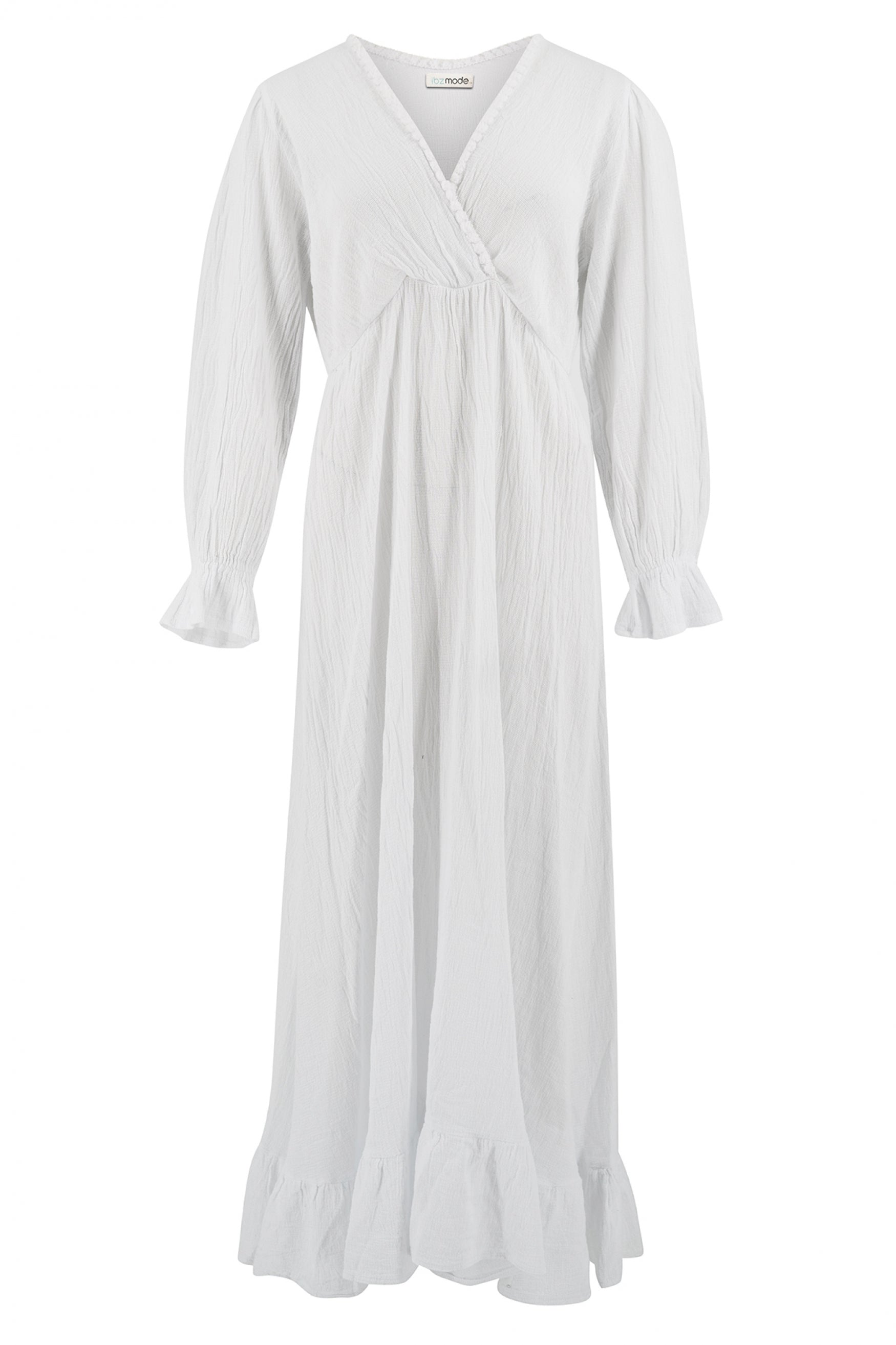 Product gegevens: Maxi jurk met lange mouwen, overslag top en elastiek in de taille. LET OP: het betreft de witte jurk van de productfoto