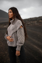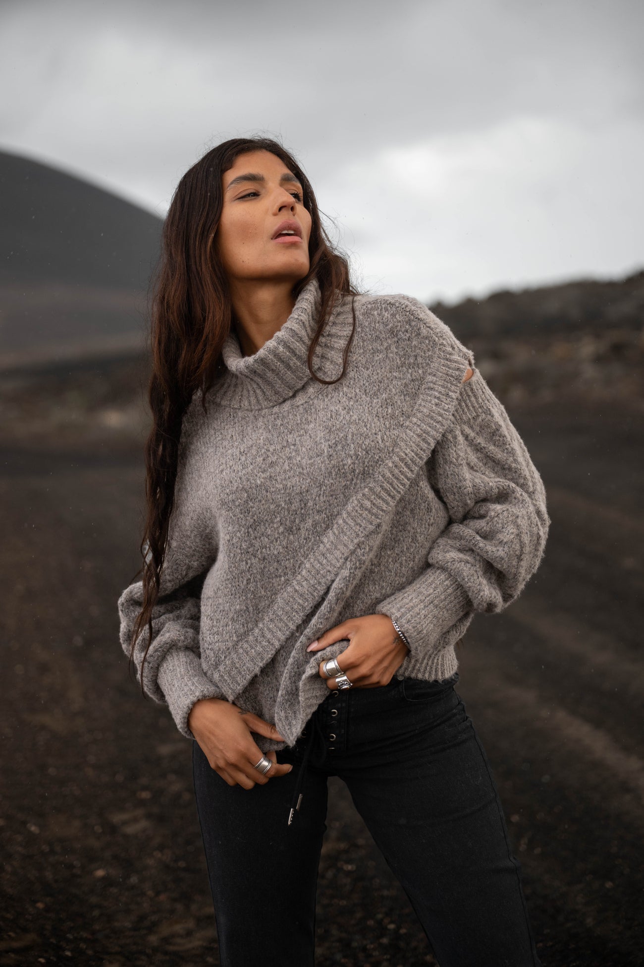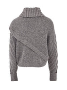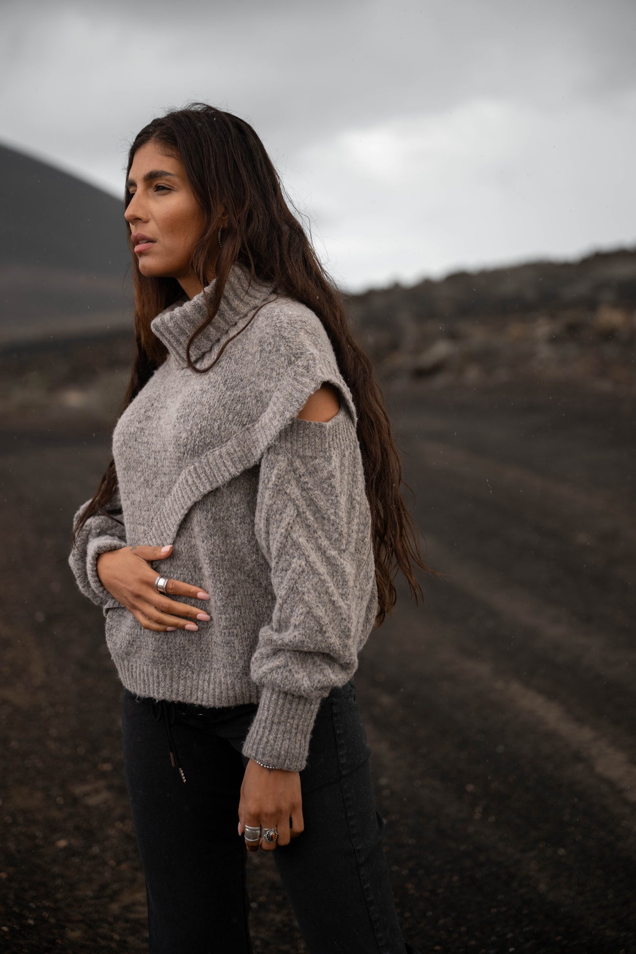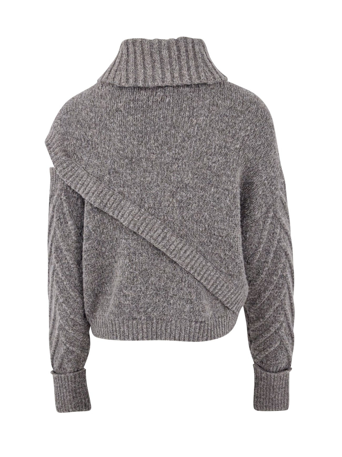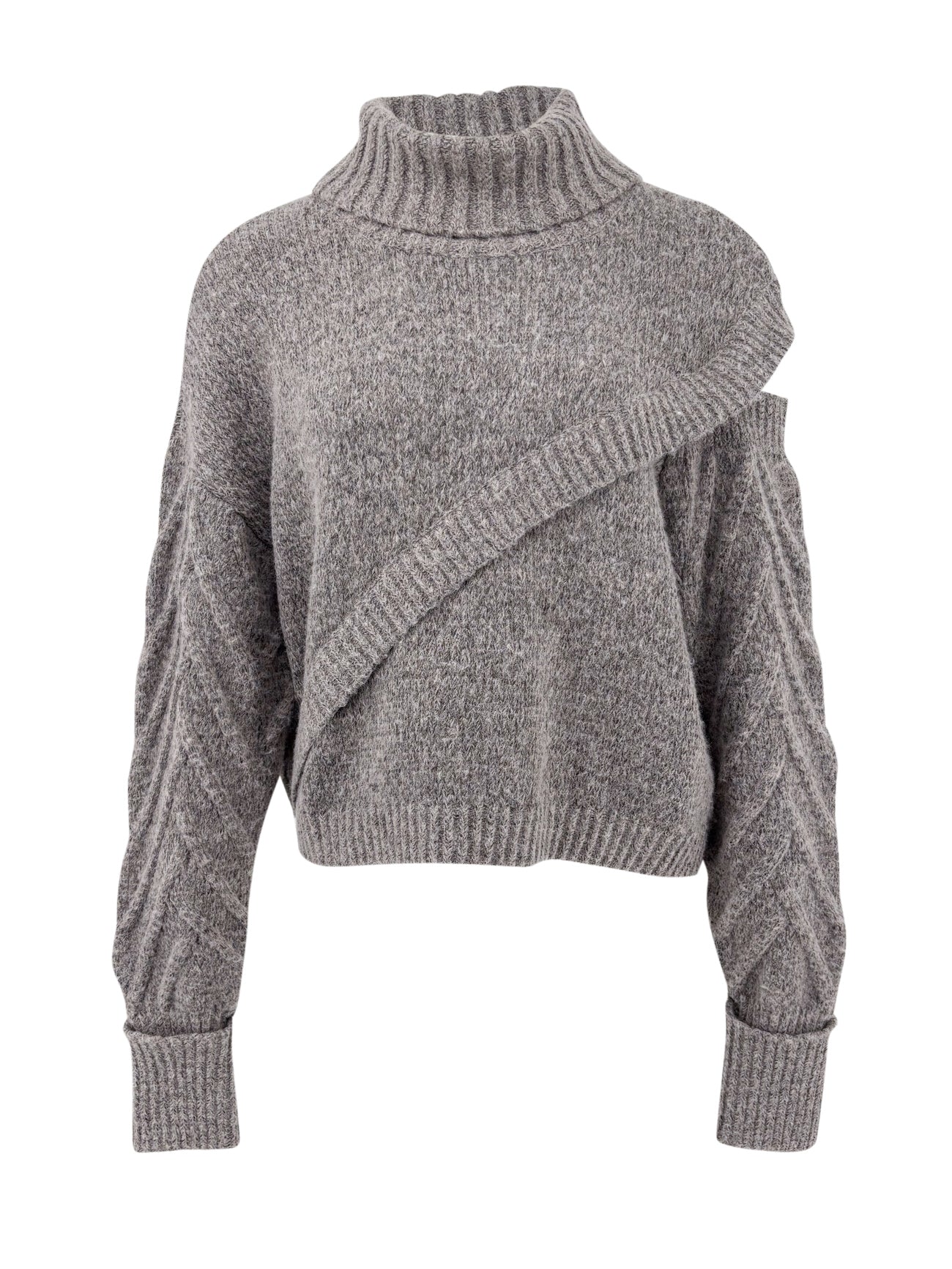 Product gegevens: Heeft een kleine col, een overslag detail, een open schouder, heeft een fijne breisteek