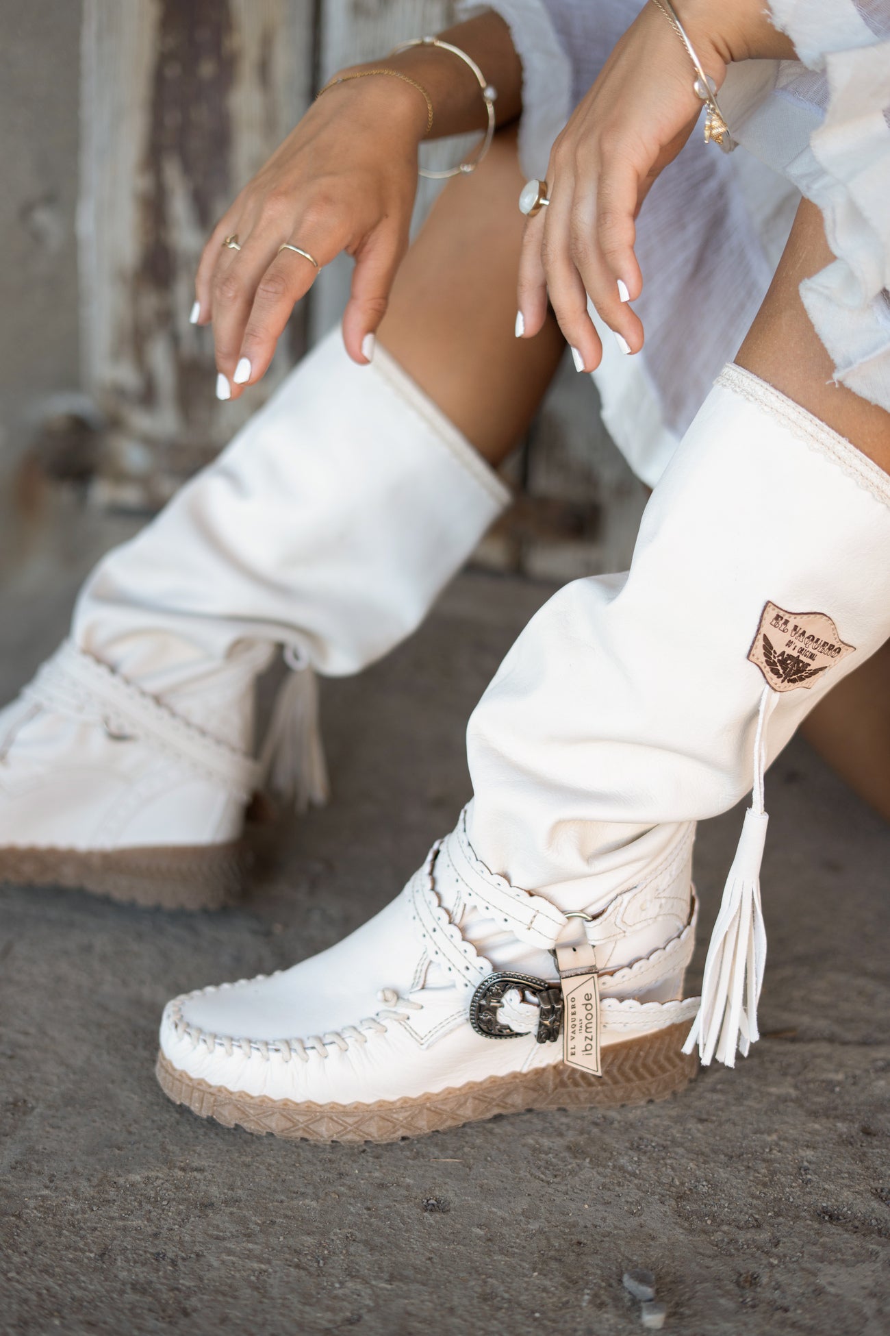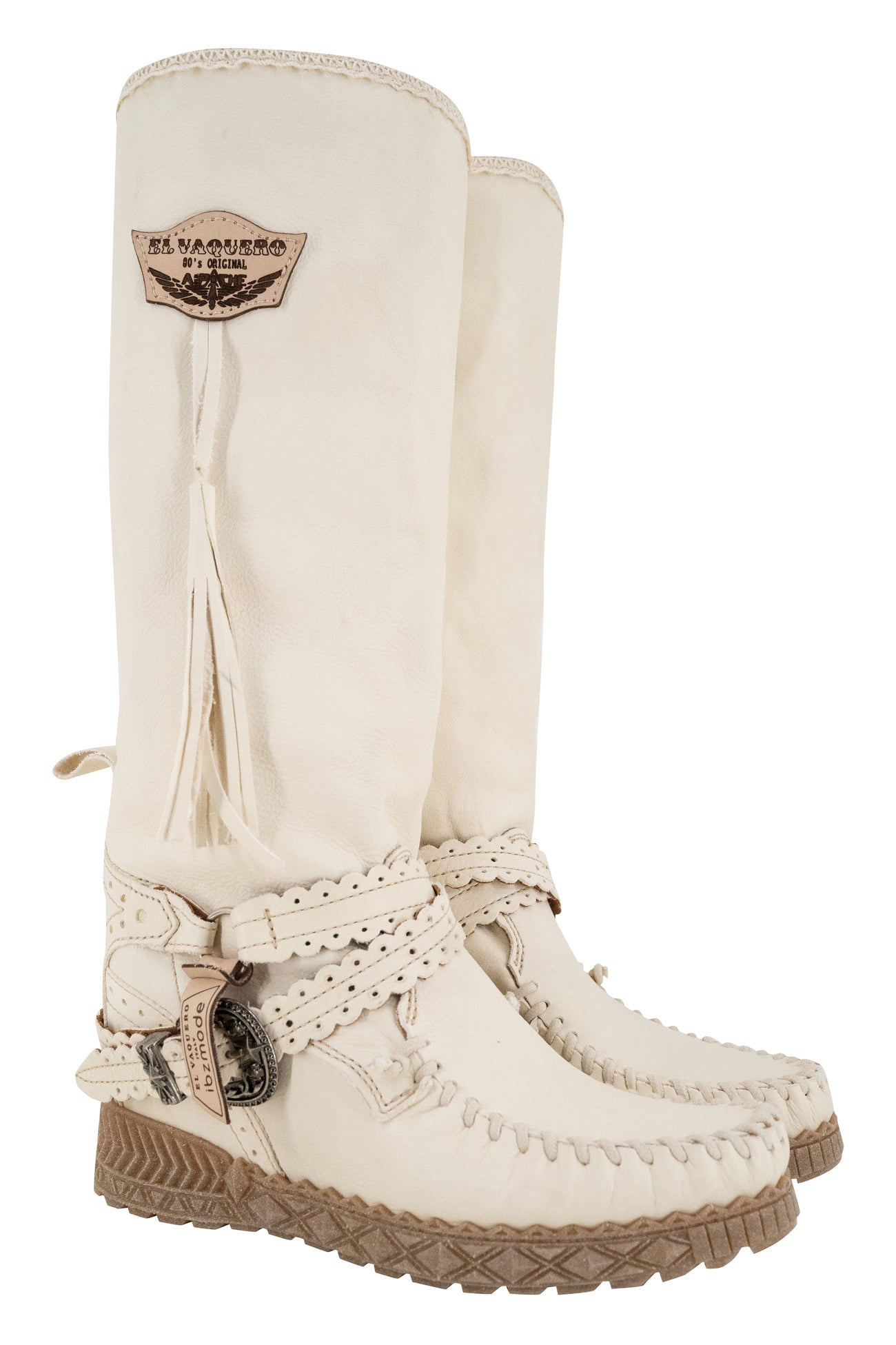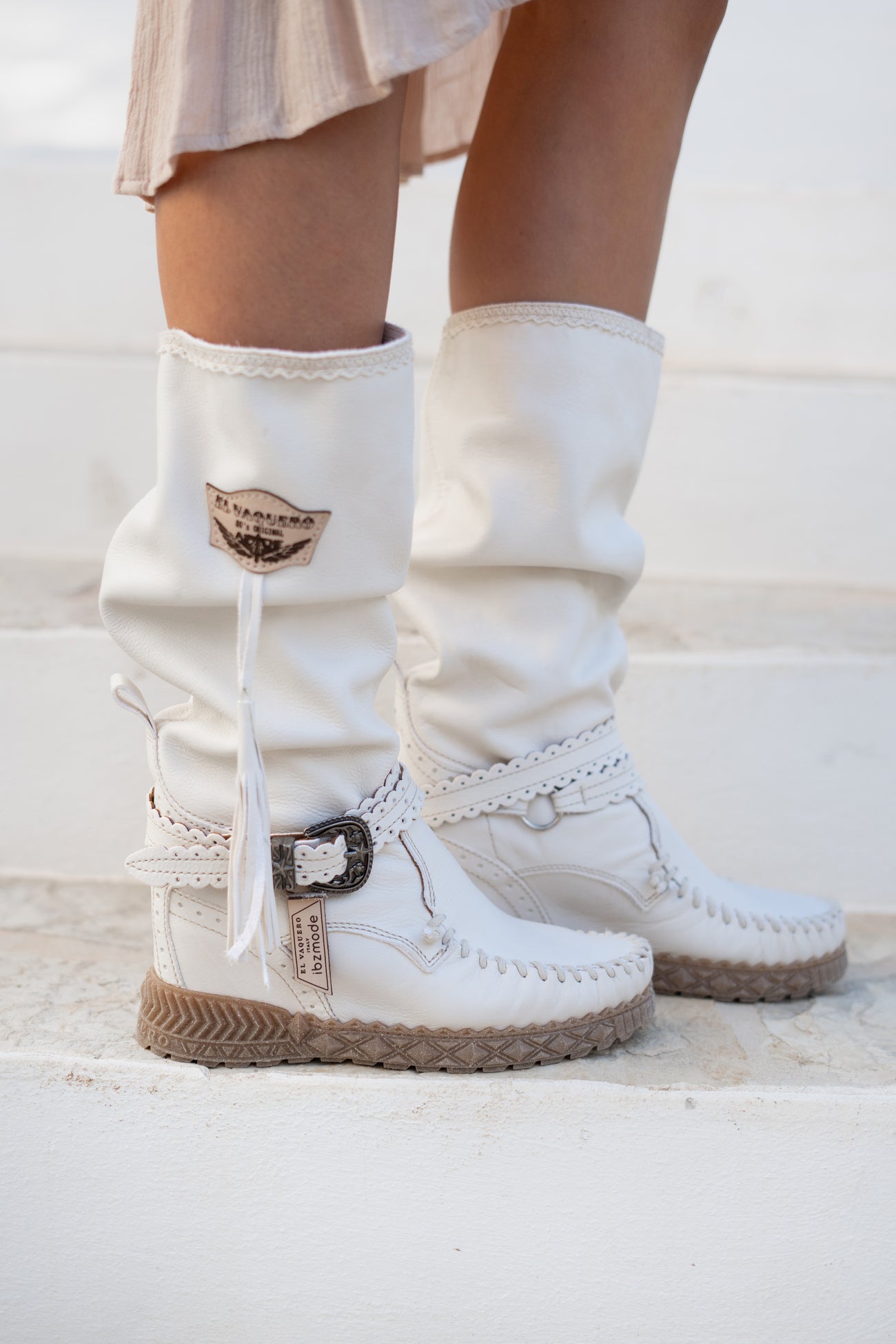 Geef jouw garderobe een update met de El Vaquero x ibzmode Cammy White, ontworpen voor zonnige dagen. Handgemaakte laarzen van leer, hebben 2 logo's, riempjes met gesp, neus loopt in een lichte punt en Perfect te combineren met slippers, een basic top of een lichte blouse. Shop nu bij ibizamode en straal deze zomer in stijl.