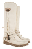 Product gegevens: Handgemaakte laarzen van leer, hebben 2 logo's, riempjes met gesp, neus loopt in een lichte punt en is bewerkt met stiksels, op de schacht zit een kwast en een gehaakte rand, de zool is bewerkt