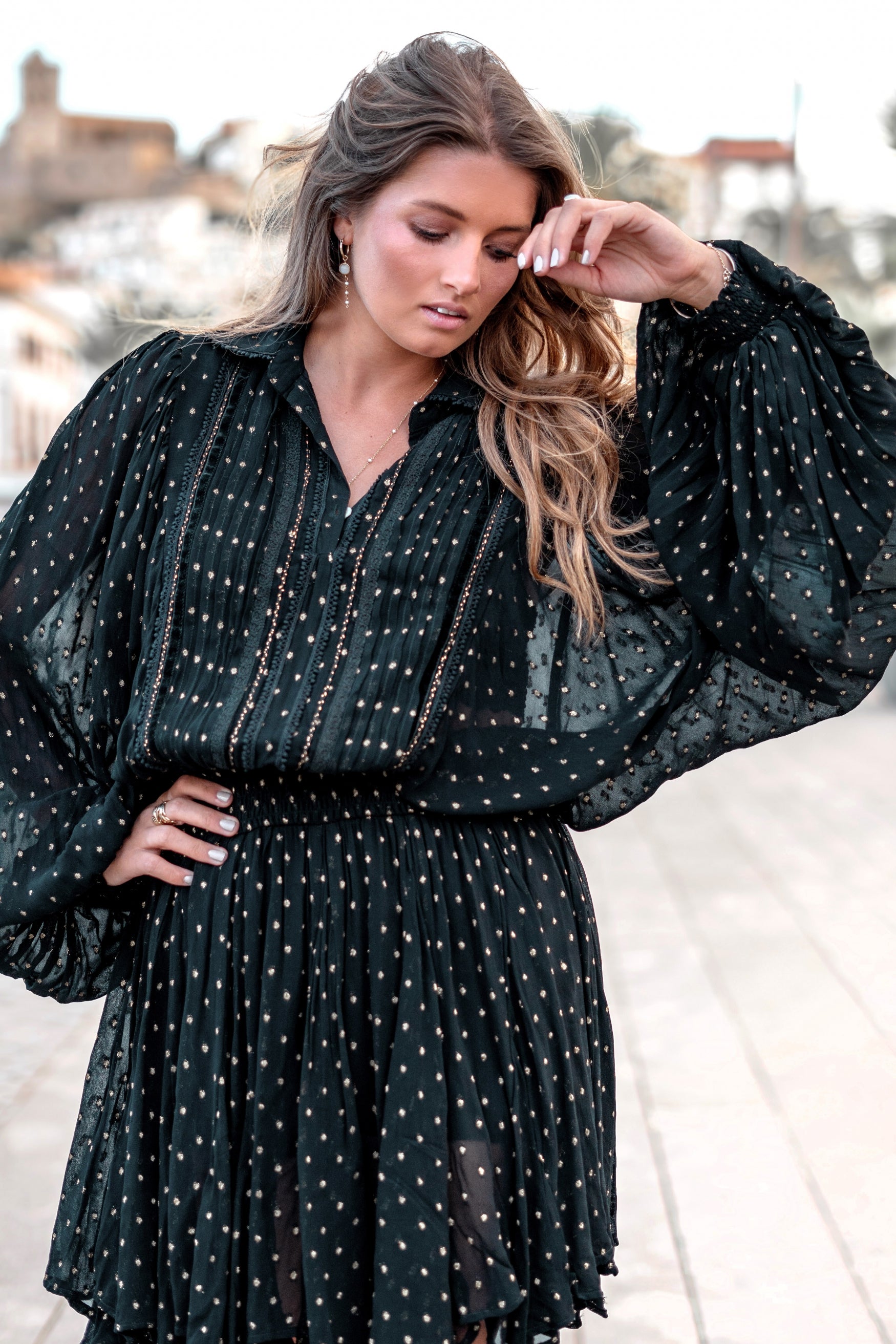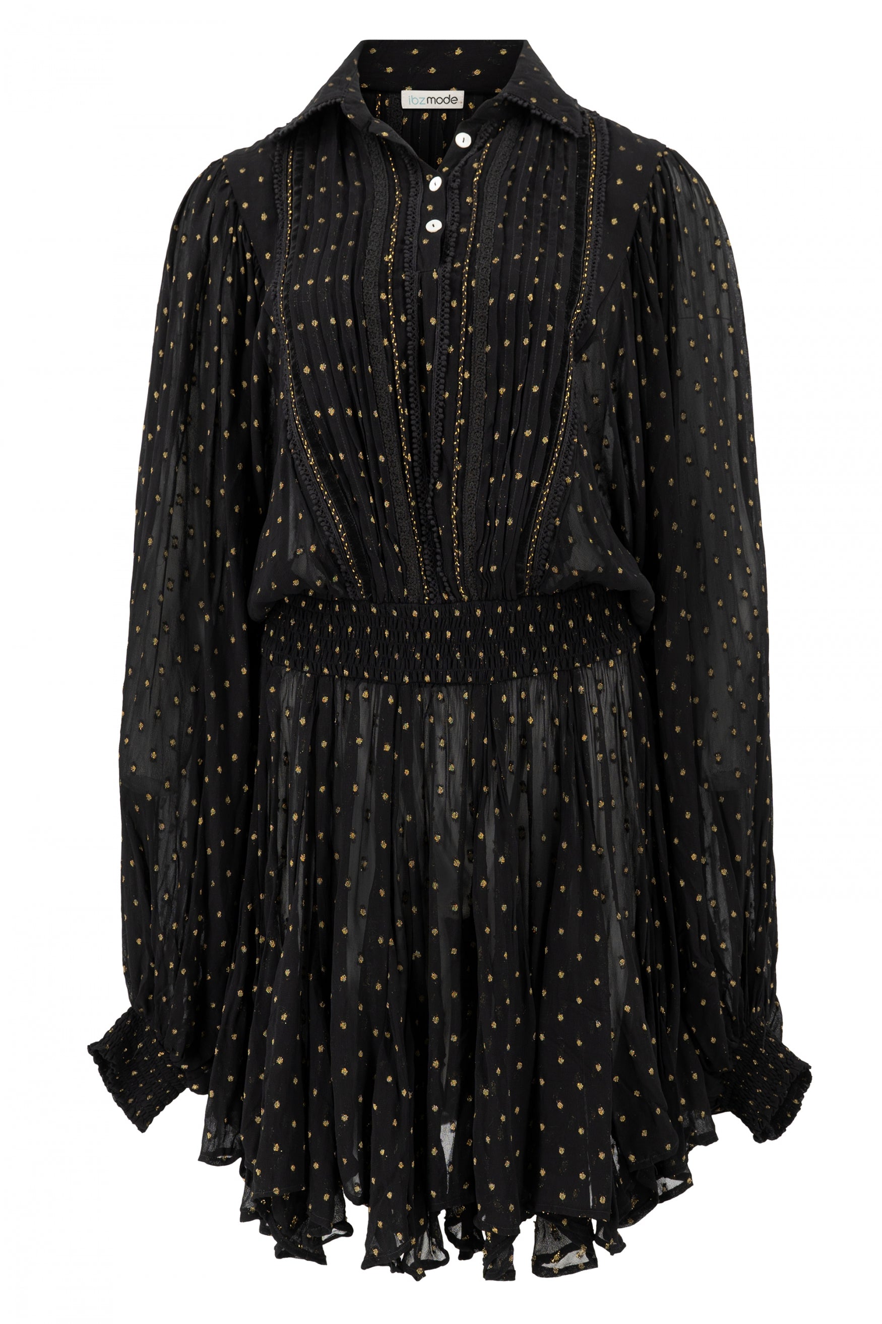 Met de Short Dress Bliss Black van ibzmode ben je klaar voor elke summer getaway. Hoge hals, Knoopjes bij de buste, Bewerkt met gouden lurex garen en crochet, Ballonmouwen met elasti Gemaakt van 60% rayon, 40% katoen, licht en comfortabel voor warme dagen. Bestel snel en geniet van de bohemian lifestyle, elke dag opnieuw.