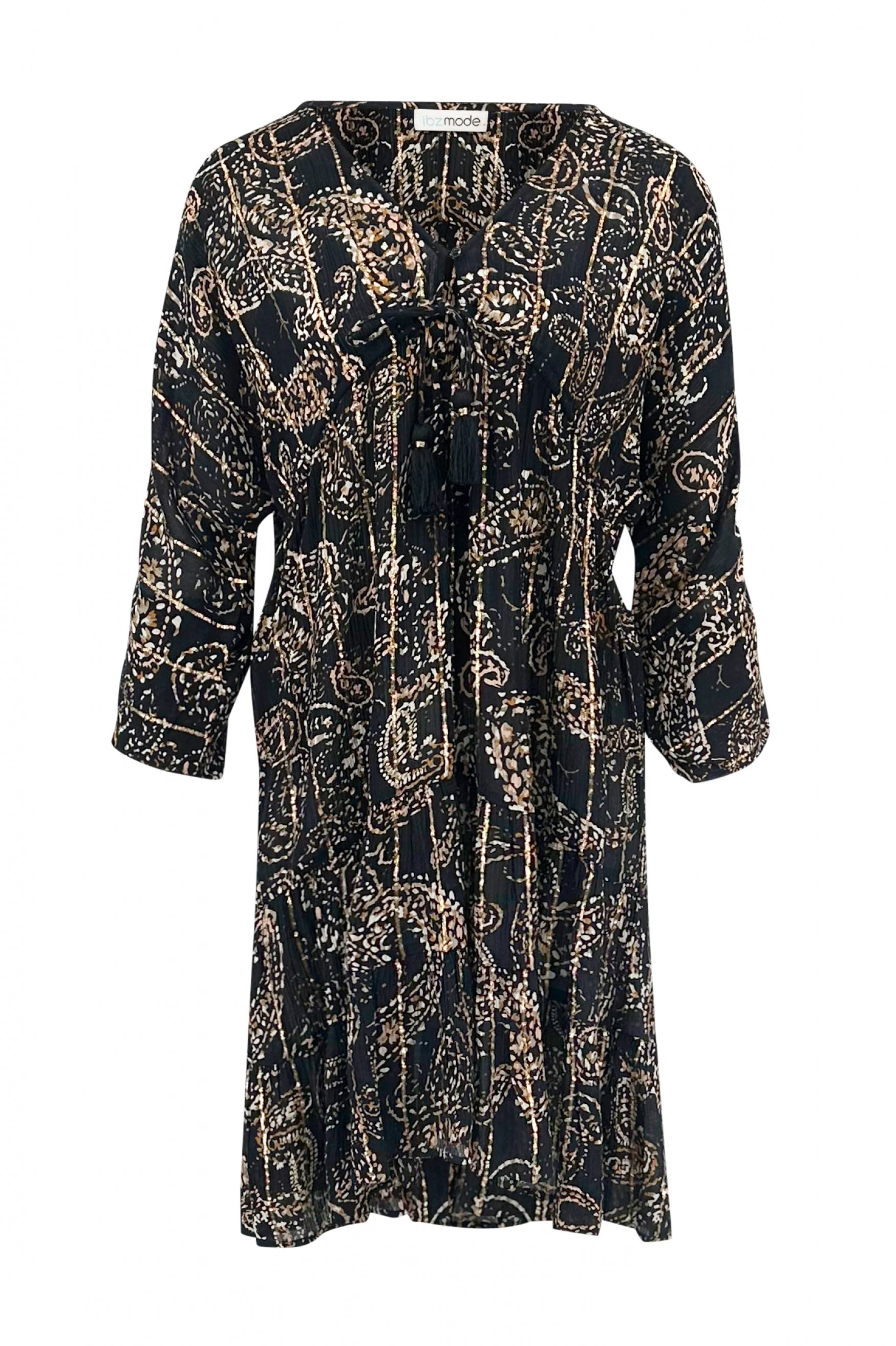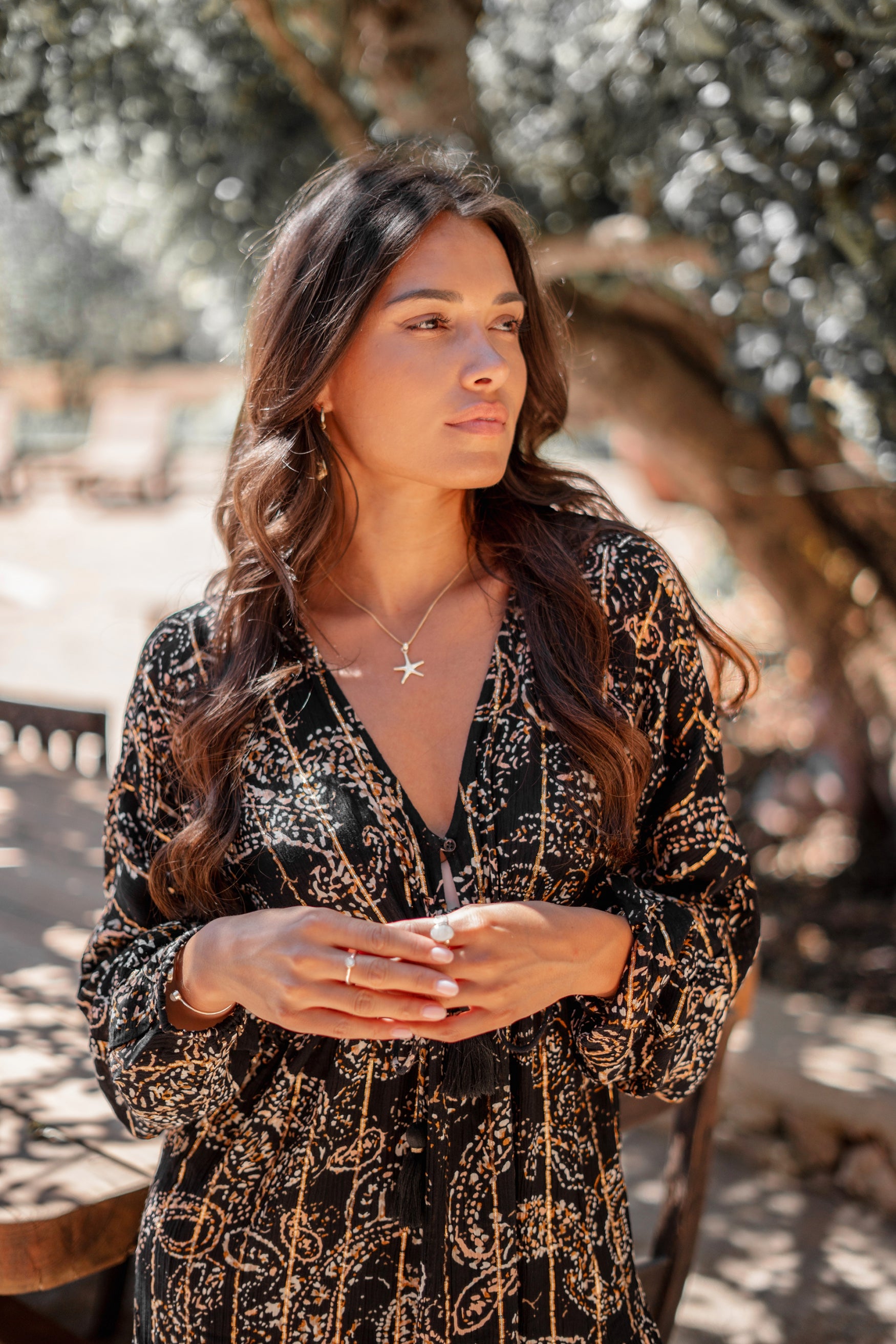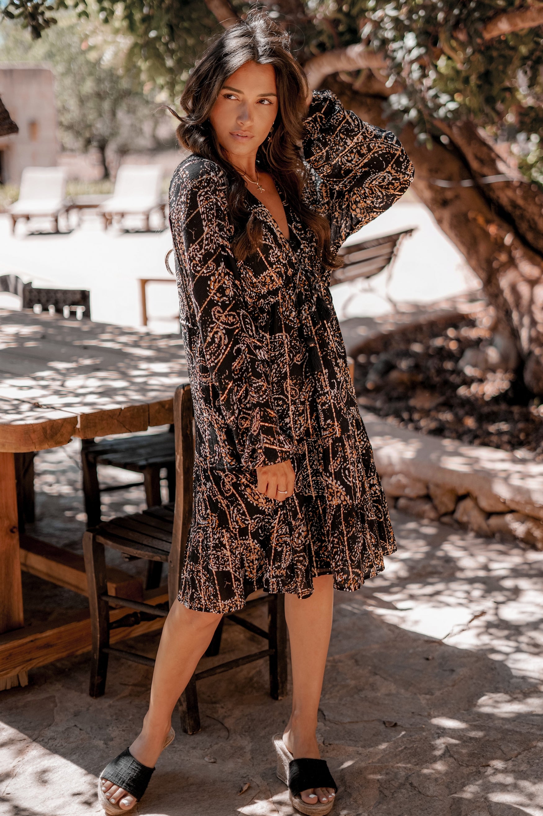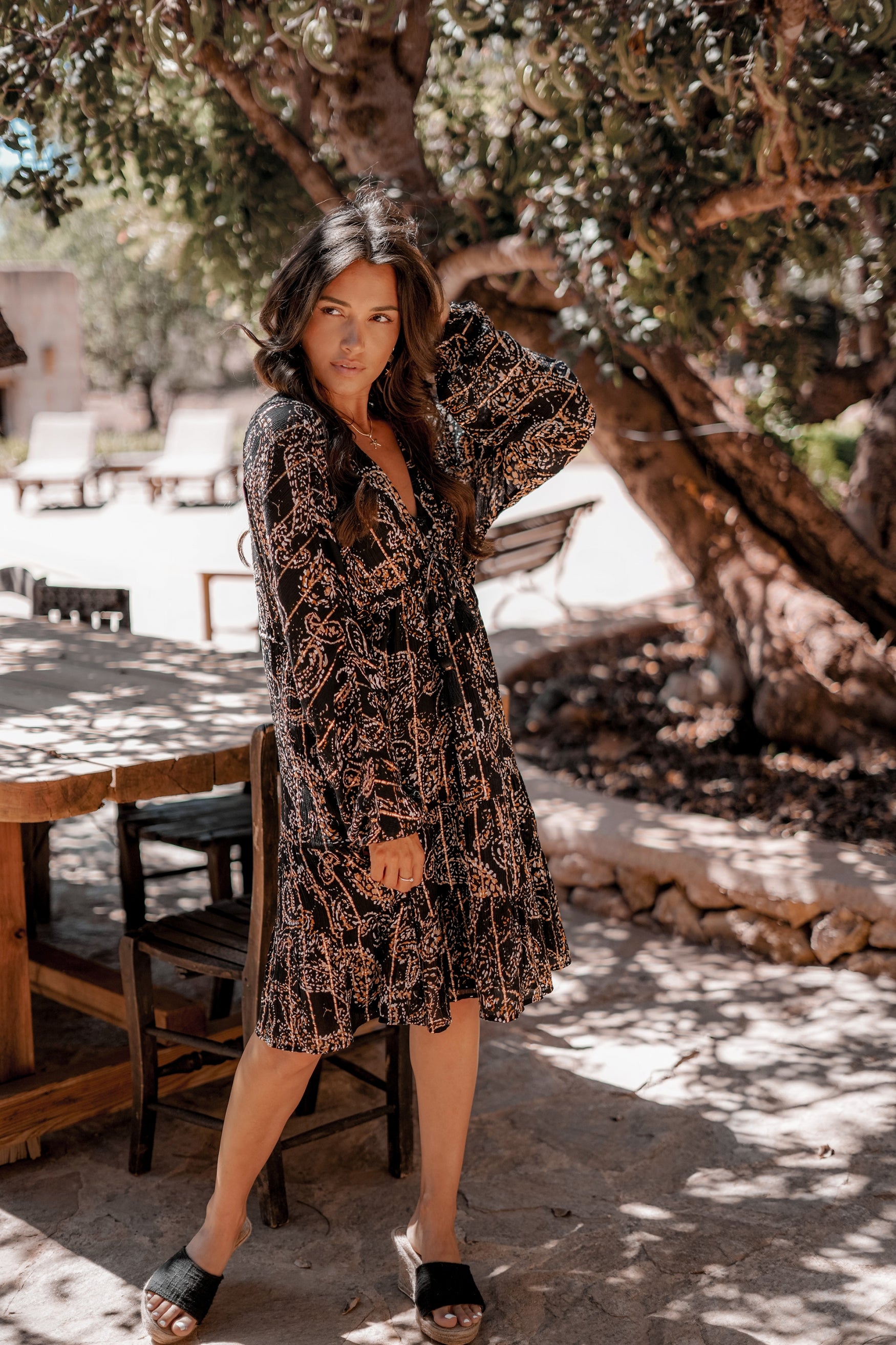 Geef jouw garderobe een update met de Short Dress Mio Paisley Black, ontworpen voor zonnige dagen. Heeft een diepe V-hals, heeft een print, sluit met een knoopsluiting bij de buste, op maat te strikk Draag het met je favoriete accessoires voor een echte brands of Ibiza-look. Laat de zomer maar komen – jij bent er klaar voor.