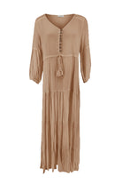 De Dress Gloria Taupe bohemian jurk straalt rust en warmte uit binnen de Golden Glow collectie van ibzmode. De zachte taupe tint vormt een natuurlijke basis die eenvoudig te combineren is. Hier ligt de nadruk op silhouet en beweging.