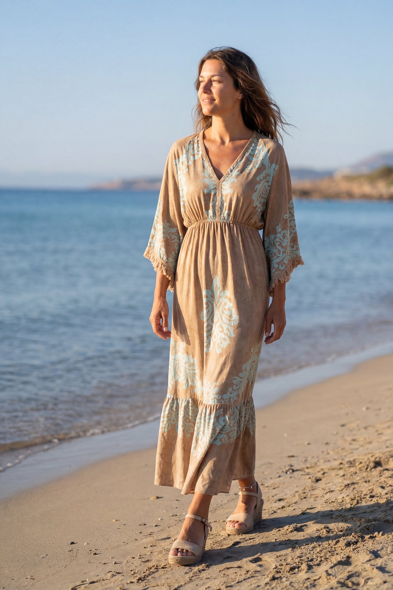 De stof voelt zacht aan op de huid. Tegelijk blijft ze luchtig en koel. Dit maakt de jurk geschikt voor zonnige dagen en lange avonden. De taupe kleur geeft warmte en diepte aan het ontwerp.