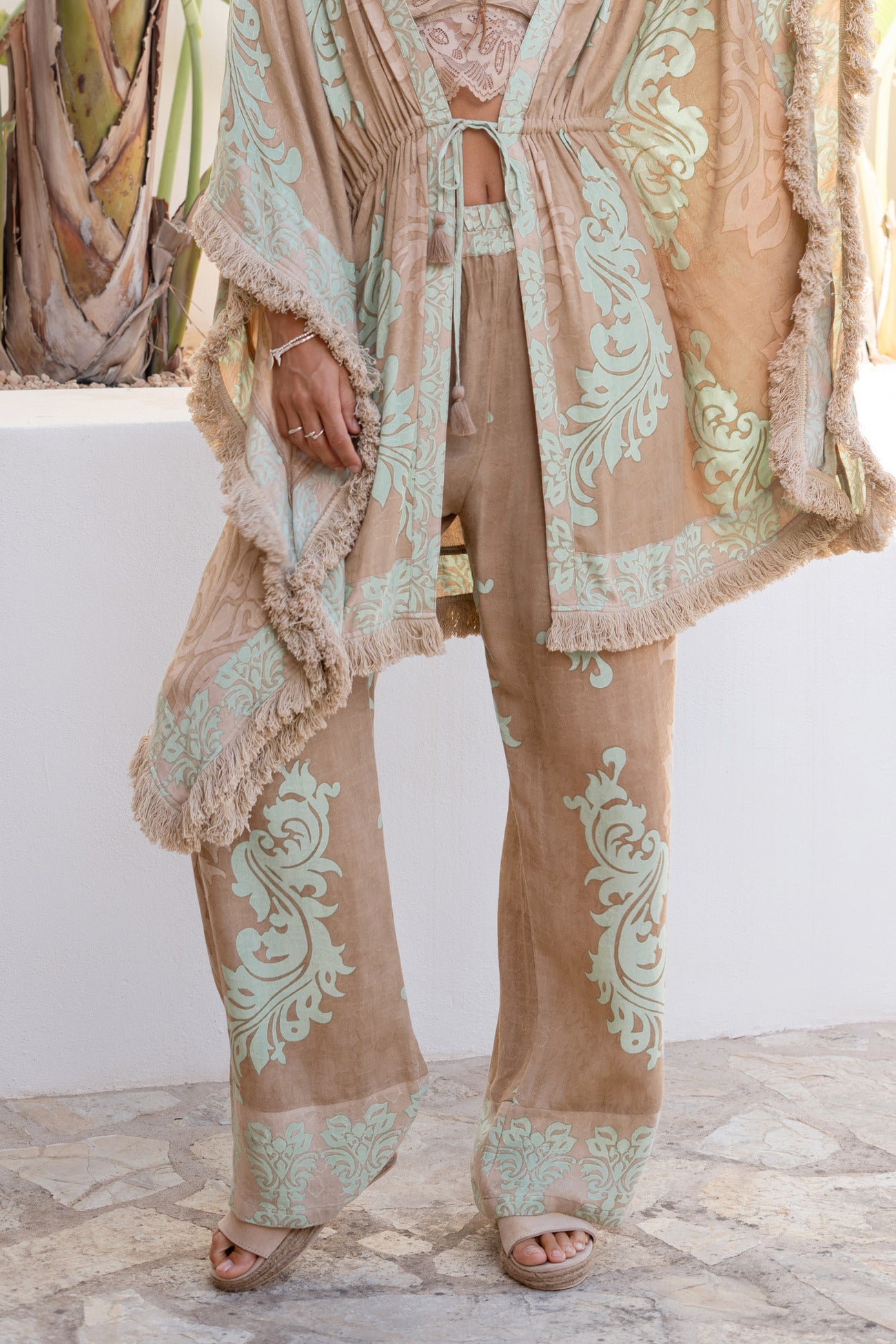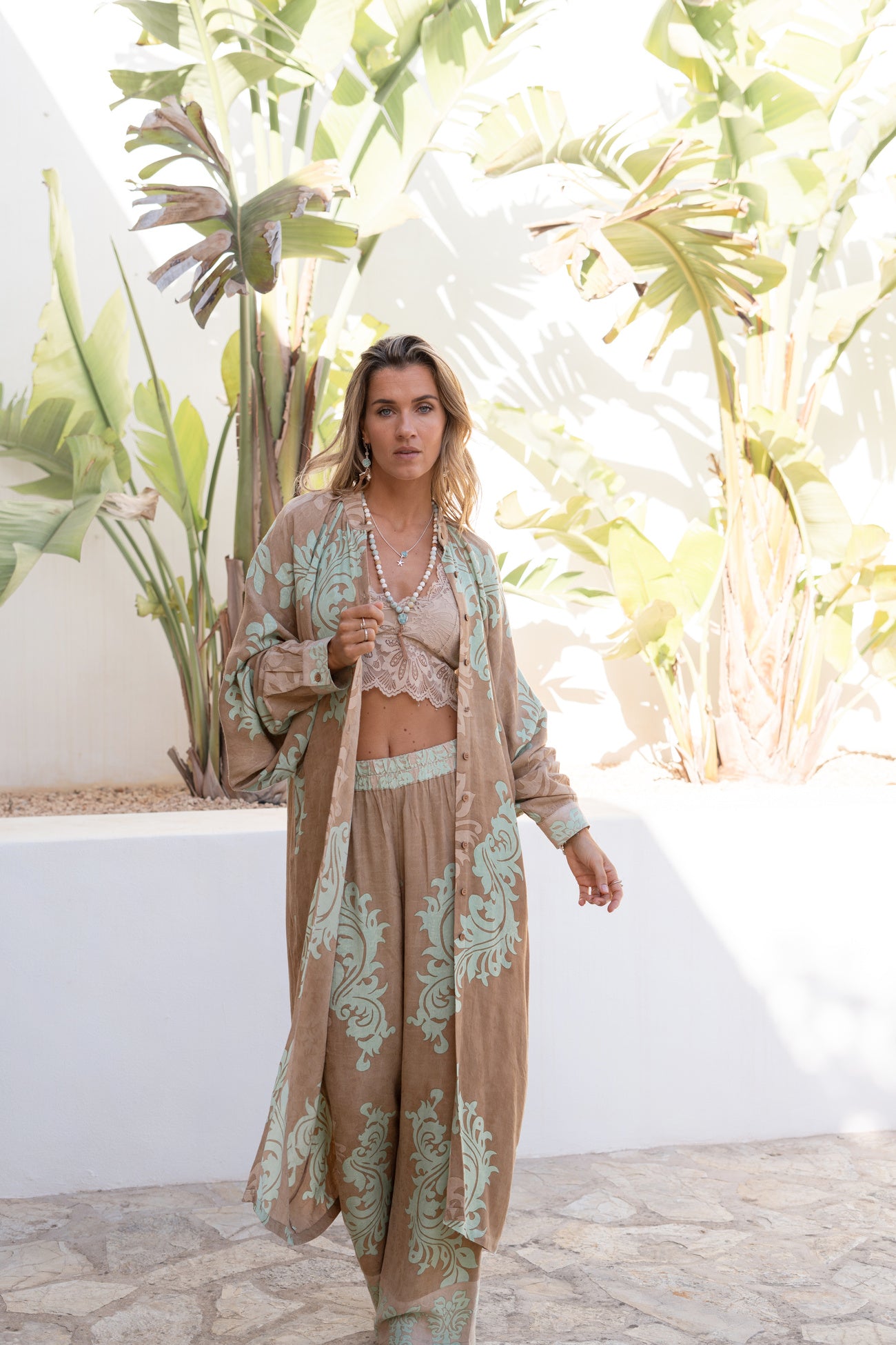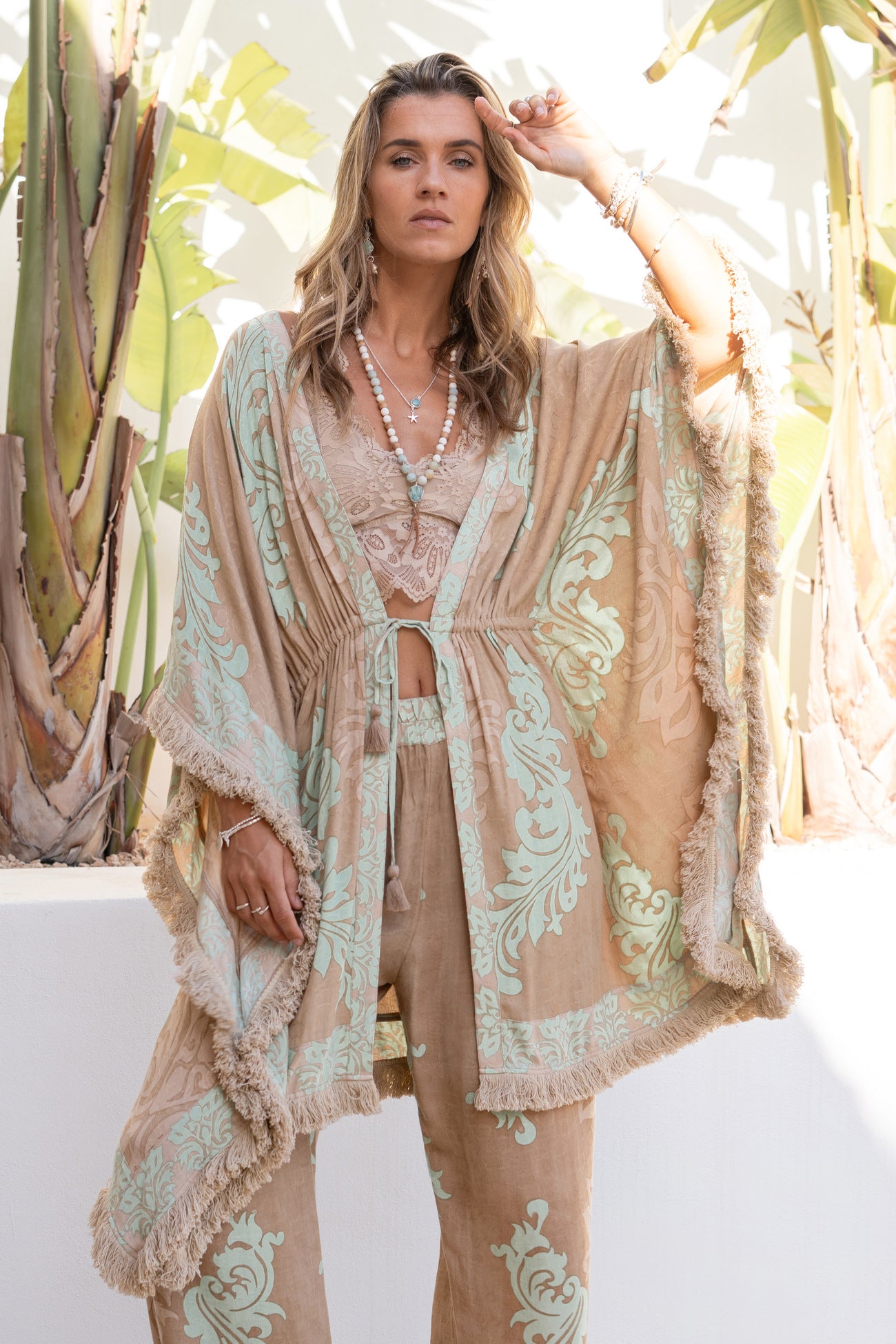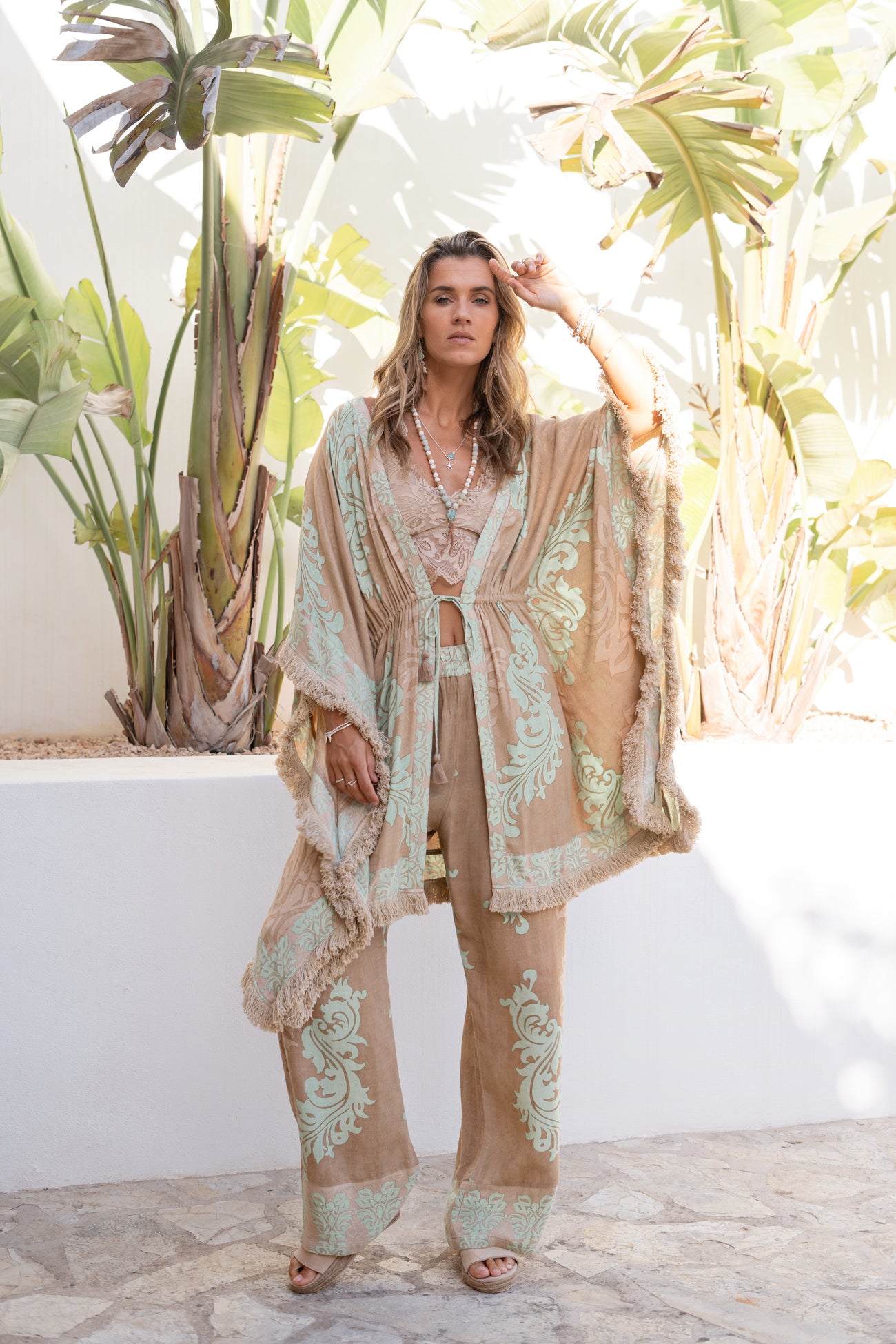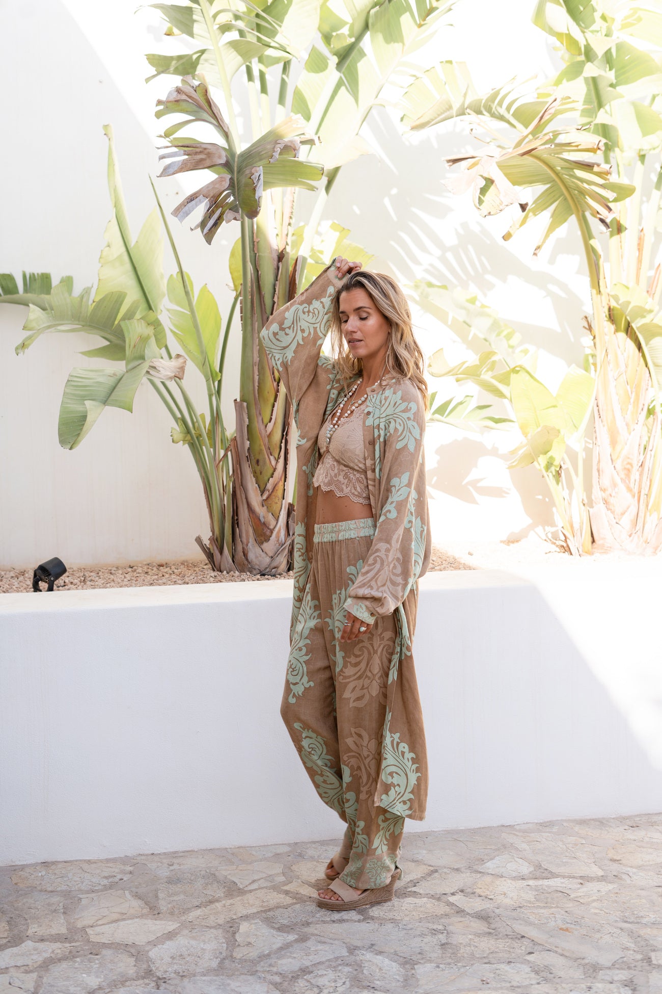 De lange, vloeiende pasvorm beweegt soepel mee. De taupe tint oogt warm en natuurlijk. Hierdoor past de kimono perfect binnen een ibiza mode sfeer. Combineer haar met een bijpassende pantalon of draag haar los over een jurk voor een complete resort look.