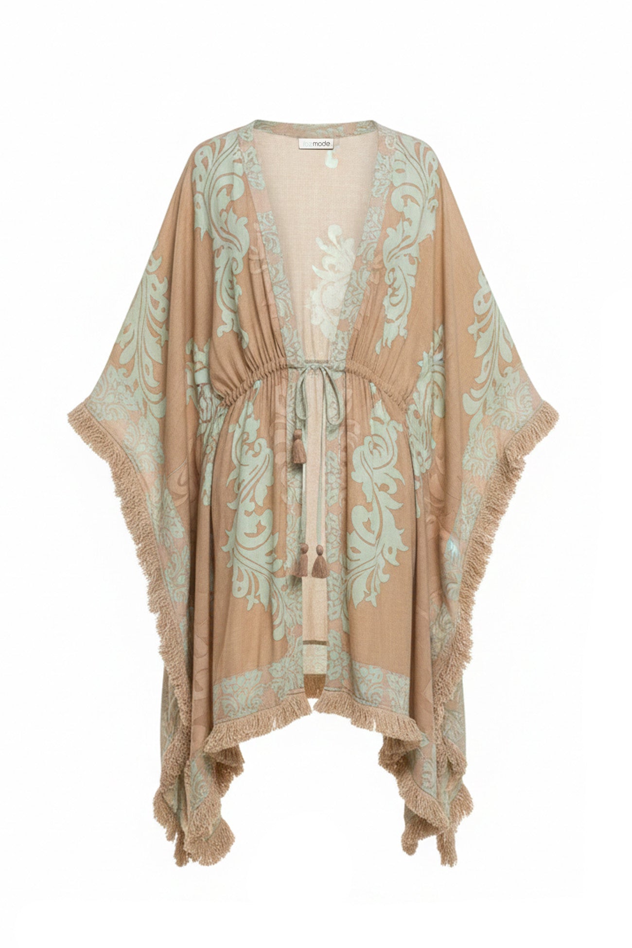 De Kimono Flora Calinda Taupe behoort tot de Baroque Elegance collectie van ibzmode. Dit ontwerp draait om luxe ingeweven Jacquard met verfijnde Baroque ornamenten. Het patroon is niet geprint maar subtiel in de stof geweven. Dat geeft direct diepte en een rijke textuur.