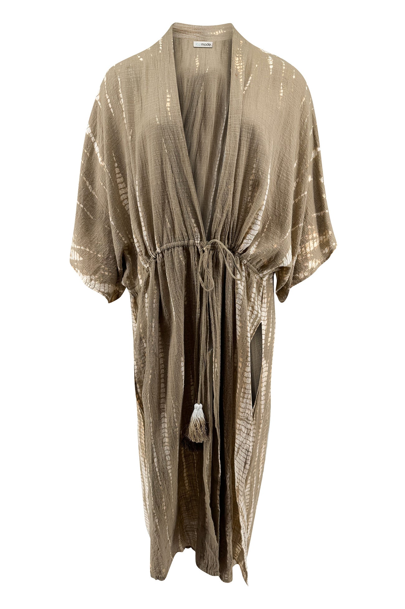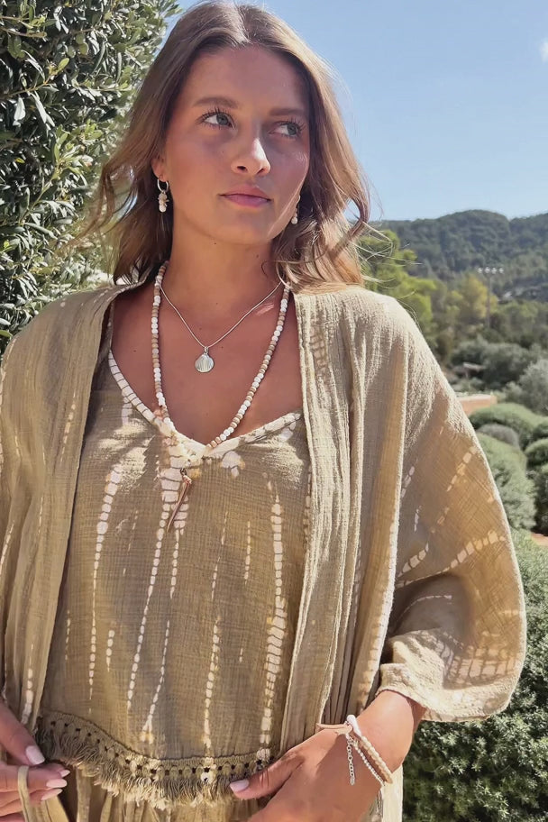 De Kimono Meria Sera is onderdeel van de Sand Stories collectie. Deze katoenen kimono is ontworpen als luchtige laag voor ontspannen zomerdagen. De organische tie-dye print in taupe en ivory geeft een rustige, luxe uitstraling. Daardoor voelt deze kimono direct natuurlijk en verfijnd aan.