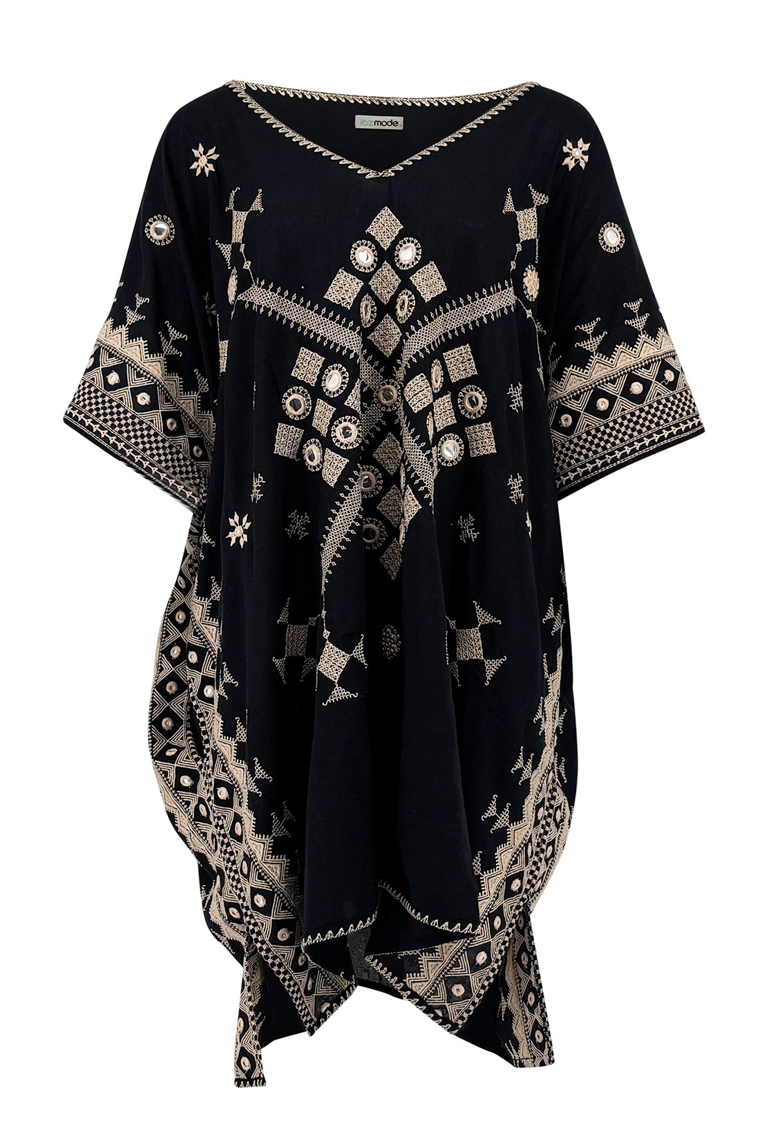 Ten eerste vallen de rijk geborduurde details op. Het handwerk tekent zich af langs hals en boord. Vervolgens vangen de subtiel ingezette spiegeltjes elk straaltje zonlicht. Bij iedere beweging schittert de kaftan zacht mee. Daardoor oogt Hilla Sundara Black als high-end bohemian mode, perfect voor de mooiste beachclubs.
