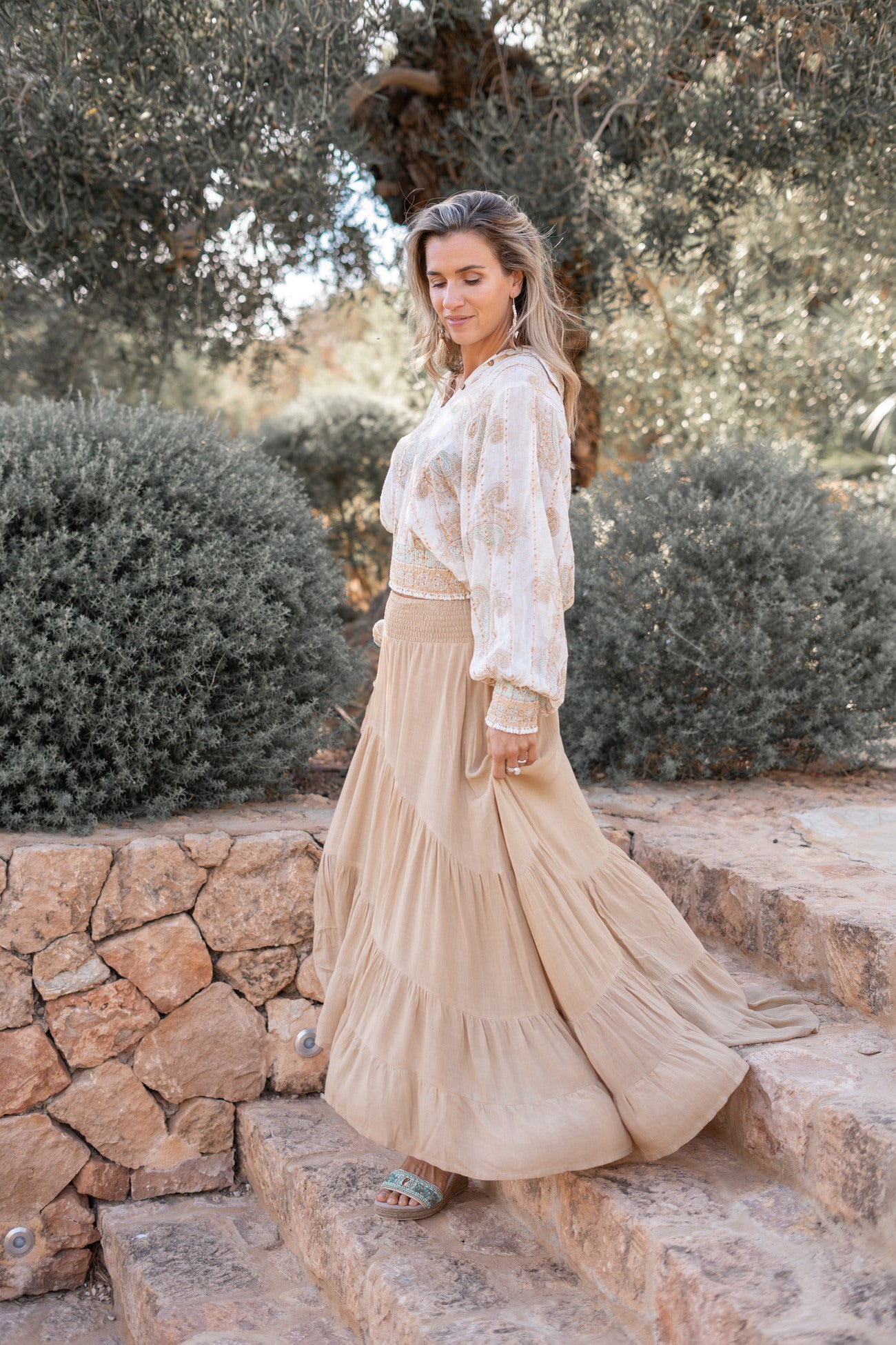 De warme taupekleur versterkt de natuurlijke ibiza sfeer van het seizoen. Overdag oogt de rok rustig en zacht. In de avond blijft het silhouet krachtig door de eenvoudige tint en de vloeiende pasvorm. De Skirt Santi Taupe bohemian rok combineert moeiteloos met een paisley top of een lichte blouse in mint of ivory.