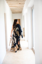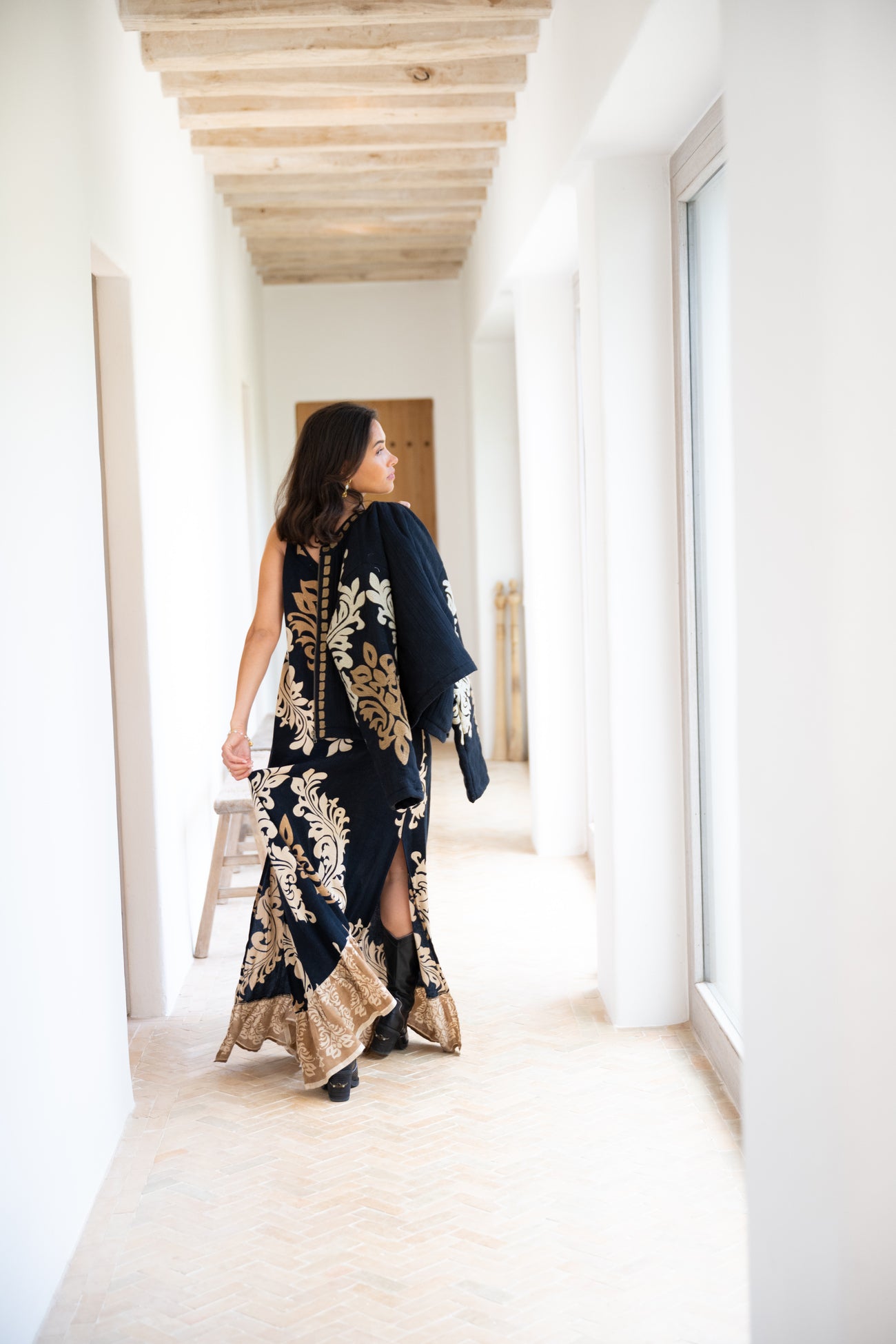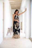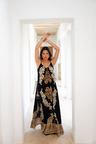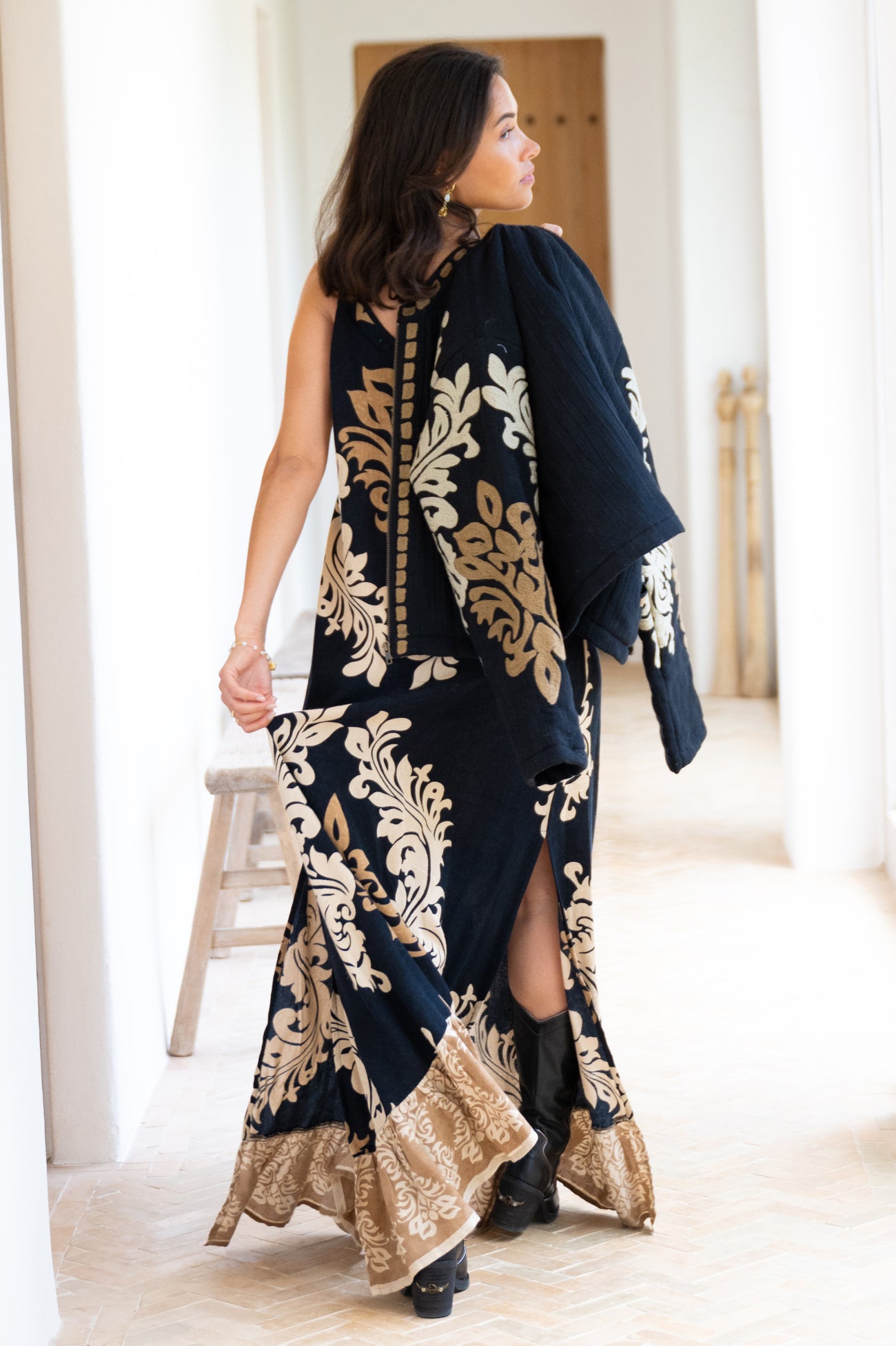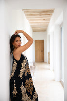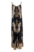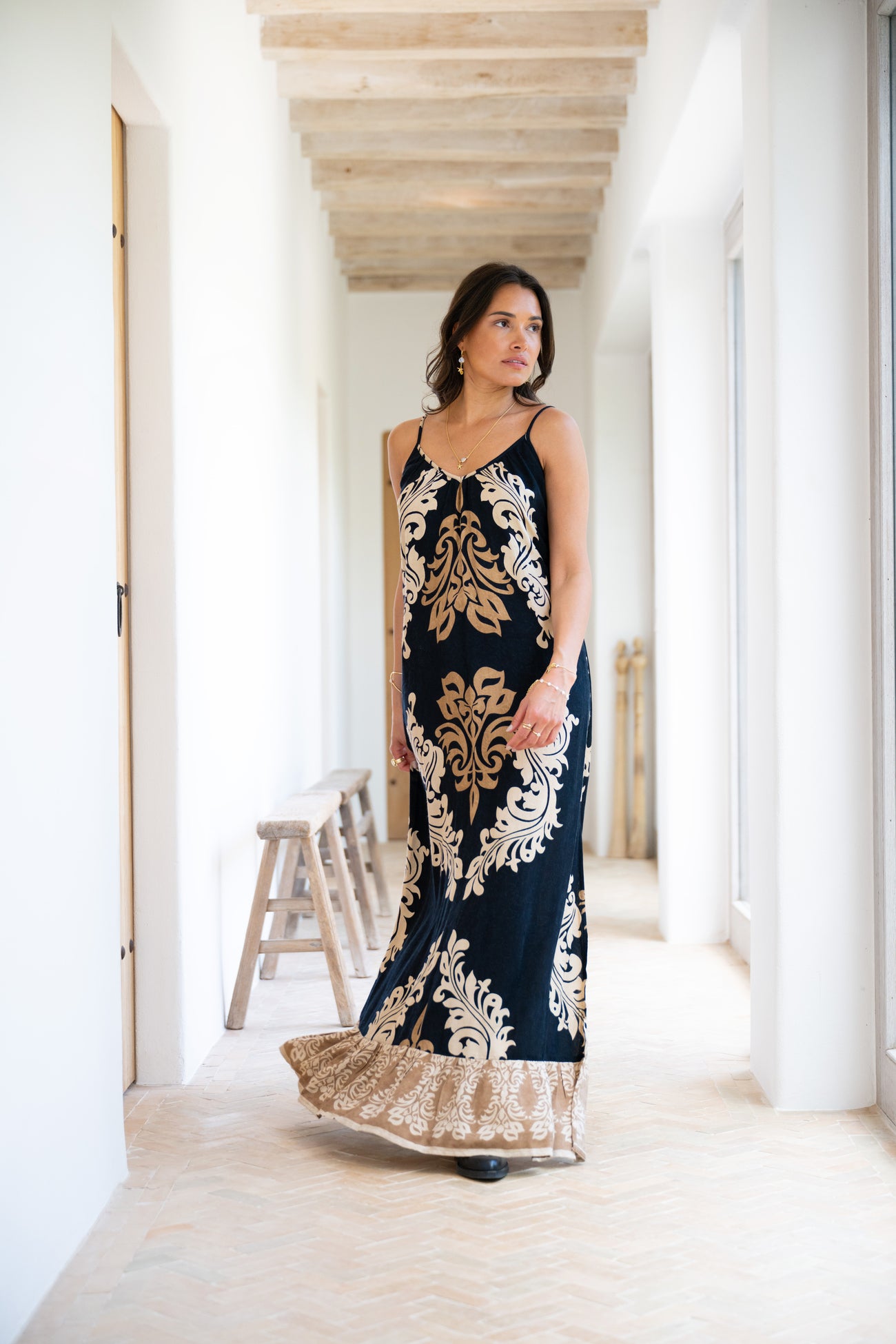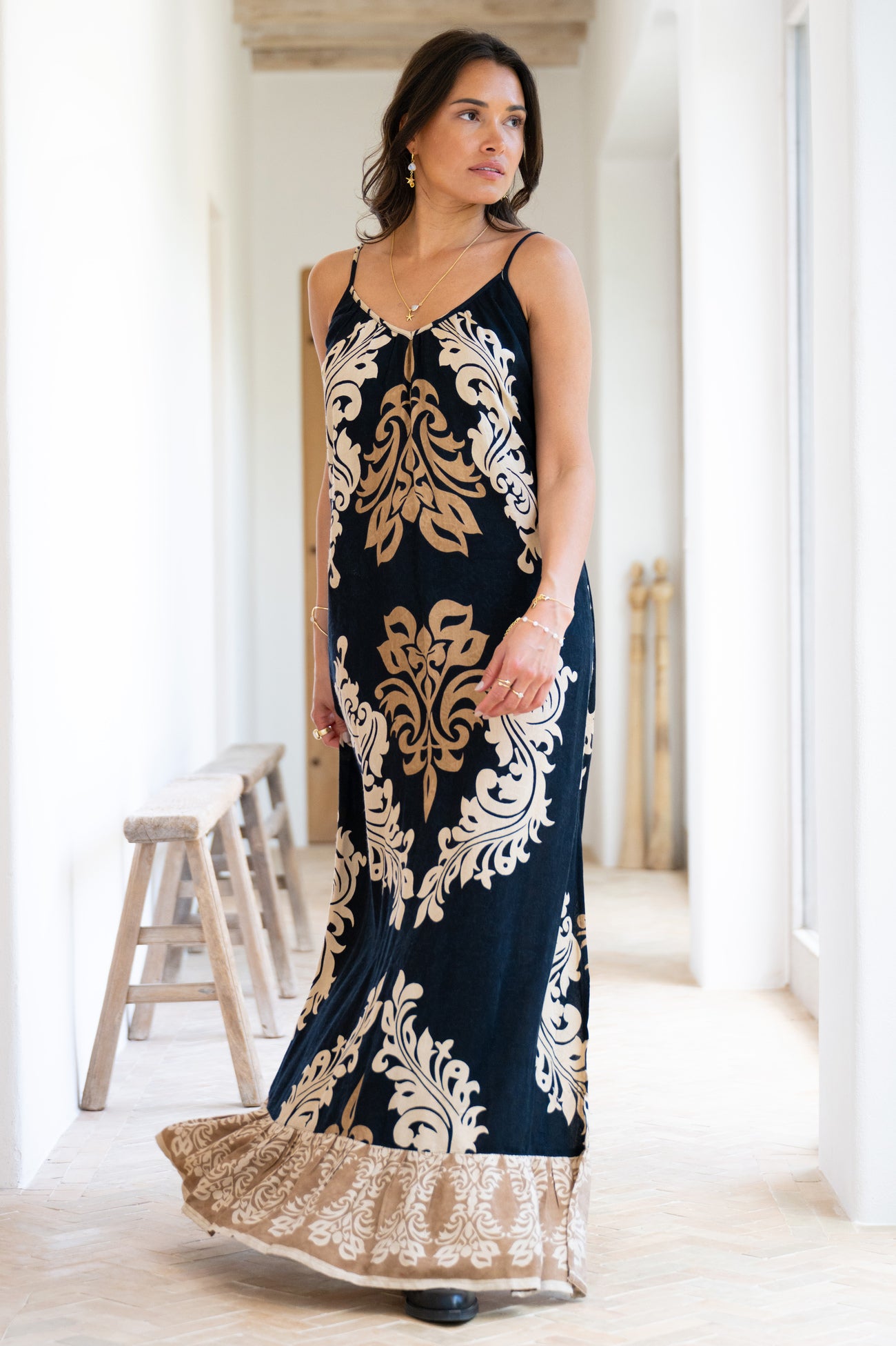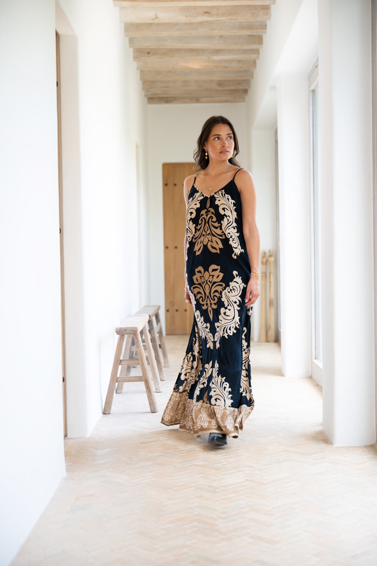 Product gegevens: Lange jurk met dunne schouderbandjes en baroque dessin