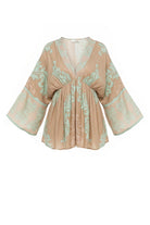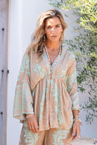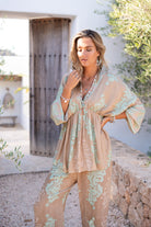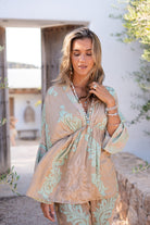 Deze luxe top dames combineert perfect met de bijpassende pantalon. Zo ontstaat een complete resort wear dames set. Ook los gedragen behoudt de top haar rijke uitstraling. De taupe kleur past moeiteloos binnen een ibiza mode setting.