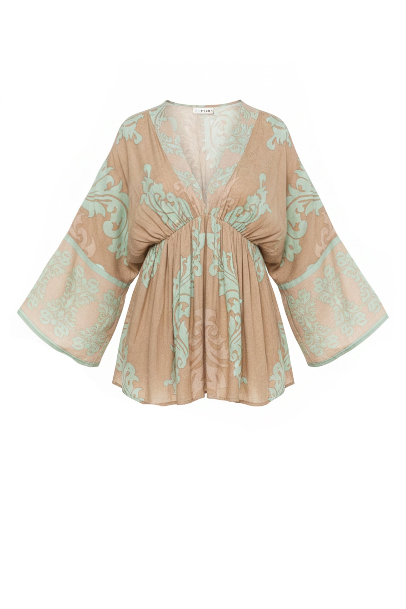 De Top Celina Calinda Taupe straalt rust en diepte uit. Dit ontwerp behoort tot de Baroque Elegance collectie van ibzmode. De Jacquard weving bevat verfijnde Baroque ornamenten. De structuur geeft direct een luxe gevoel.