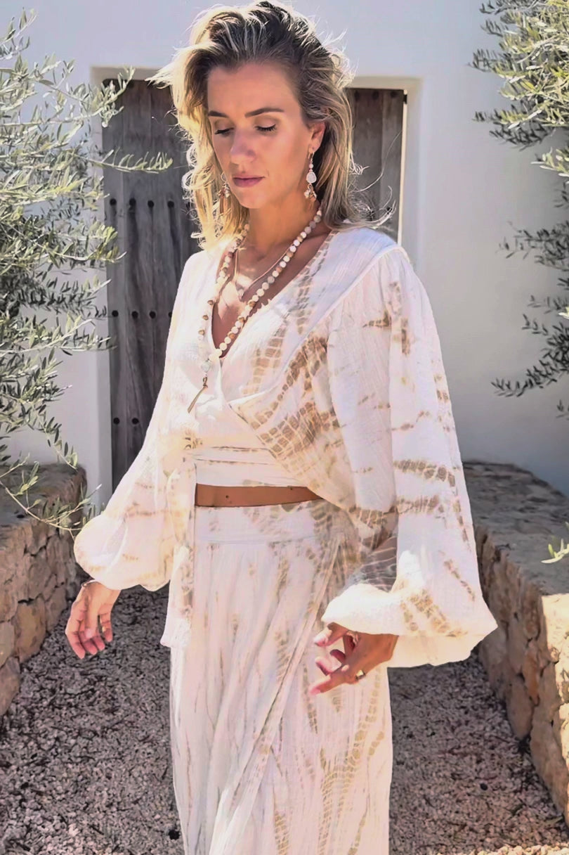 De Wrap Top Alma Sera is onderdeel van de Sand Stories collectie. Deze tie dye top is ontworpen voor zomerse dagen waarop comfort en stijl samenkomen. De organische tie-dye print in zacht taupe en fris ivory zorgt voor een rustige, luxe uitstraling. Daardoor voelt deze top direct natuurlijk en vrouwelijk aan.