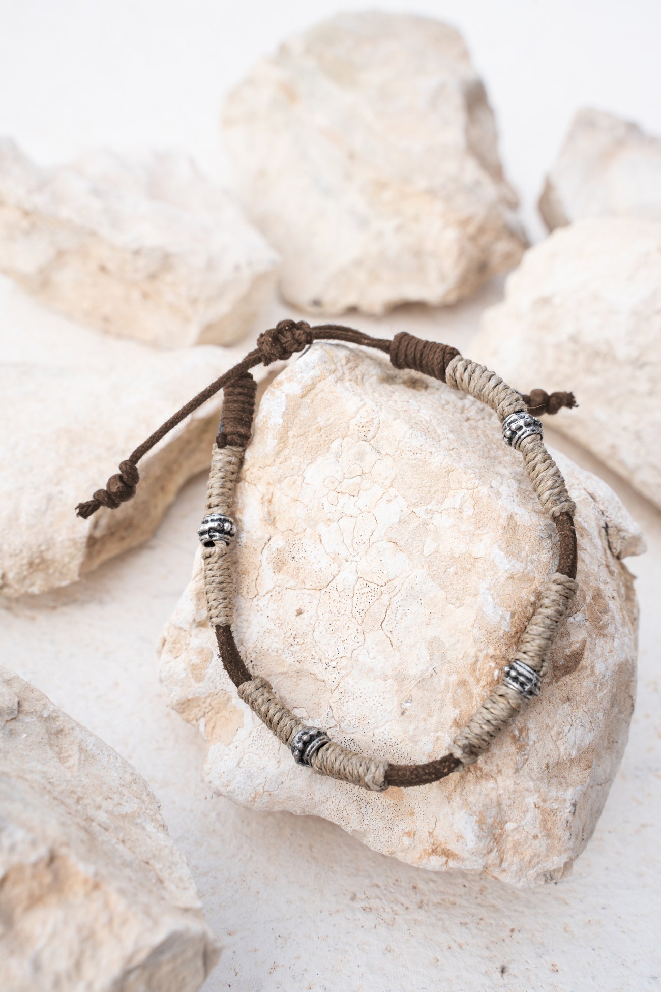 Product gegevens: Verstelbare armband gemaakt van Leer, Zink en Jute. Wordt geleverd in een mooie jute verpakking. Draag dit bij voorkeur niet in water of onder de douche!