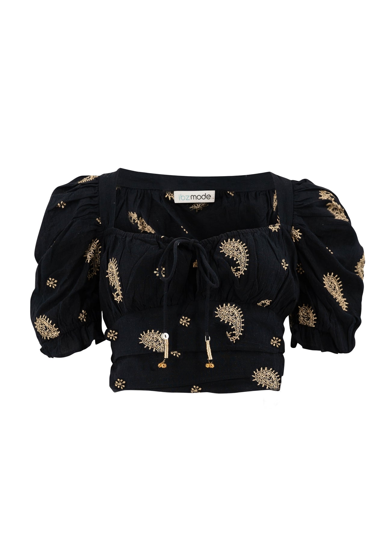 Product gegevens: Heeft een vierkante halslijn die gestrikt kan worden, kraaltjes onderaan de touwtjes, heeft pofmouwen, gouden geborduurde details