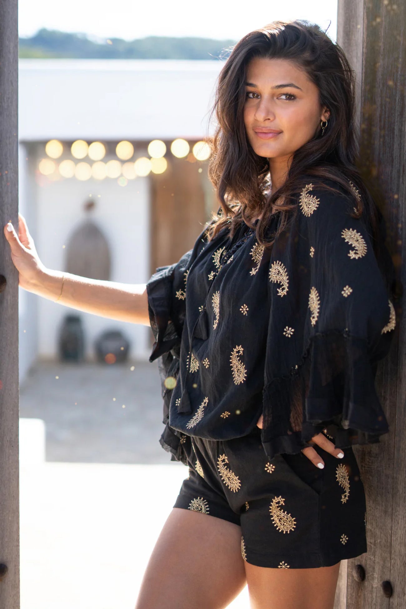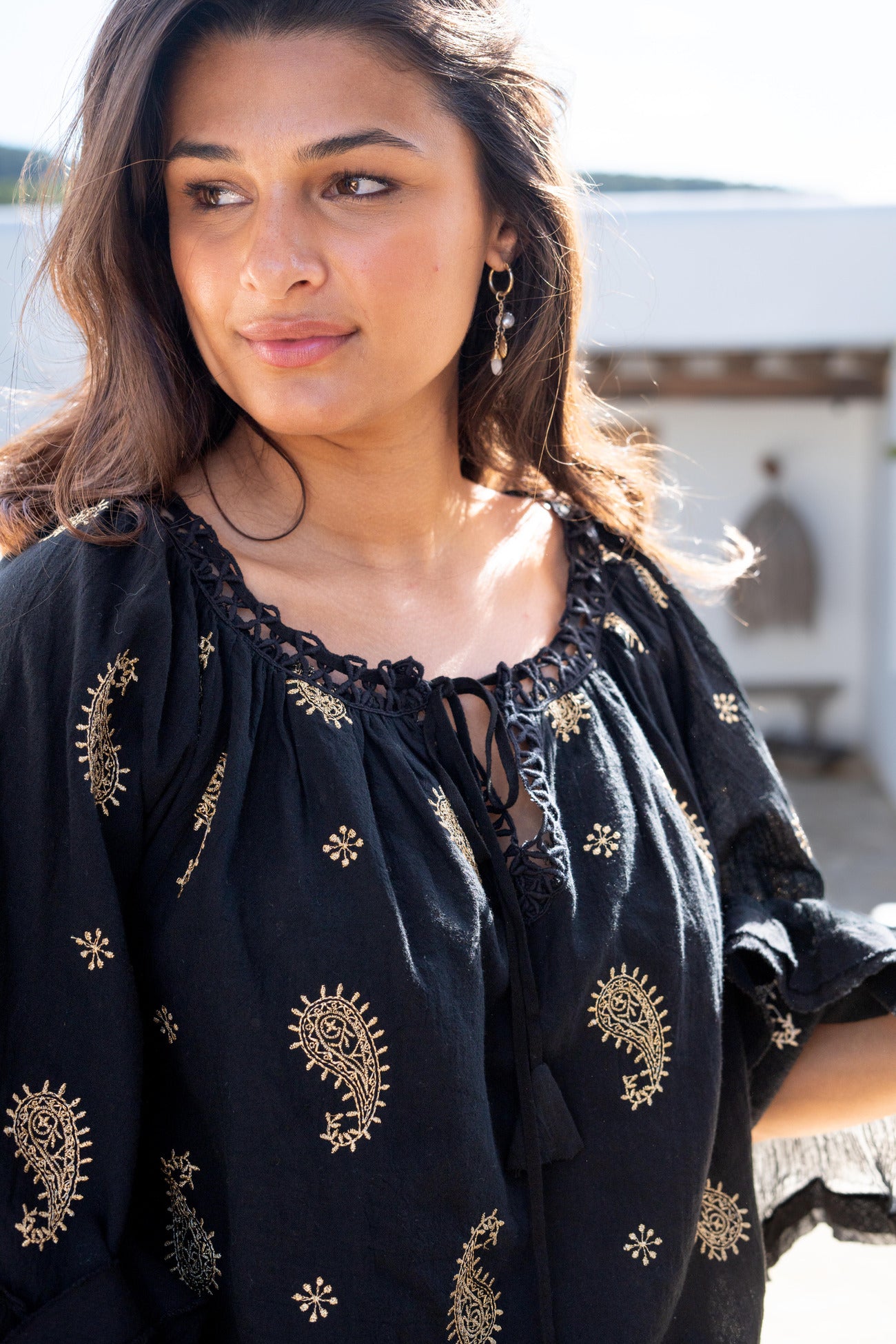 Deze Blouse Yira Esencia Black van ibzmode in het black ademt Ibiza vibes. Heeft een ronde hals die gestrikt kan worden, heeft trompet mouwen, gouden geborduurde details Gemaakt van 100% katoen, licht en comfortabel voor warme dagen. Bestel snel en geniet van de bohemian lifestyle, elke dag opnieuw.